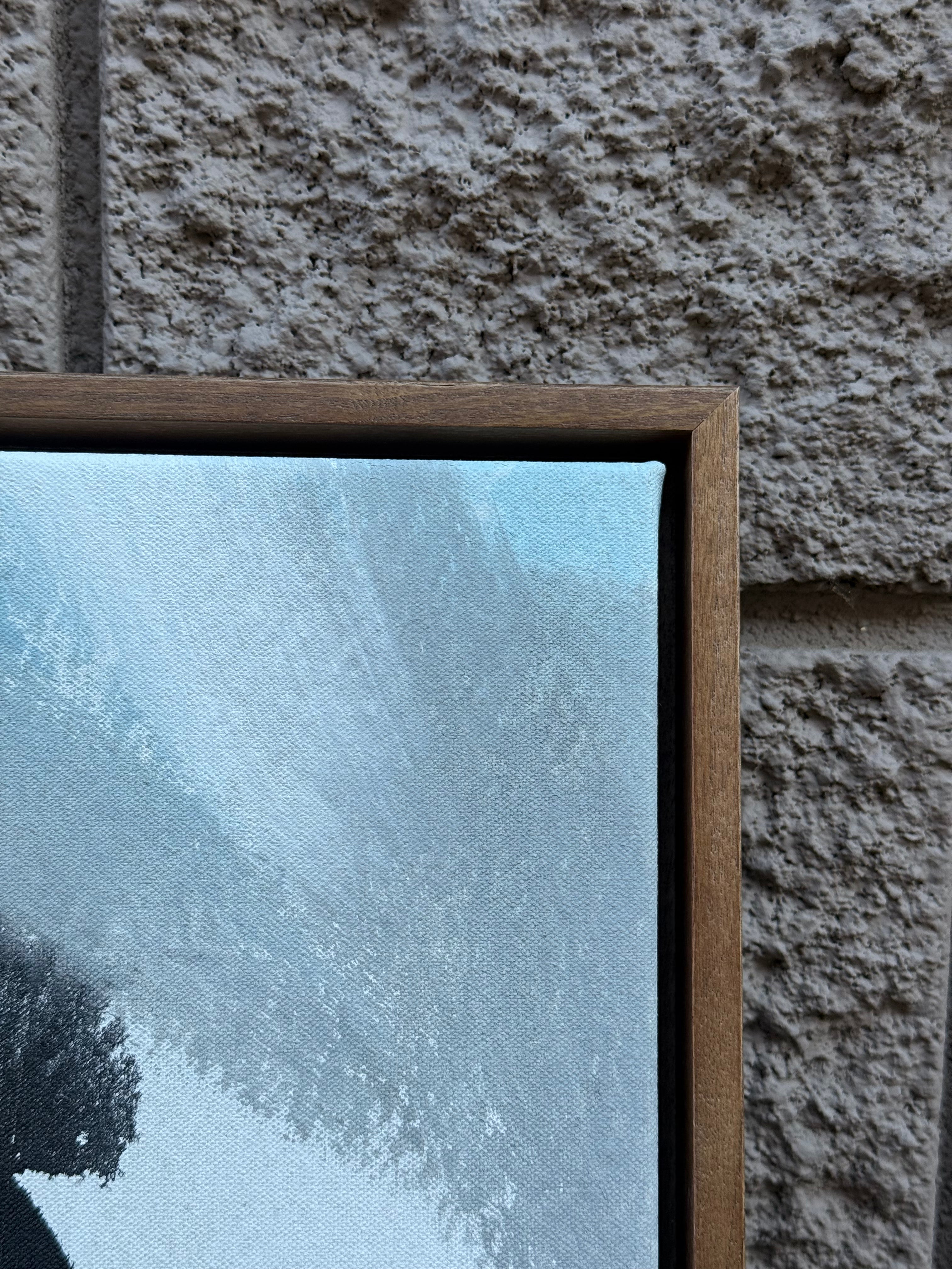 Contemporary abstract canvas artwork featuring expressive brushstrokes in ochre, rust, deep black, teal, and soft blue tones. The composition blends layered color fields with organic shapes, creating depth and movement against a light background. Subtle texture from the canvas surface enhances the painterly quality of the piece. Professionally reframed in a slim wood frame with a warm natural finish, this artwork is ready to hang with secure wire hardware on the reverse.