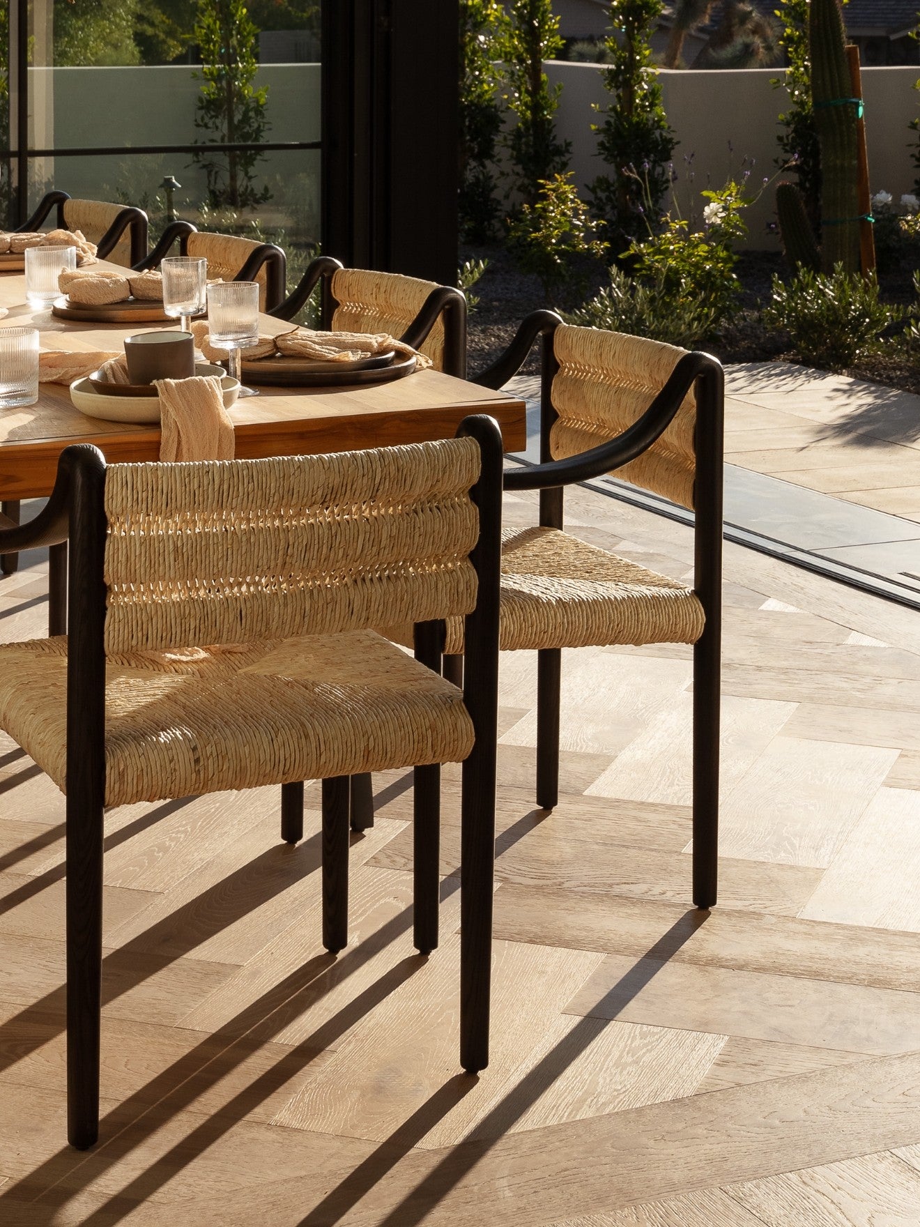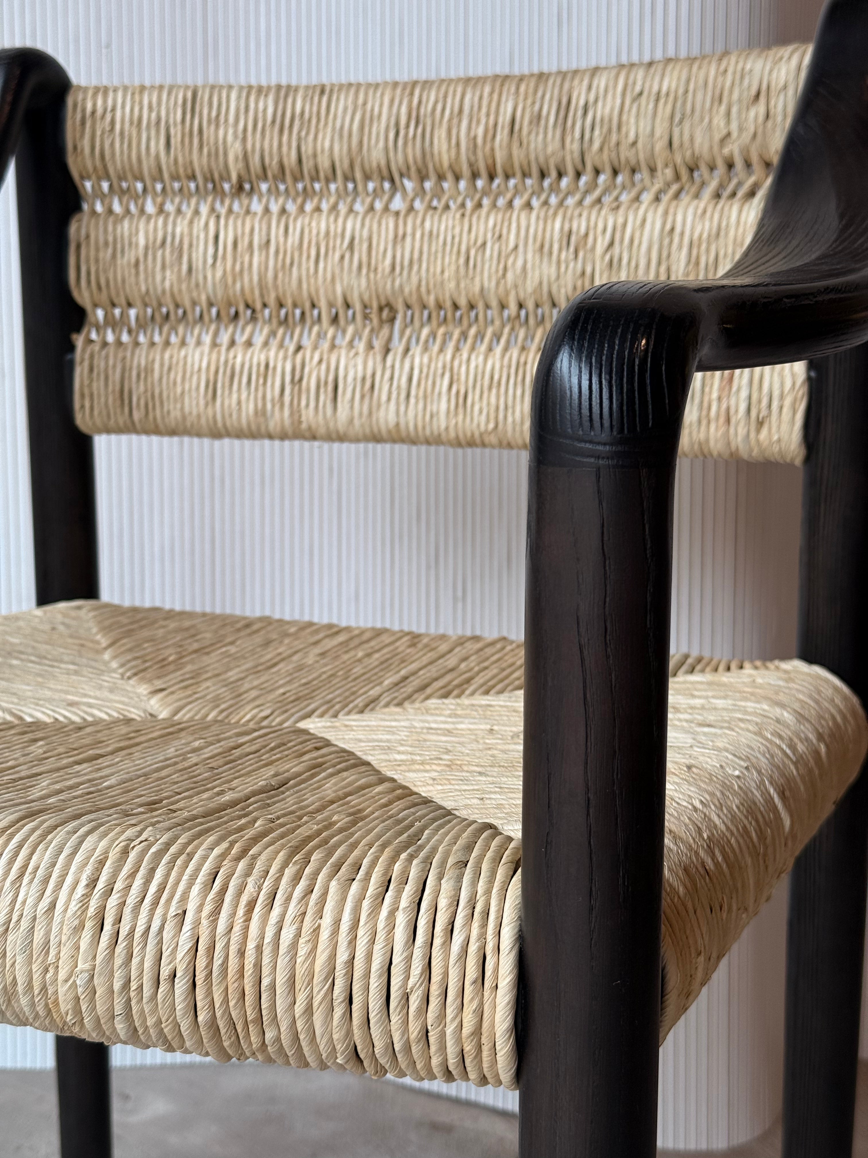 Made of solid ashwood finished with wire brushing and a matte ebonized finish, the dining chair stands on slim turned legs that flow into the gracefully curved, handcarved arms.