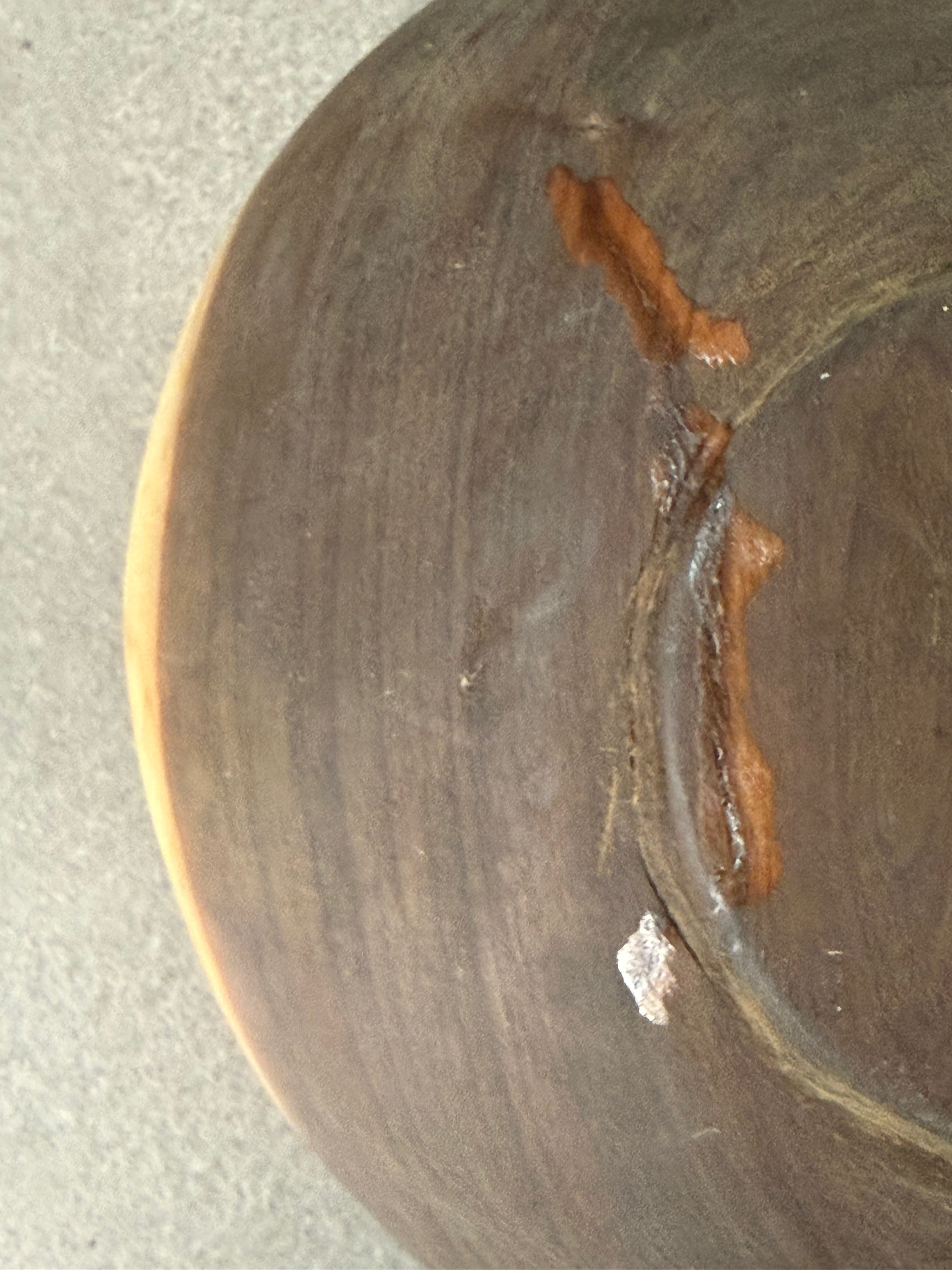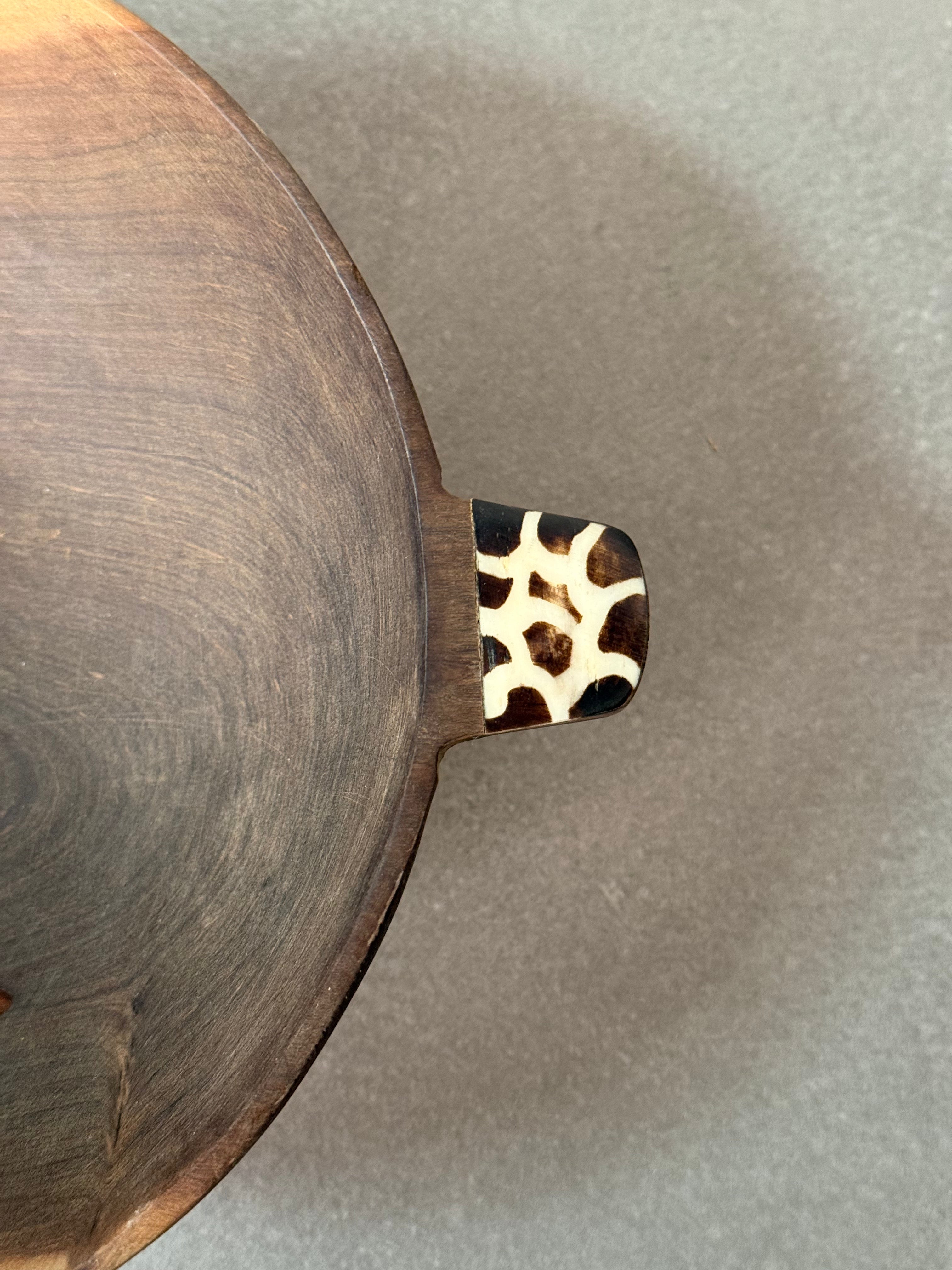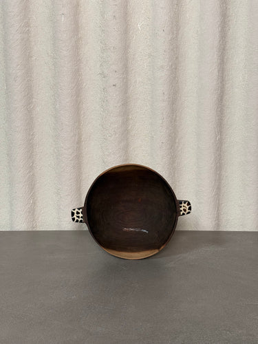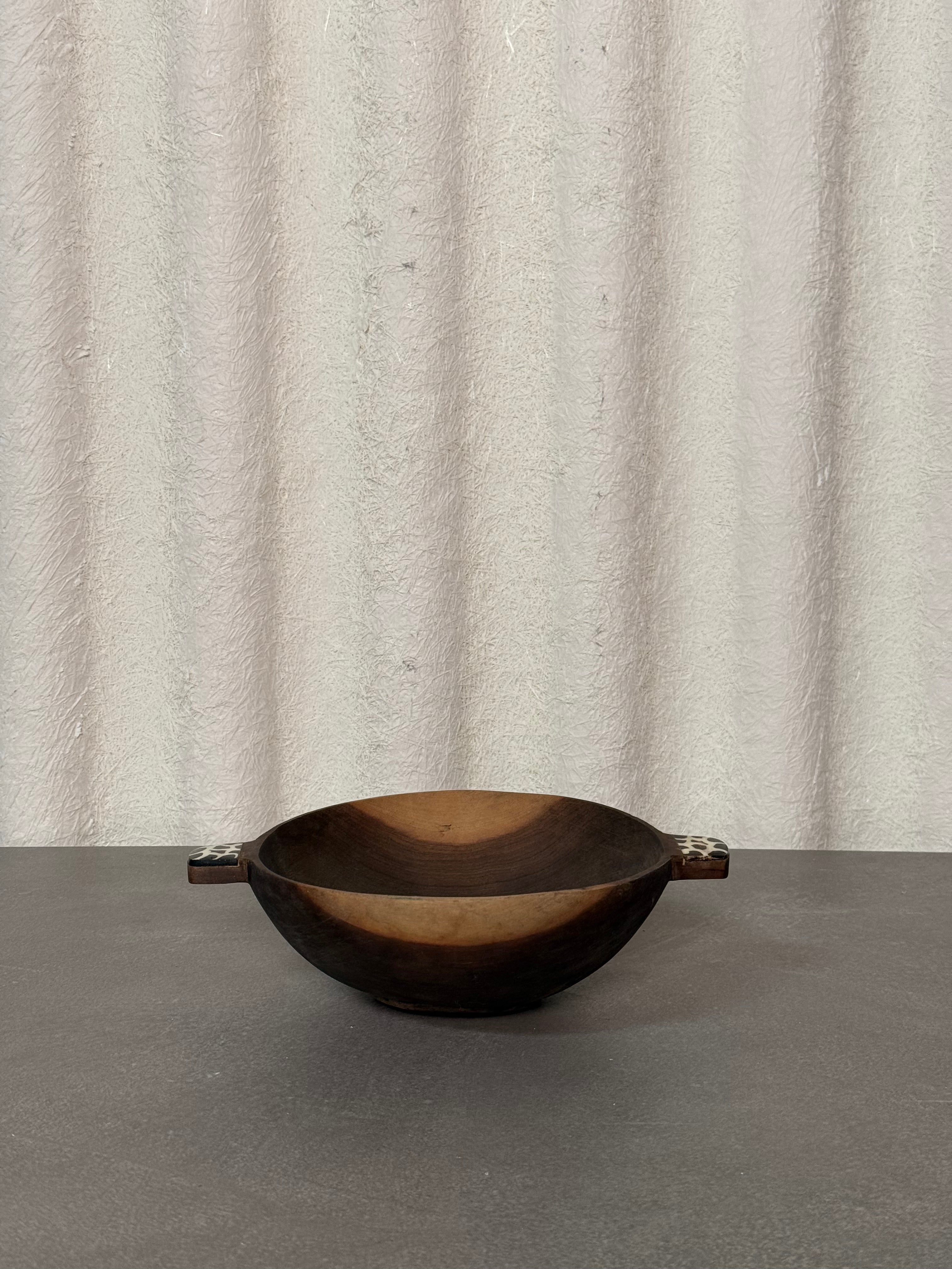 Hand-carved wooden bowl featuring contrasting dark and light wood tones and geometric painted handles. A functional sculptural piece that combines traditional craftsmanship with a modern organic aesthetic.