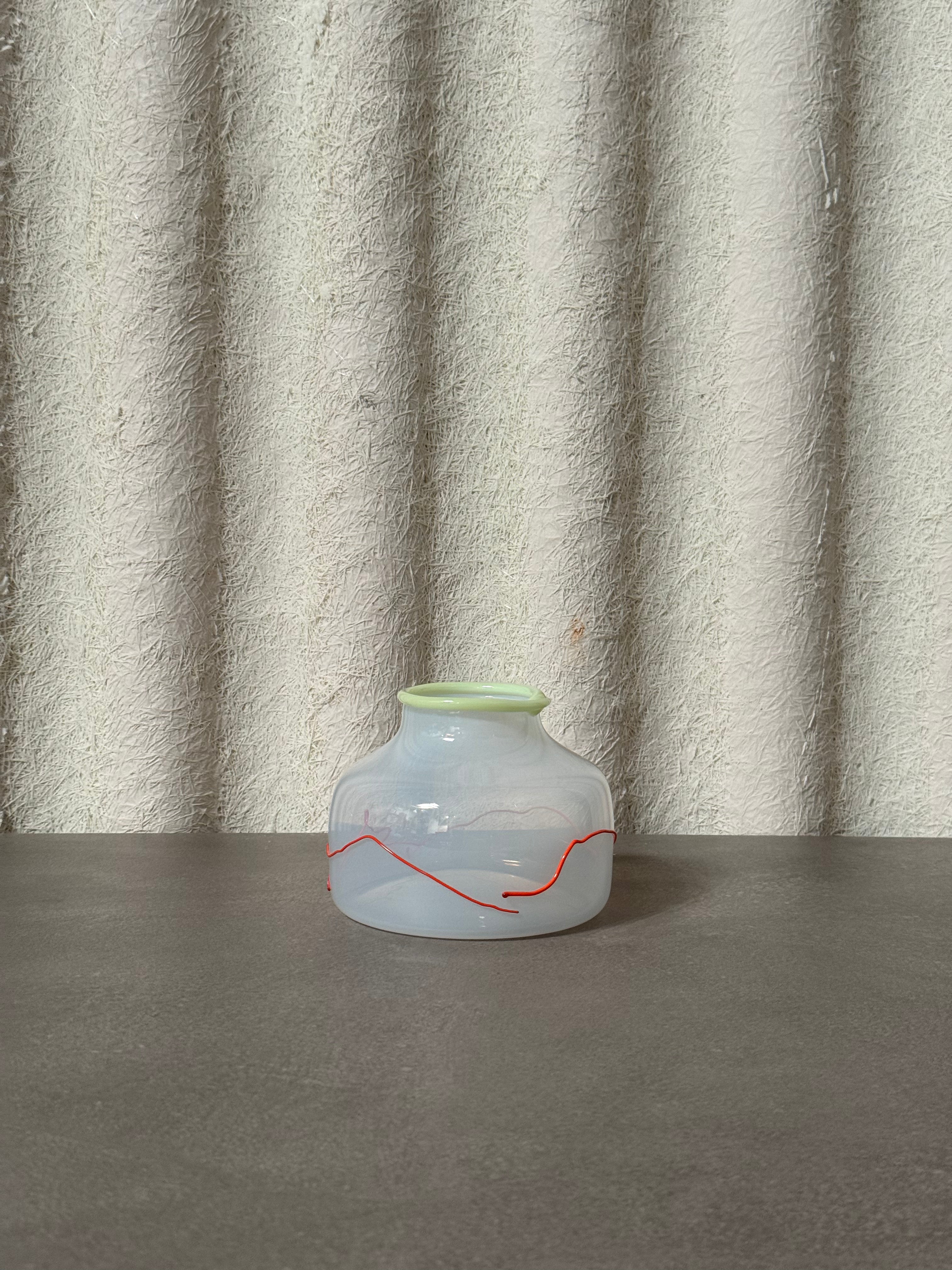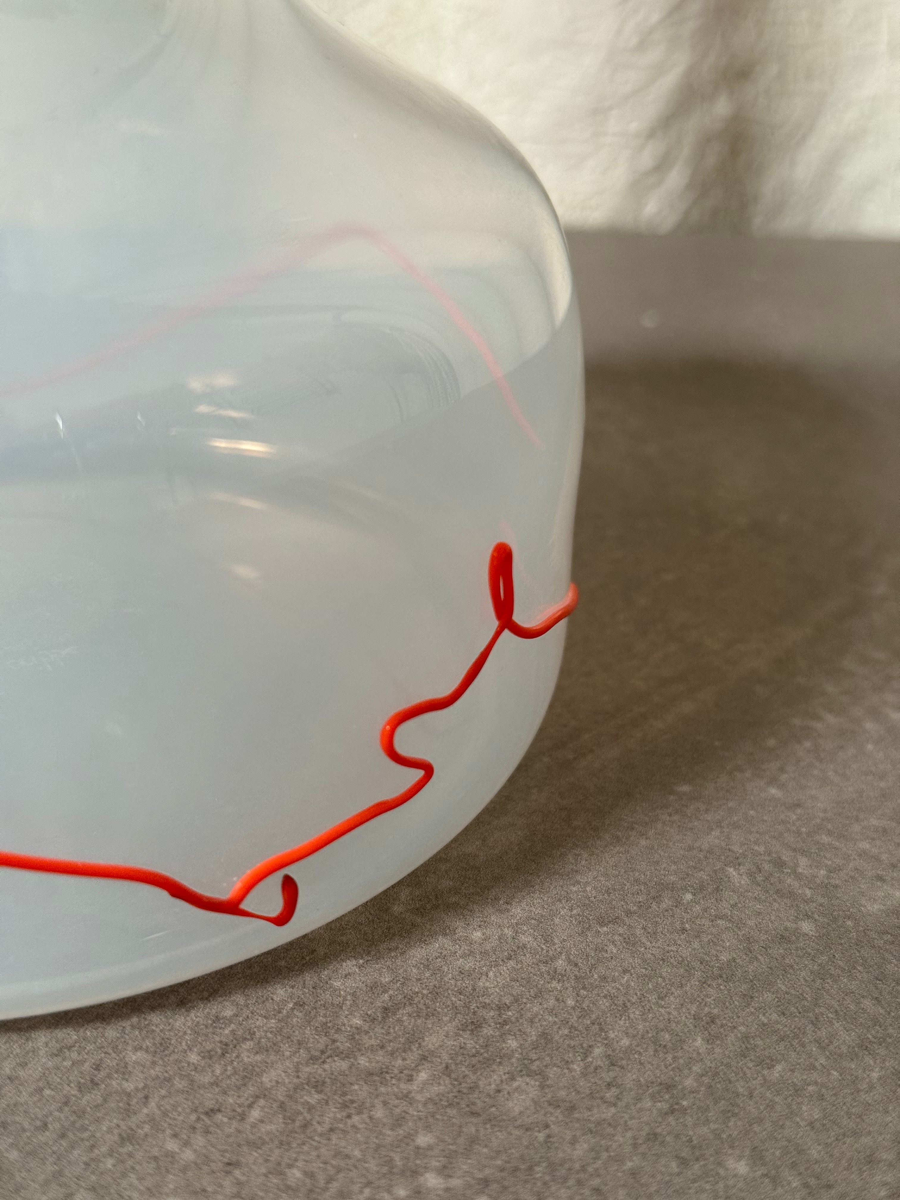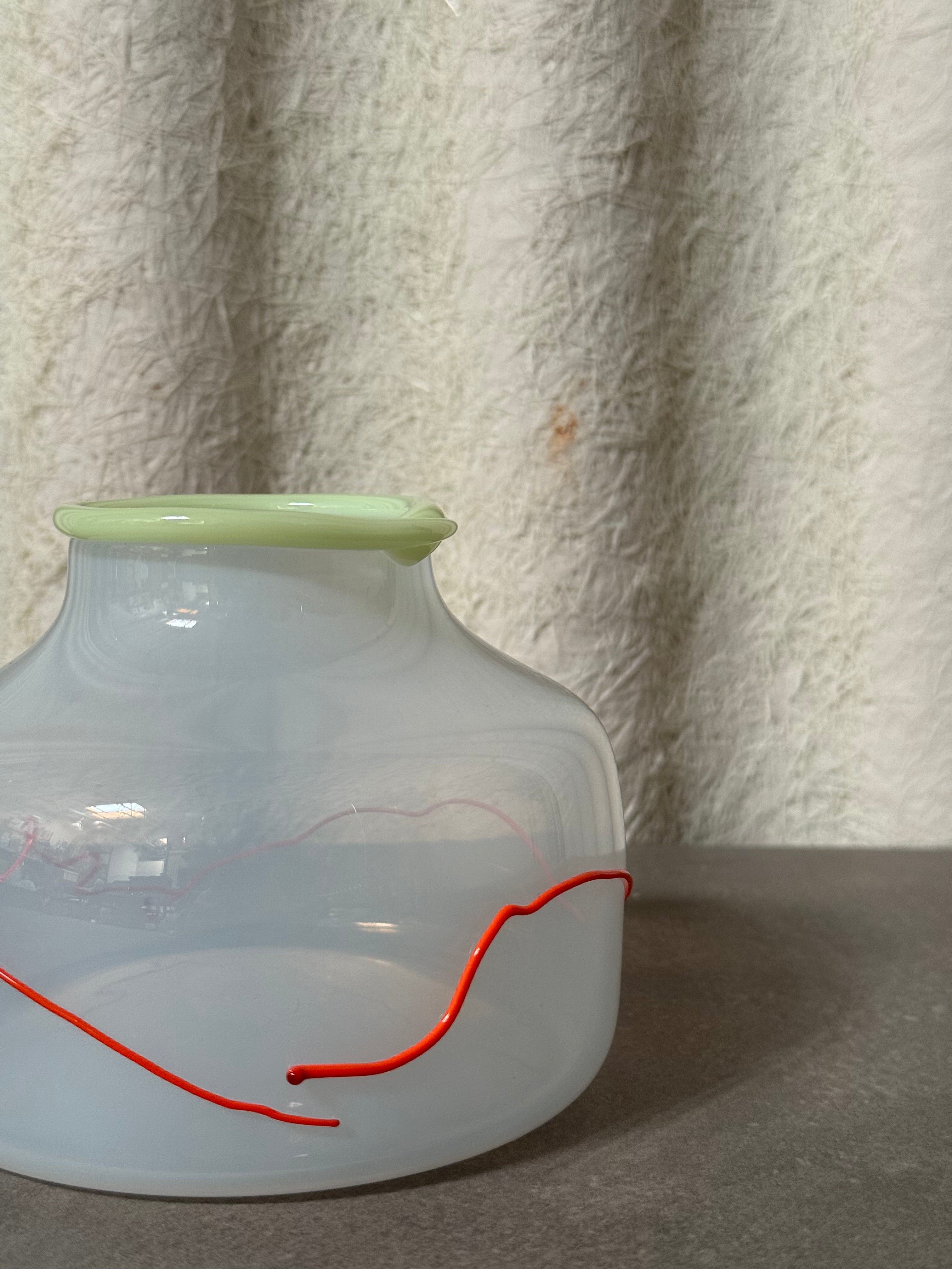 A luminous piece of Scandinavian glasswork handblown in Norway by the artist Cribbe Eriksson, it features a milky white body with a translucent glow, encircled by a vivid red line and topped with a soft green rim.