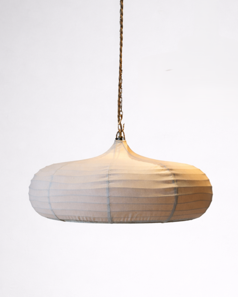 Wrapped in finely woven linen, these vintage French pendants diffuse light into a warm, ambient glow that feels both intimate and architectural.