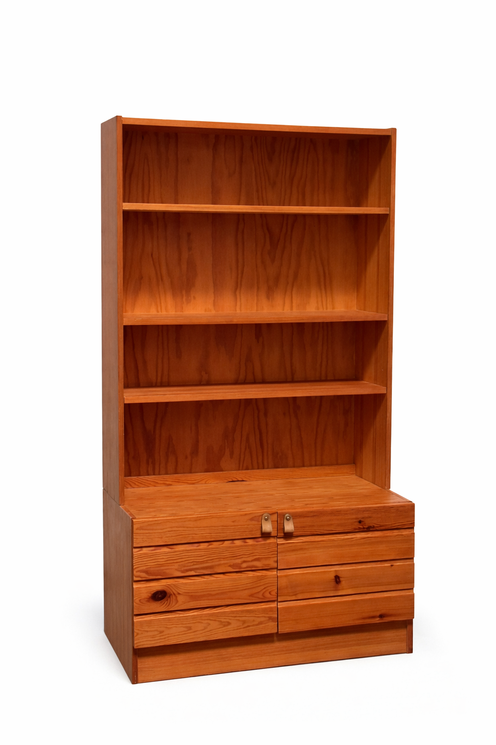 Wood bookcase featuring an upper open shelving unit and lower cabinet storage in a warm-toned pine. The top section includes three fixed shelves within a clean, rectangular frame, while the base offers concealed storage behind paneled doors with simple hardware.