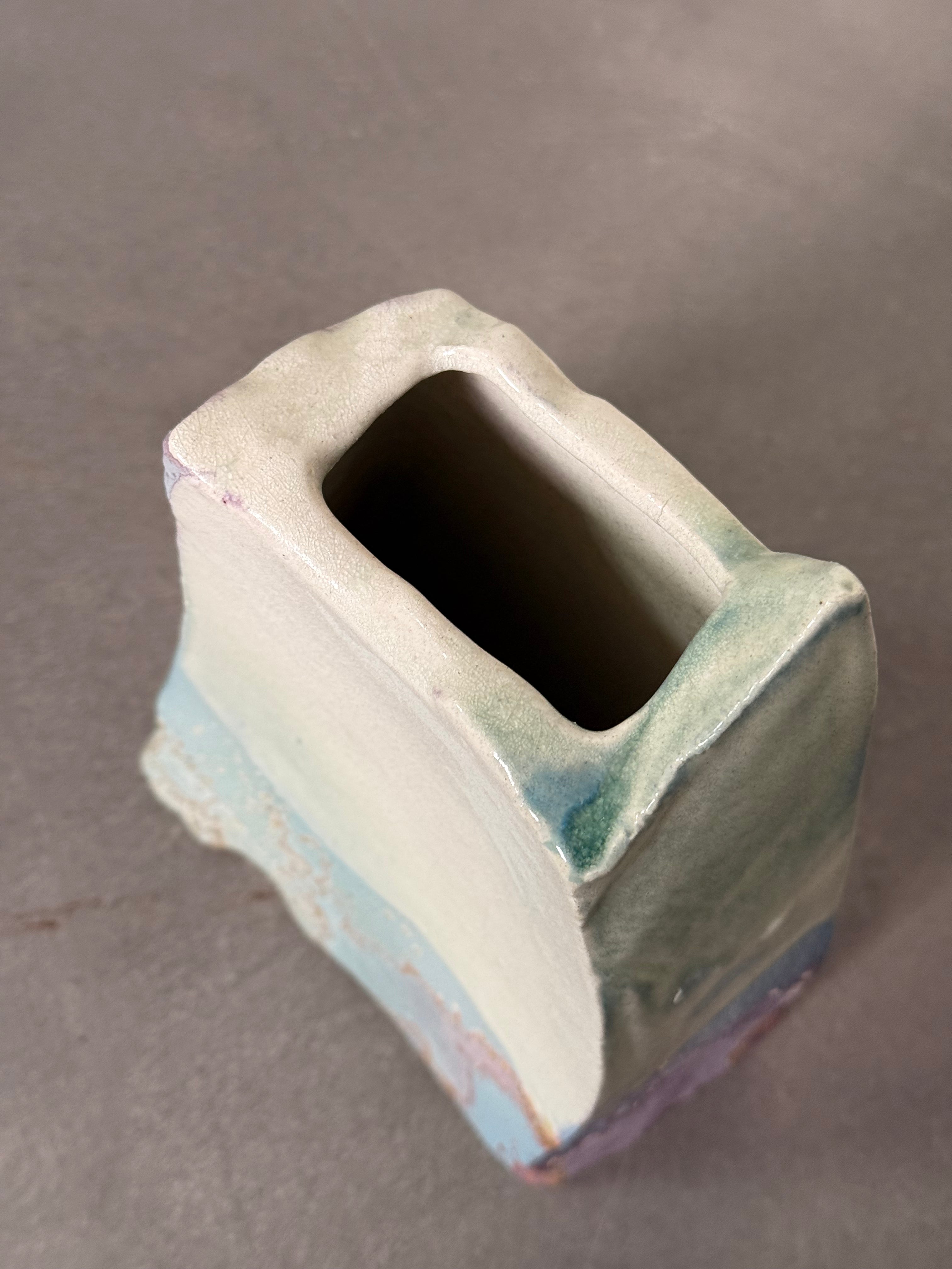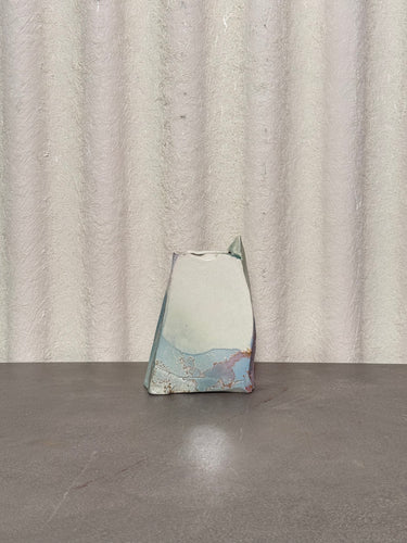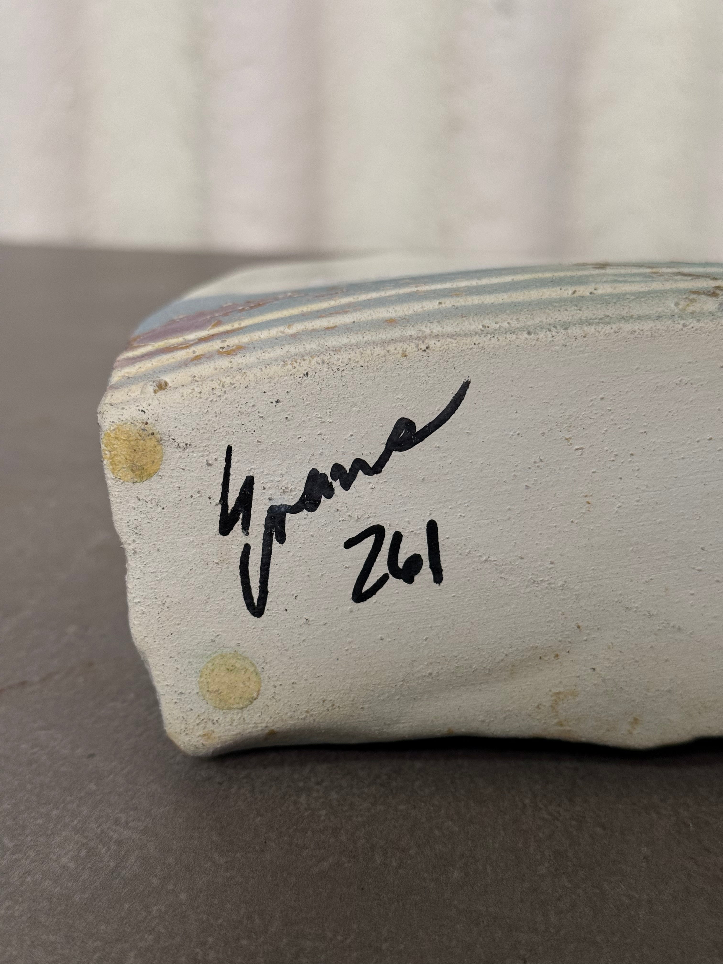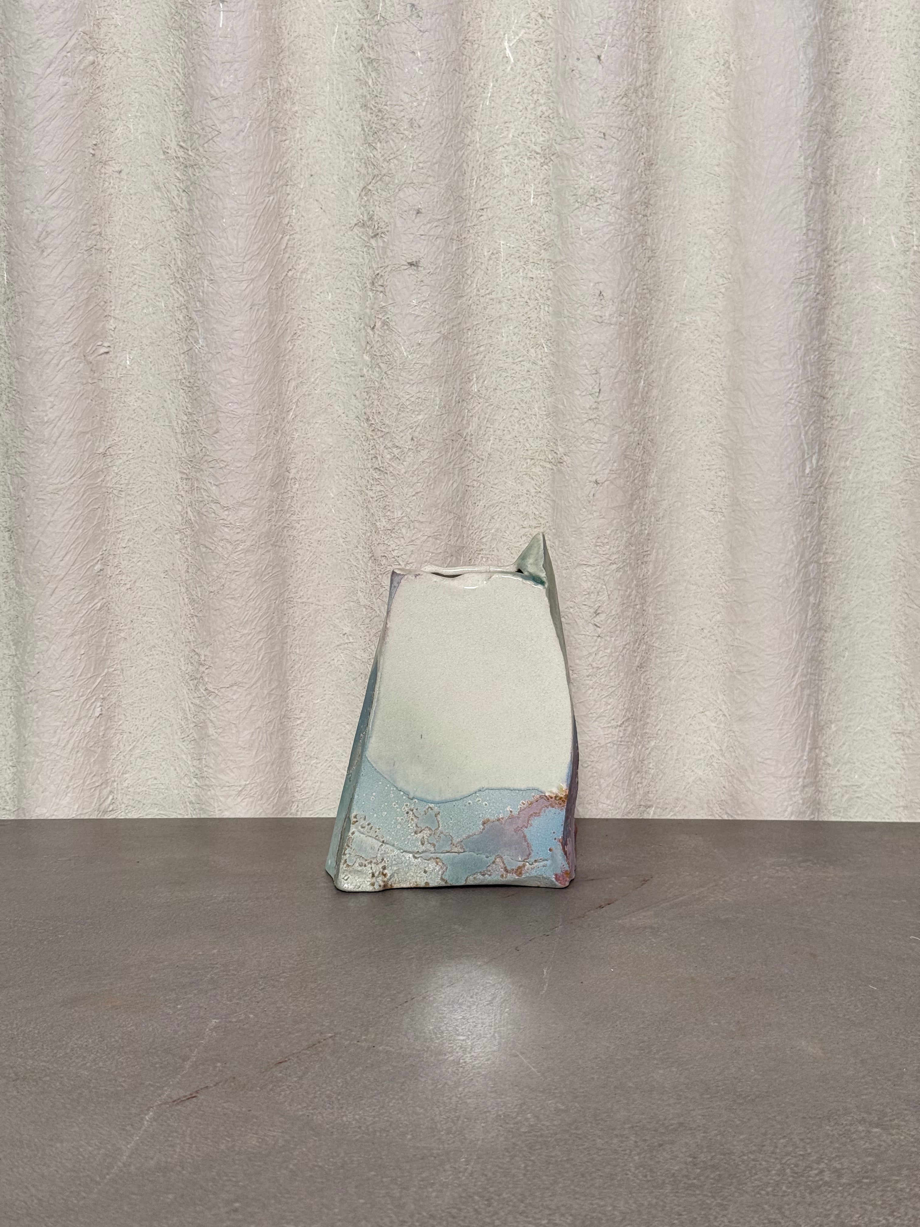This Raku Vase by Tony Evans features a unique design of volcanic lava to light sandy patches and a high gloss finish. Its unique handcrafted style makes it a standout piece for display in living rooms, offices, or galleries.