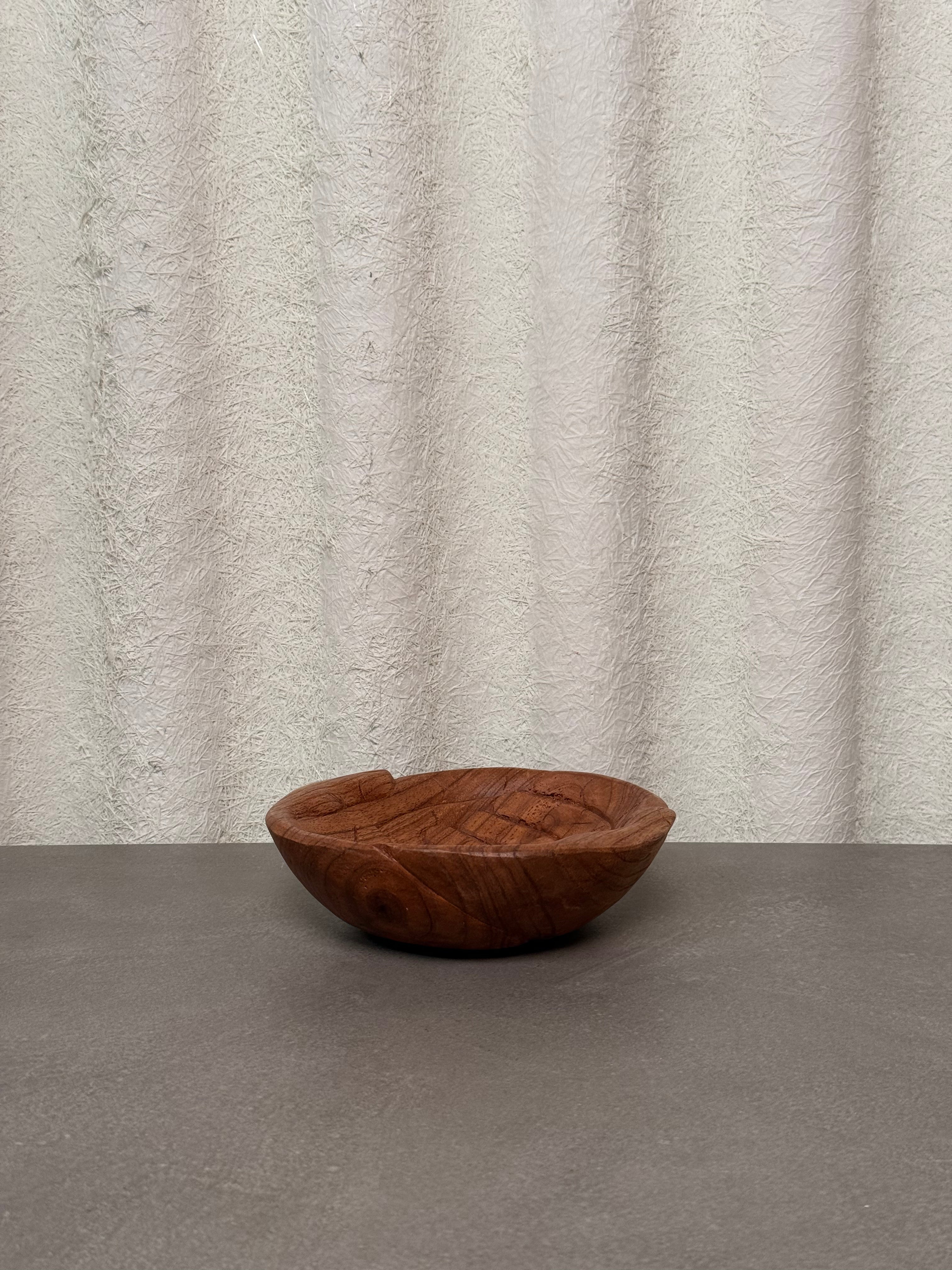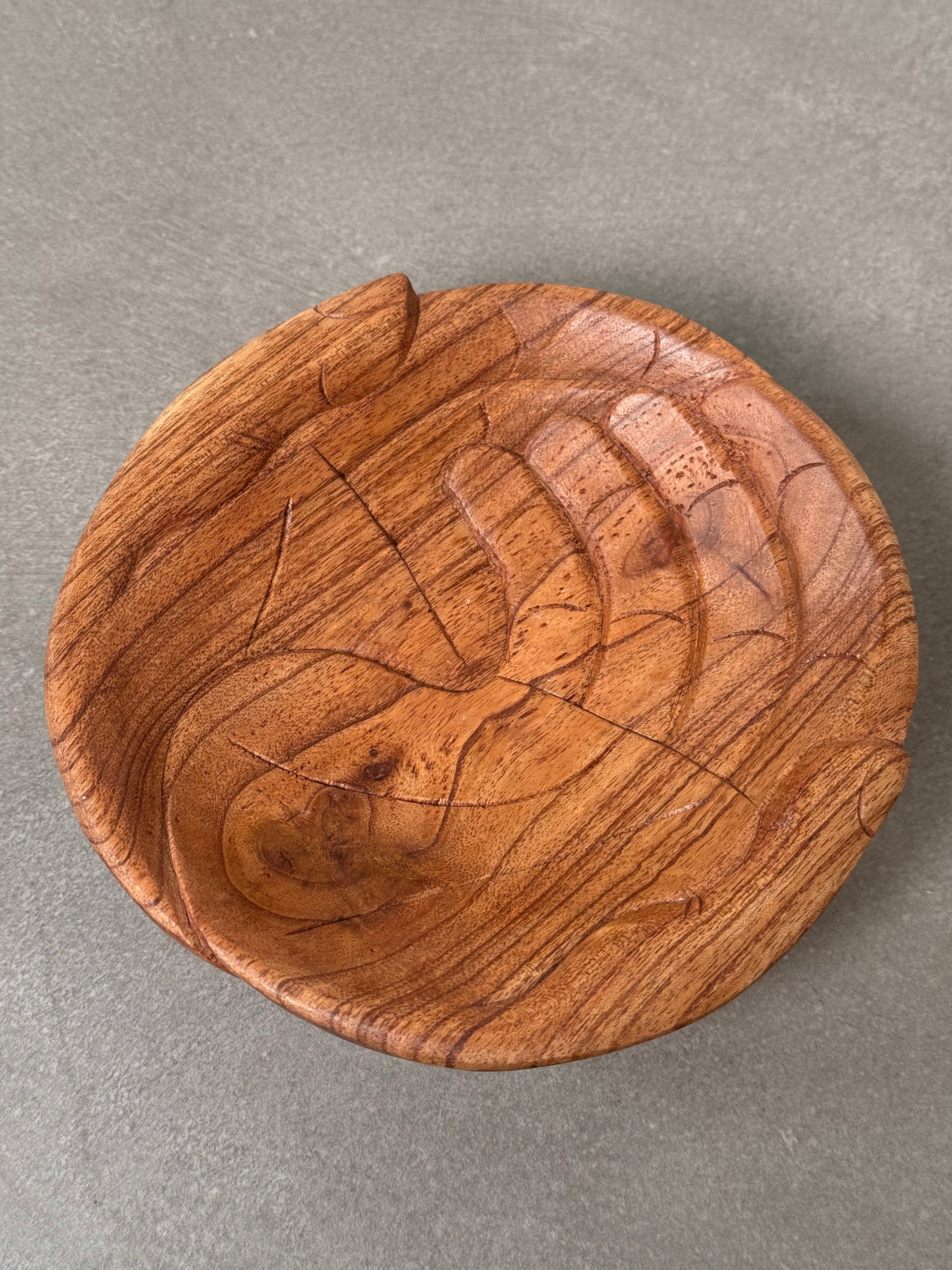 Hand-carved wooden bowl shaped as gently cupped hands, crafted from solid hardwood with visible grain and warm natural tones. The sculptural design combines functional form with decorative presence, creating a distinctive accent piece.
