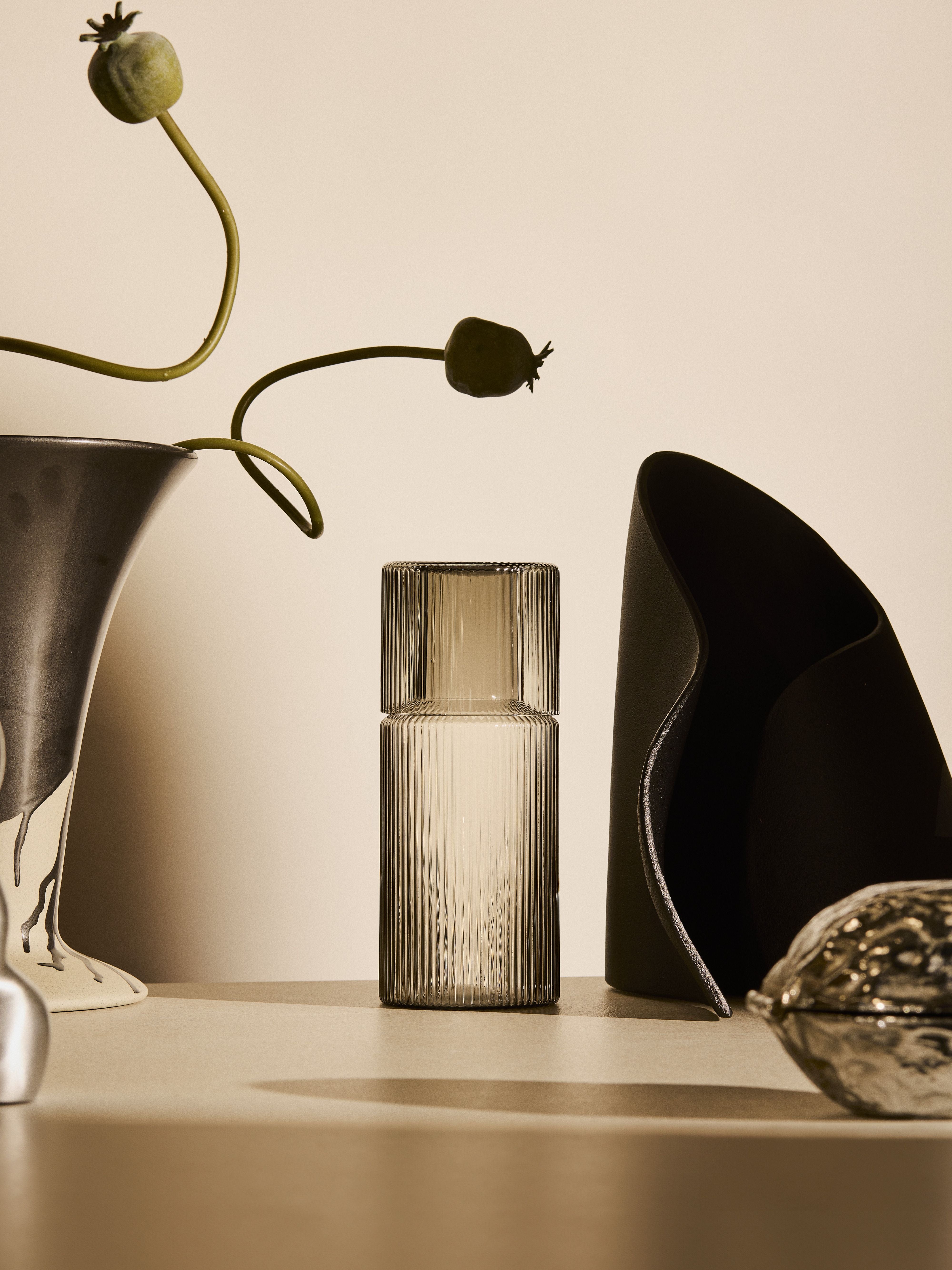 Carafe set that feature the same characteristic surface made from delicate glass which has been mouth-blown into a rippled mold.