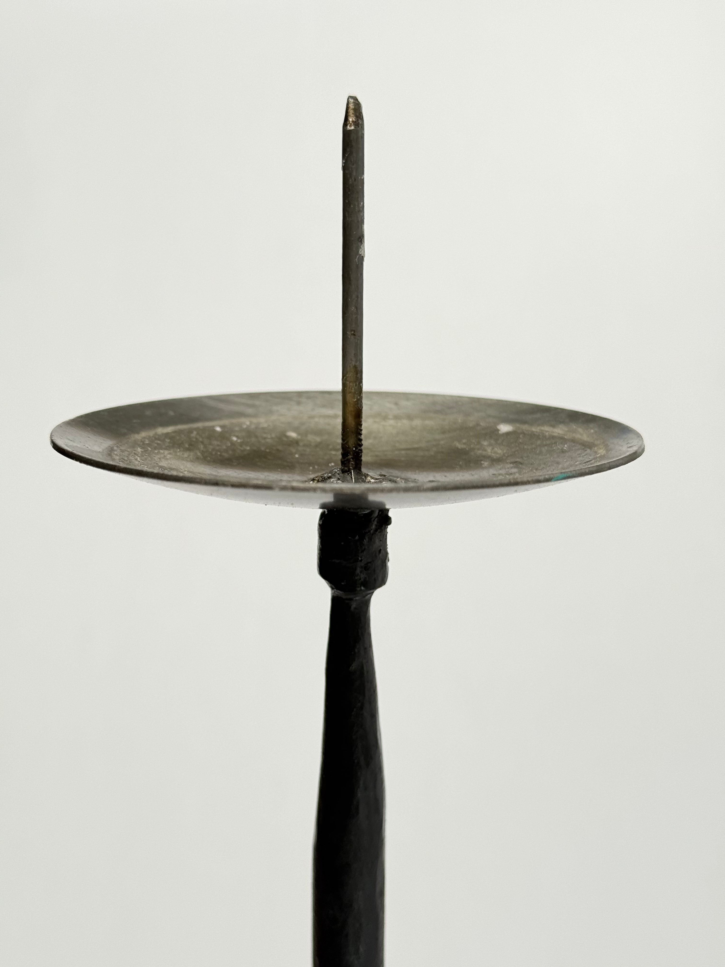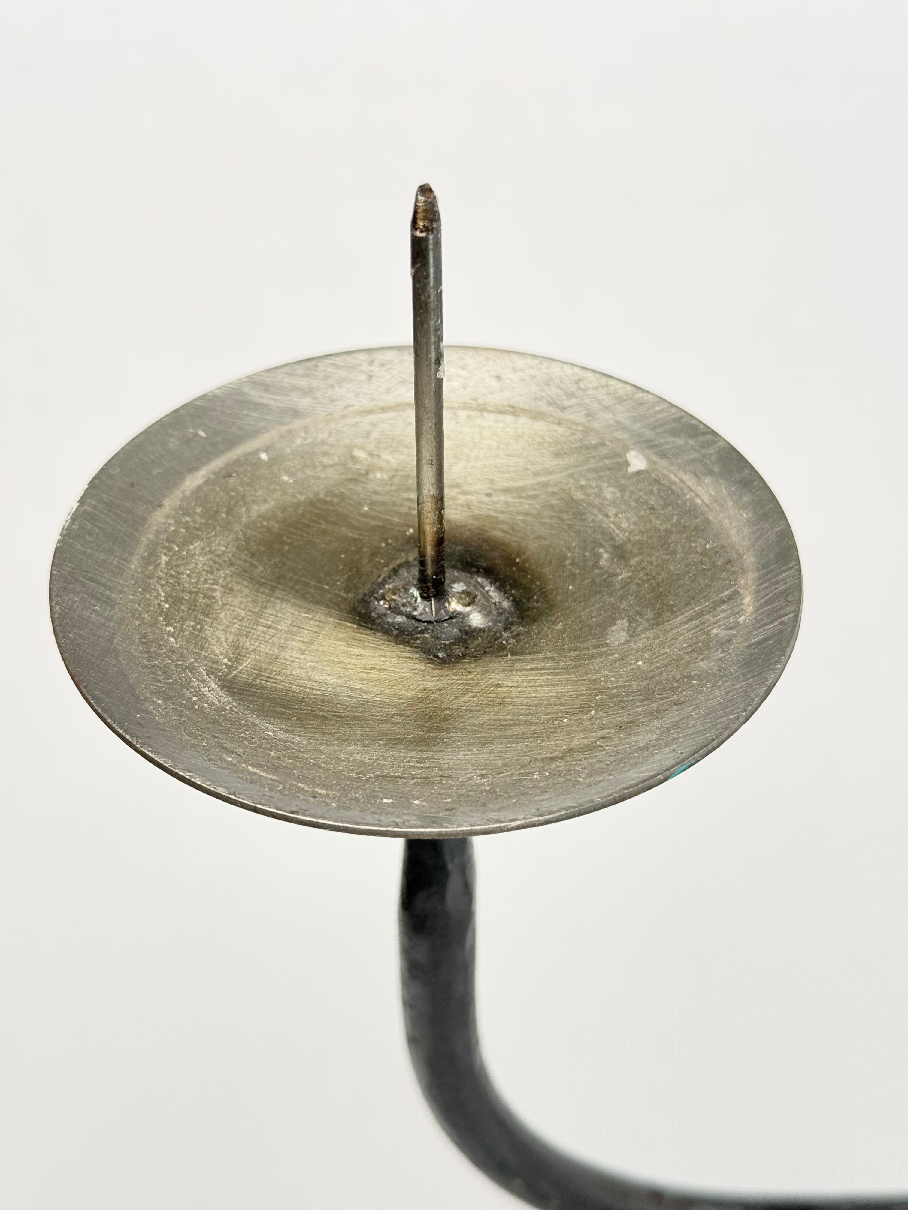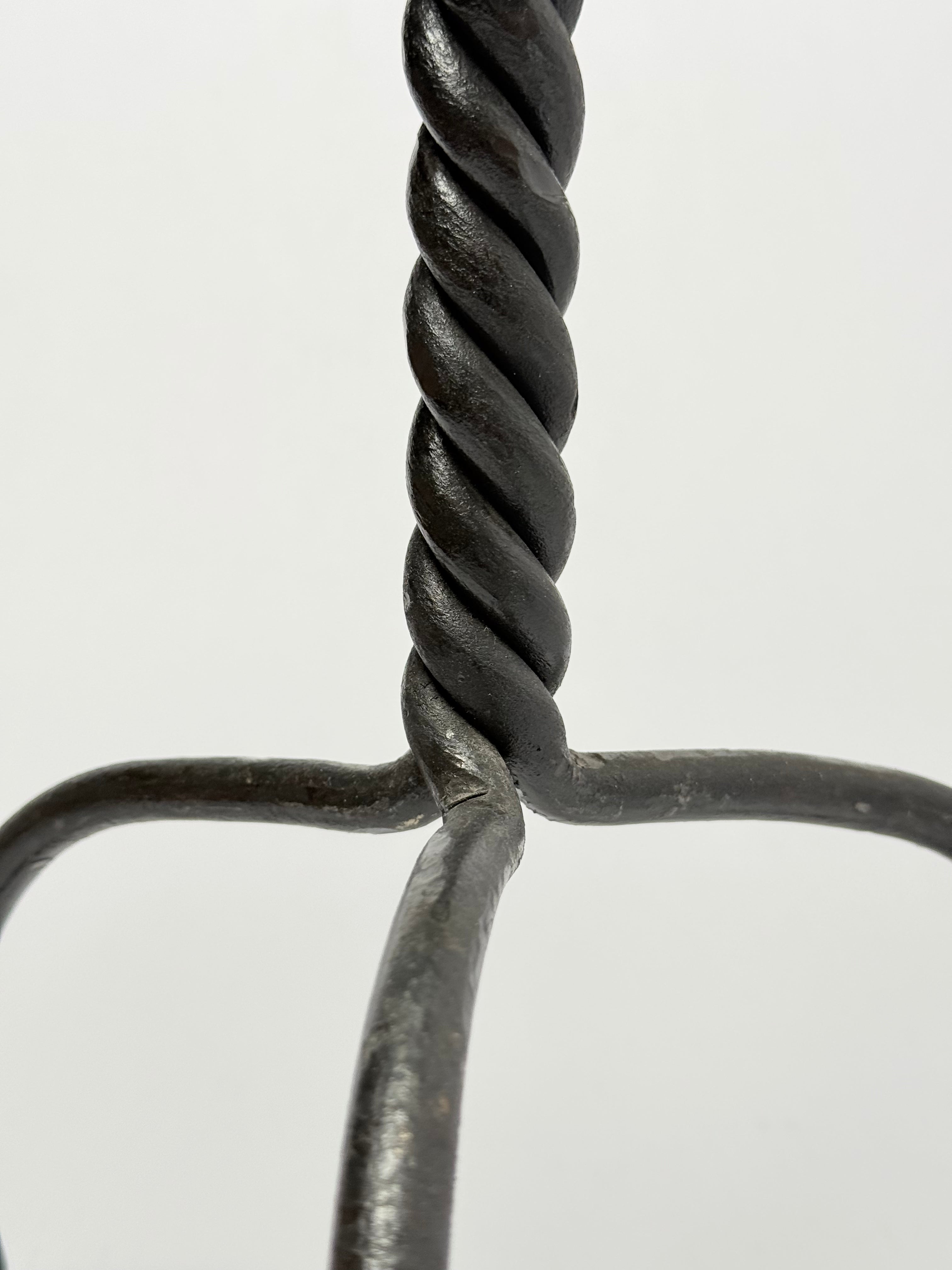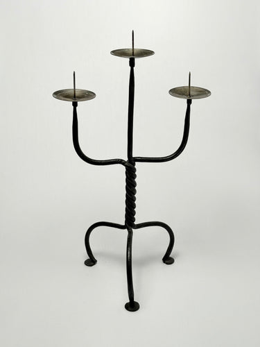 This striking iron candle holder showcases a hand-twisted stem with architectural presence, crowned by three generously spaced prongs designed to cradle standard tapers. The vintage aesthetic brings timeless character to any space.