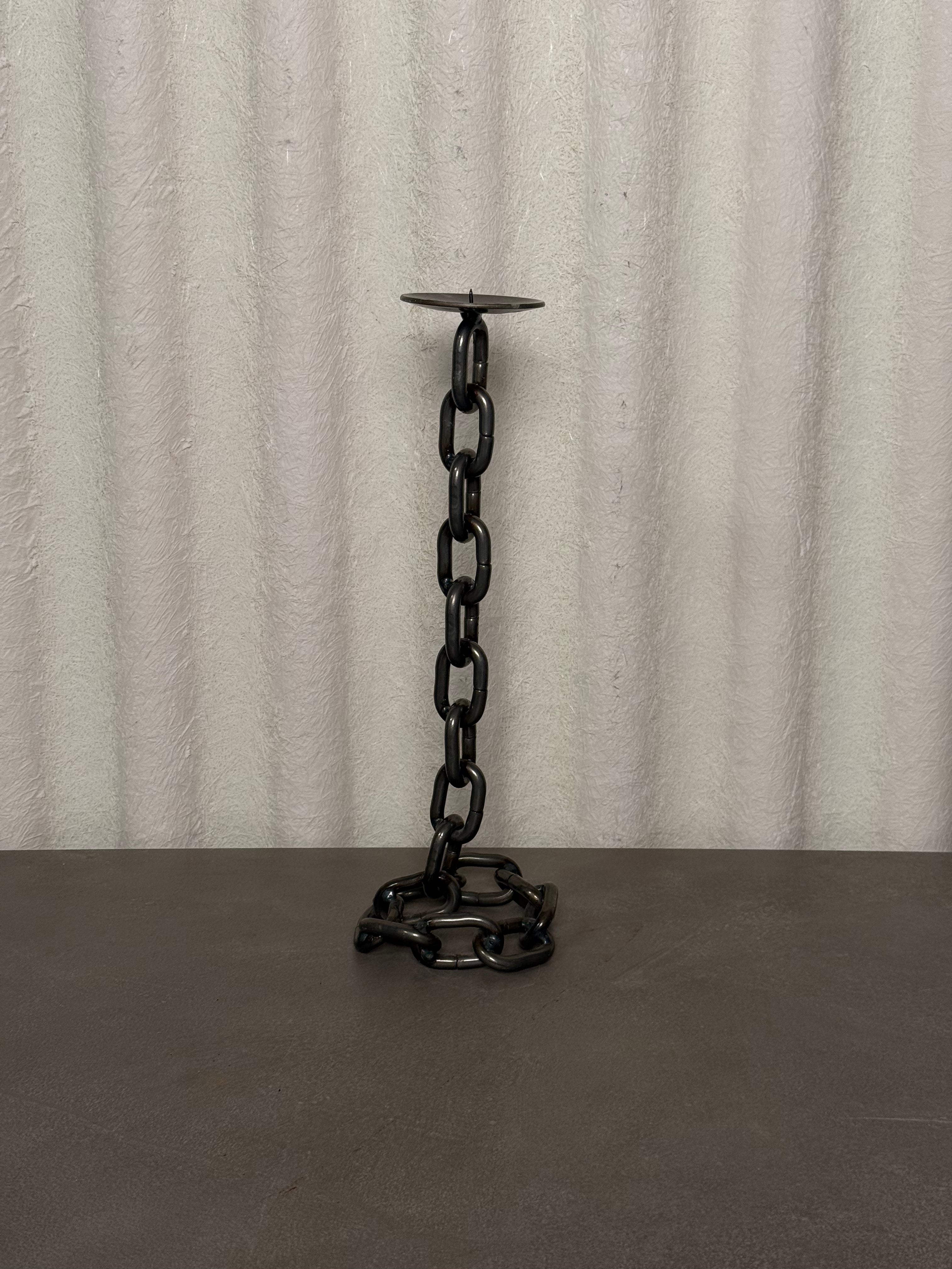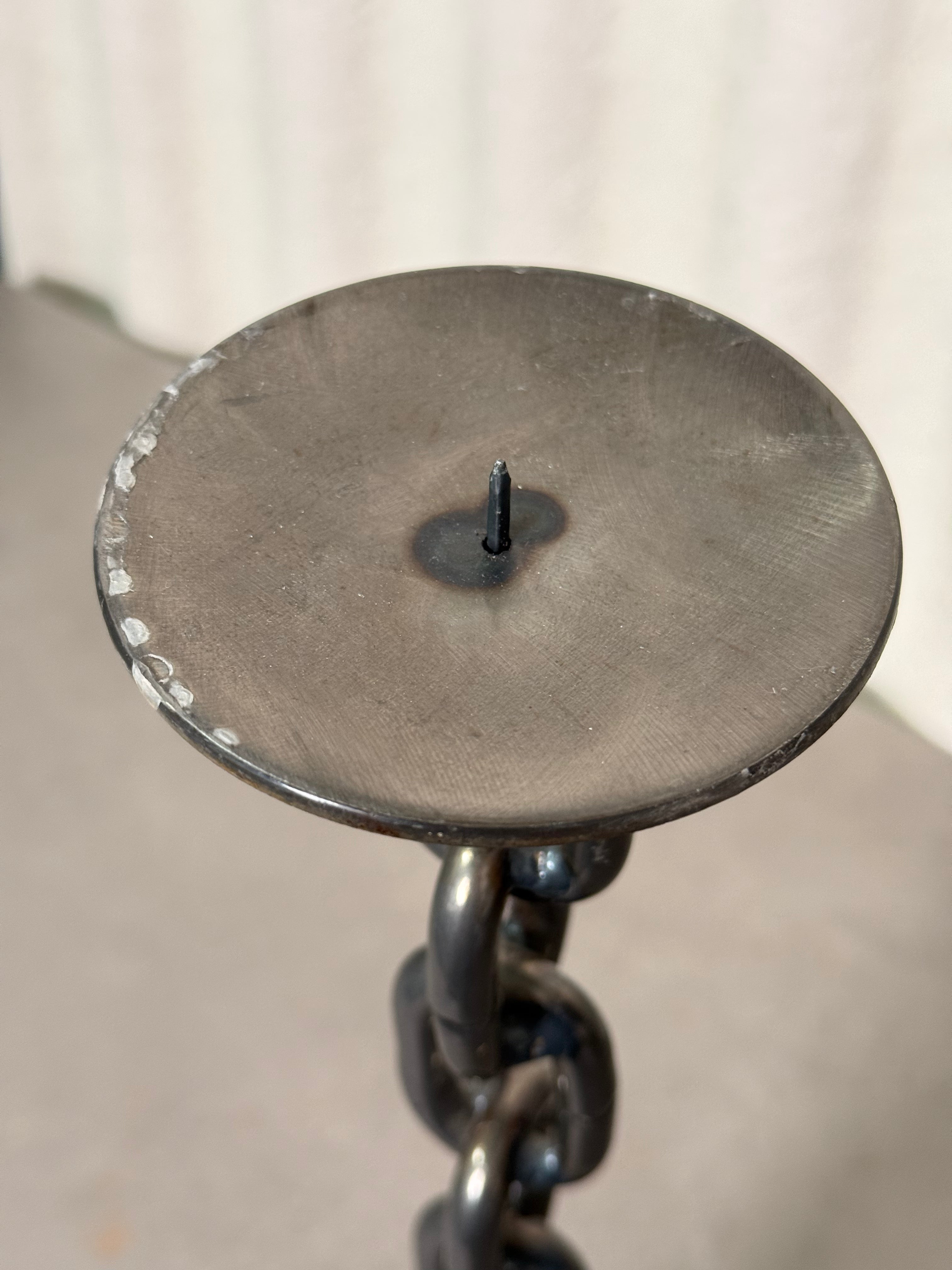 Elegant candle holder with interlocking metal chain link. Combining industrial design with sophisticated style. This piece adds a striking centerpiece or ambient lighting accent to a modern décor setting.