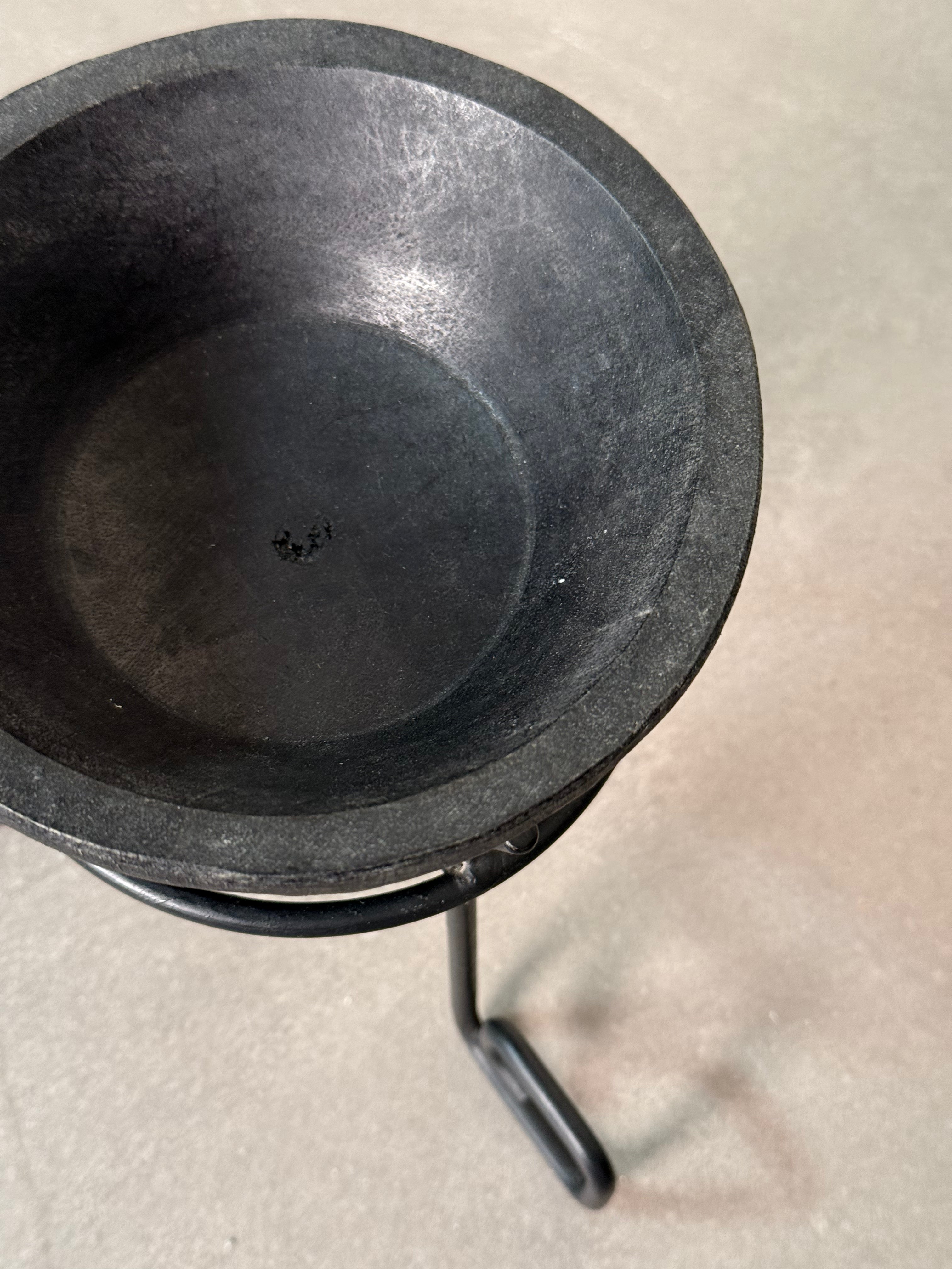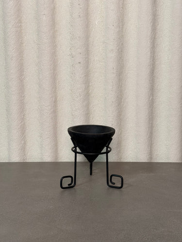 Hand-carved wooden cone tealight holder displayed on a minimalist iron stand. The sculptural pairing contrasts organic wood grain with geometric metal lines, creating a refined balance between natural material and modern form.