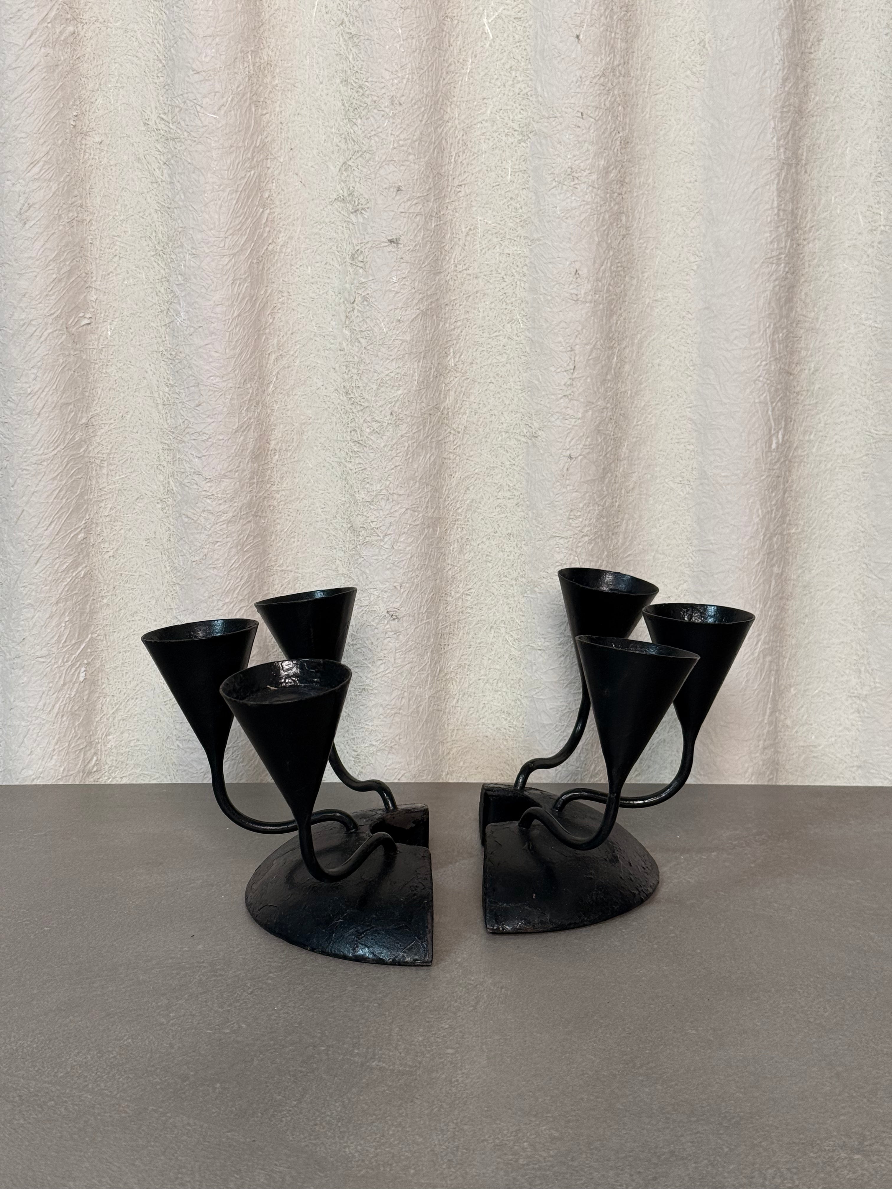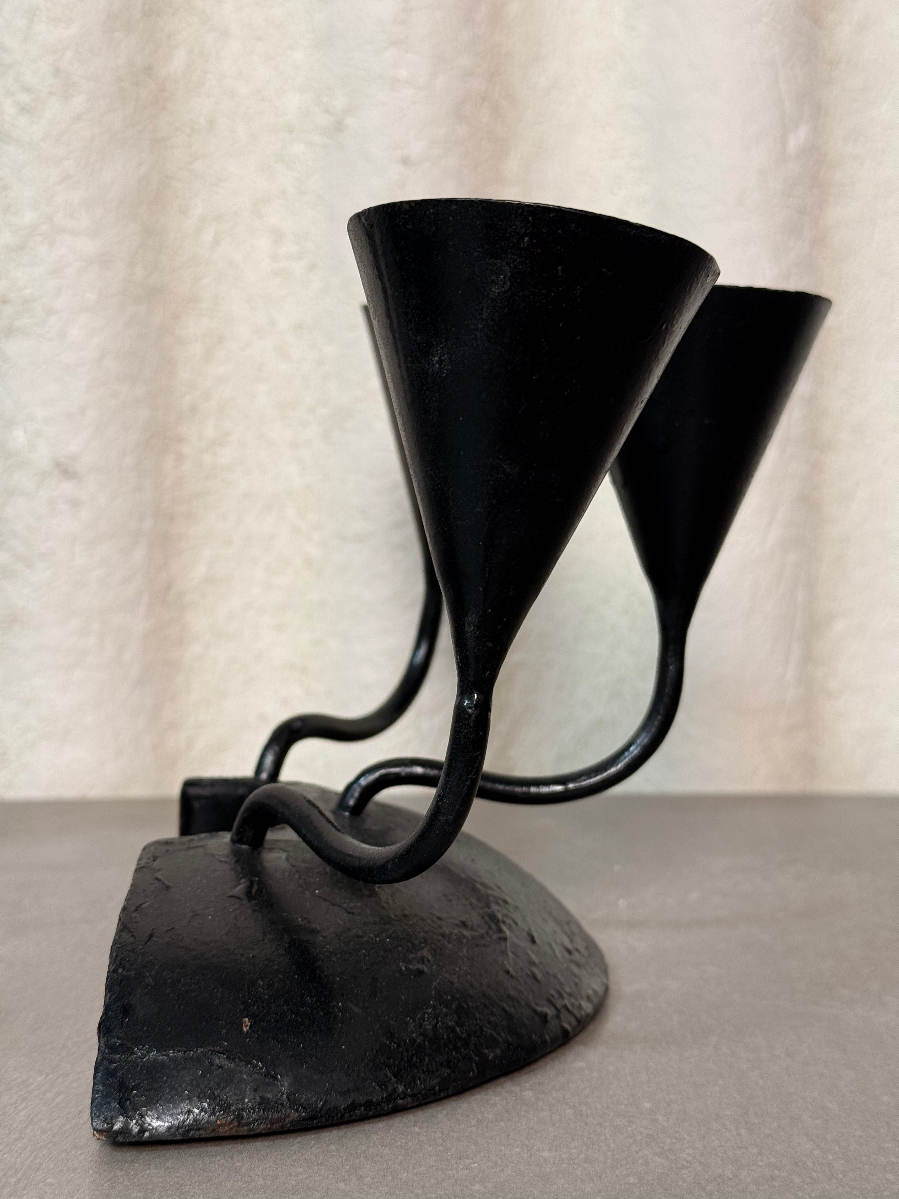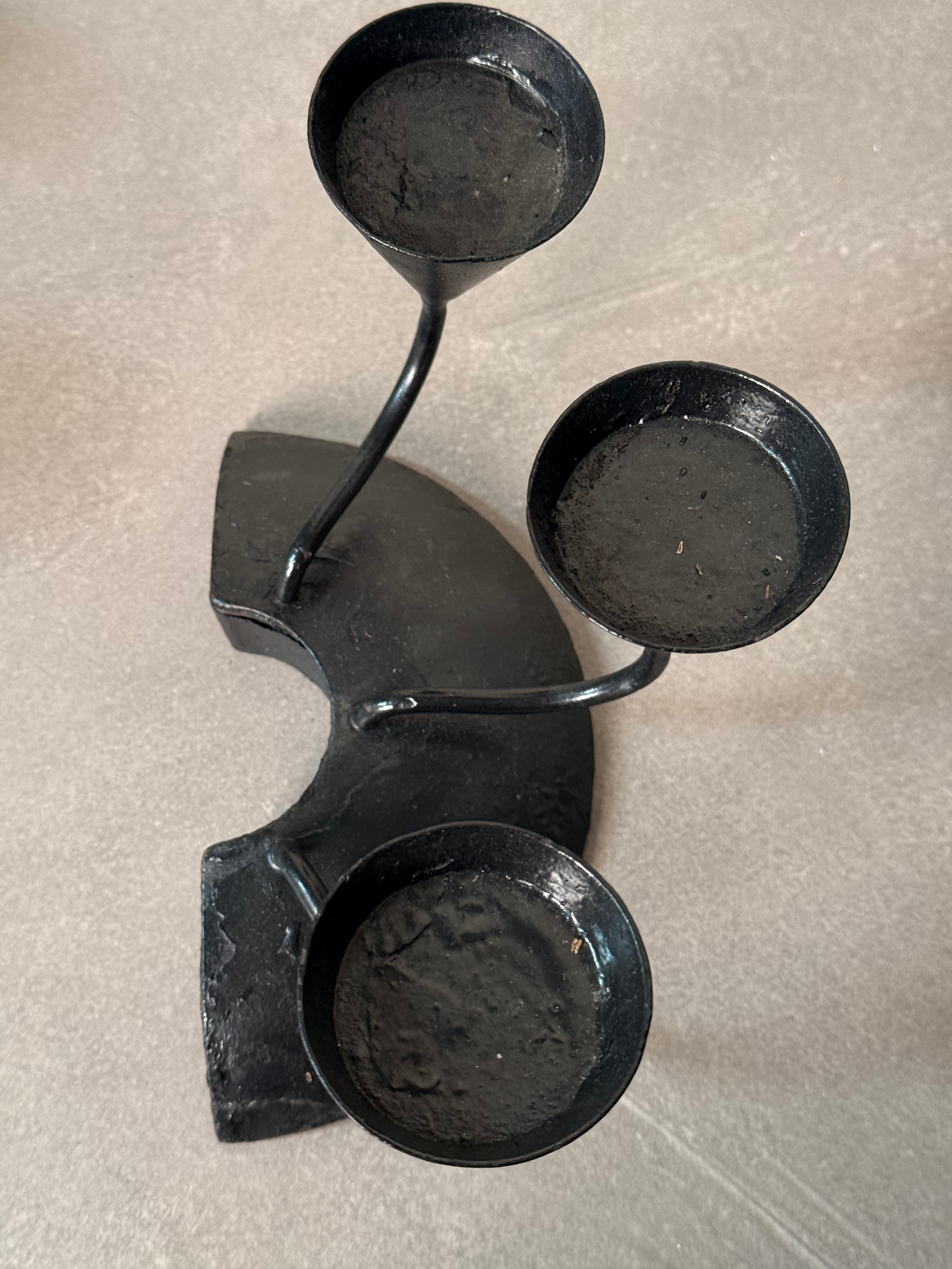 This vintage black wrought iron candle holder features a striking sculptural design with six upward arms that create a bold centerpiece for your table, mantel, or shelf. Perfect for adding moody ambiance to dining settings, cozy evenings, or eclectic home décor.