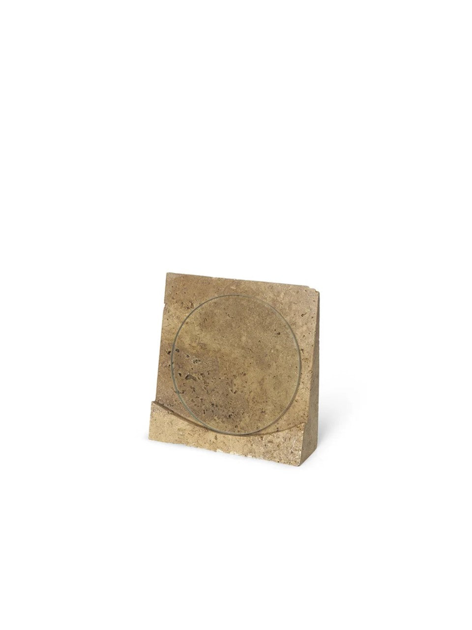A modern interpretation of the traditional picture frame, the base of the Standing Frame is made from travertine stone with a rough, unpolished surface, while a circular piece of glass rests on the edge. The intriguing contrasts of the piece engage in a beautiful dialogue, creating a both aesthetic and practical piece that allows you to elegantly display you favorite photo on your desk.