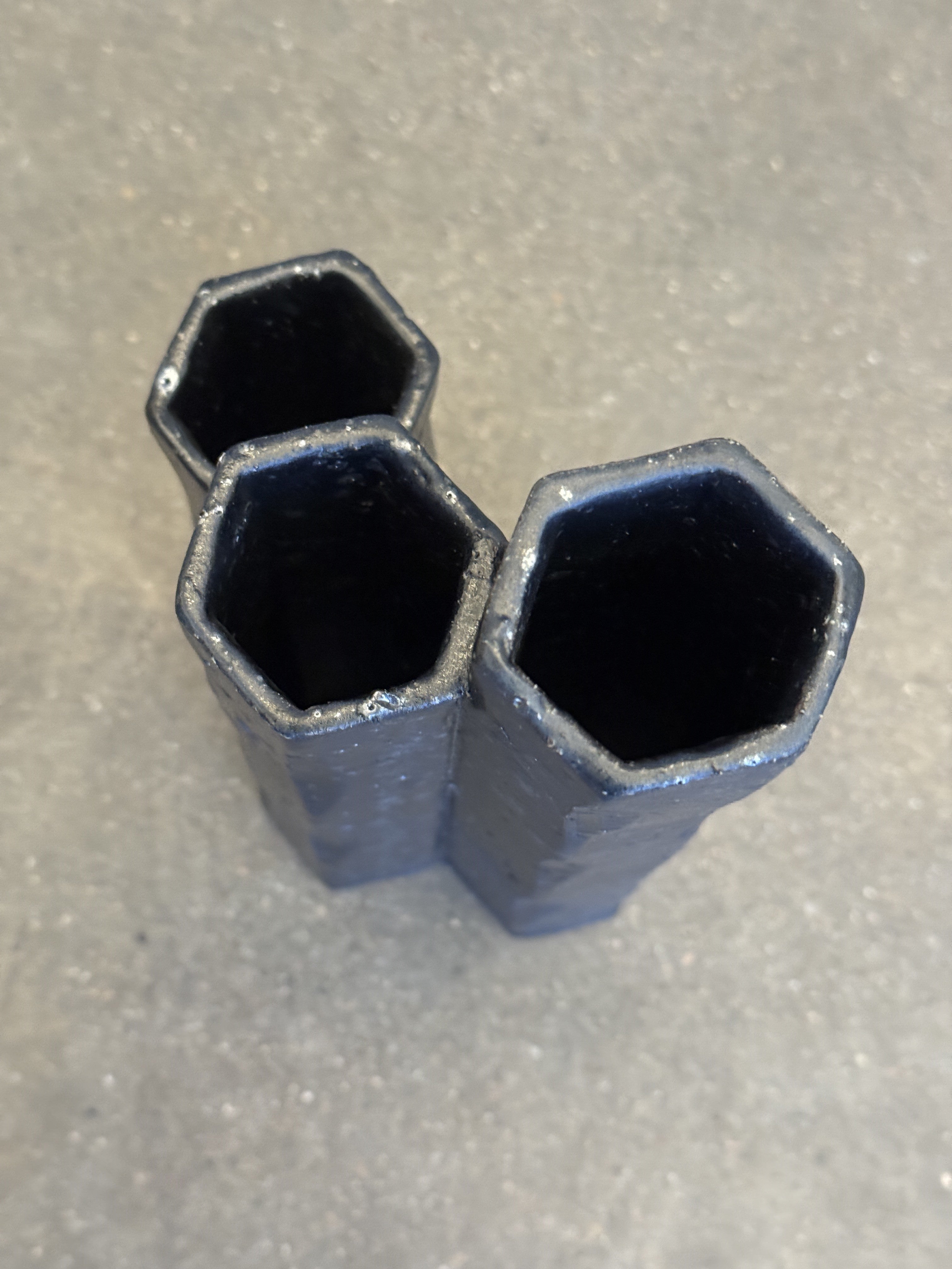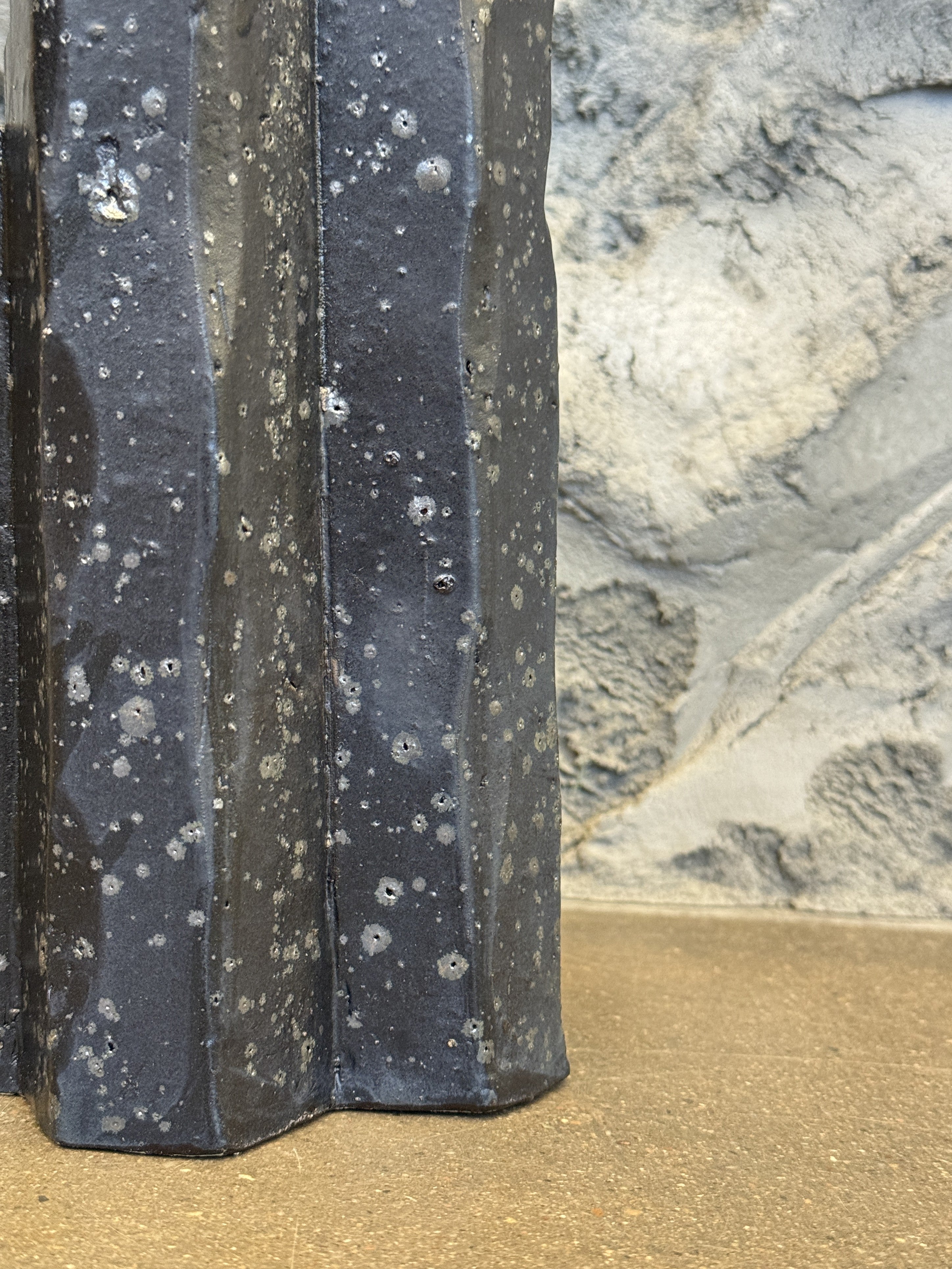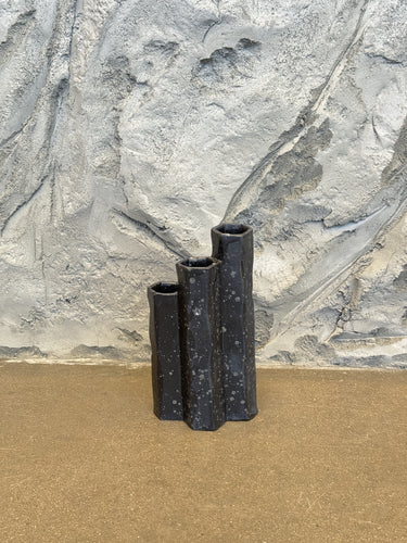 Sculptural and elemental, the Leirandi Black Rock Triple Vase is hand-built from Icelandic clay, inspired by the iconic basalt columns of the island’s dramatic landscape. Three hexagonal chambers rise together like a small cluster of cooled lava — textured, faceted, and finished in a deep matte black glaze with subtle natural speckles.