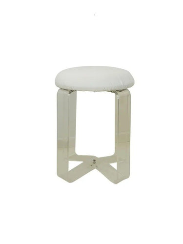 A lucite low stool with vinyl upholstered seat. The ribbon-like clear acrylic legs cross in at the base. The padded round seat is covered in the original white vinyl. Retains the original label from Karmel Plastics of Connecticut from the 70’s.
