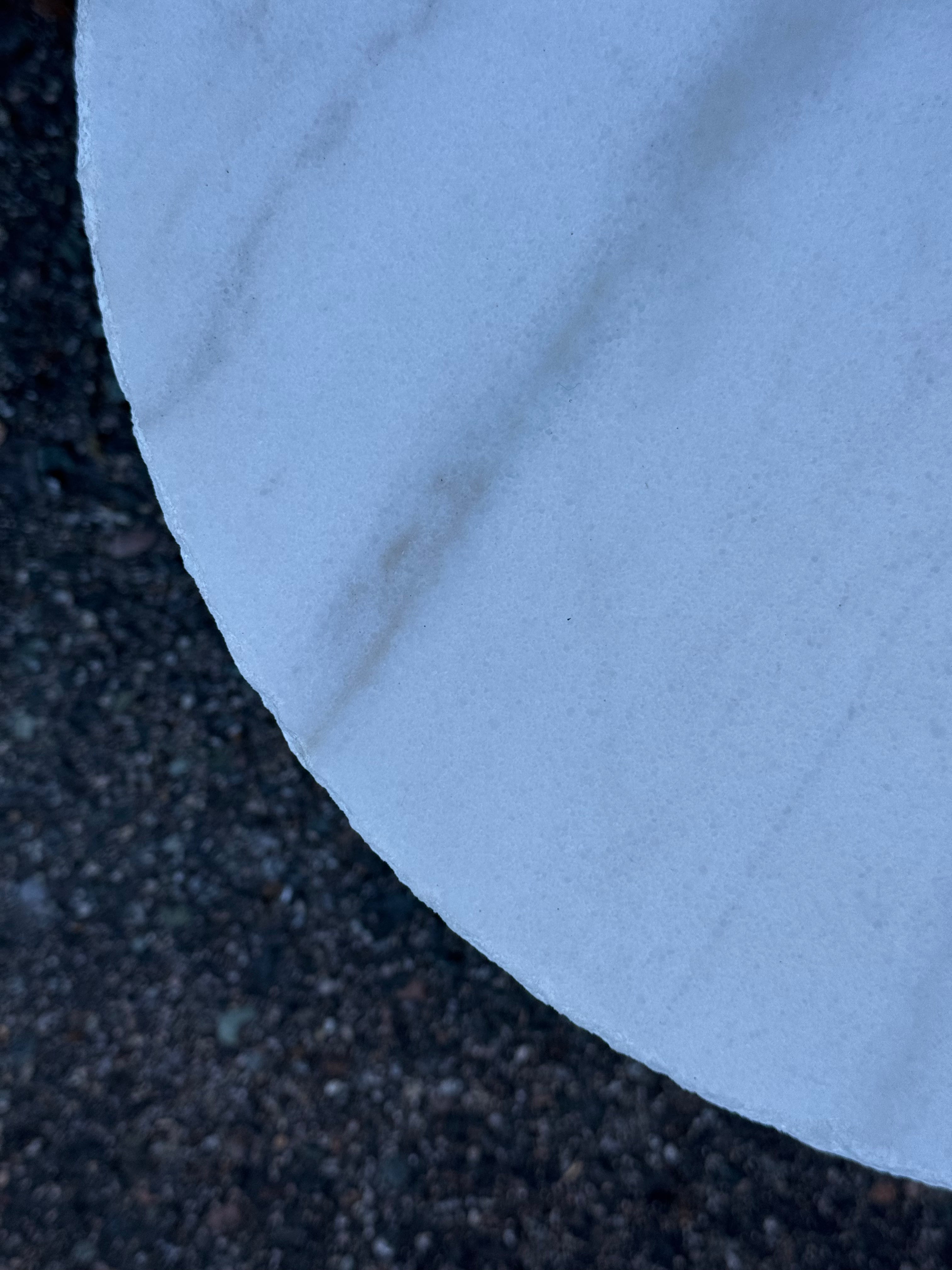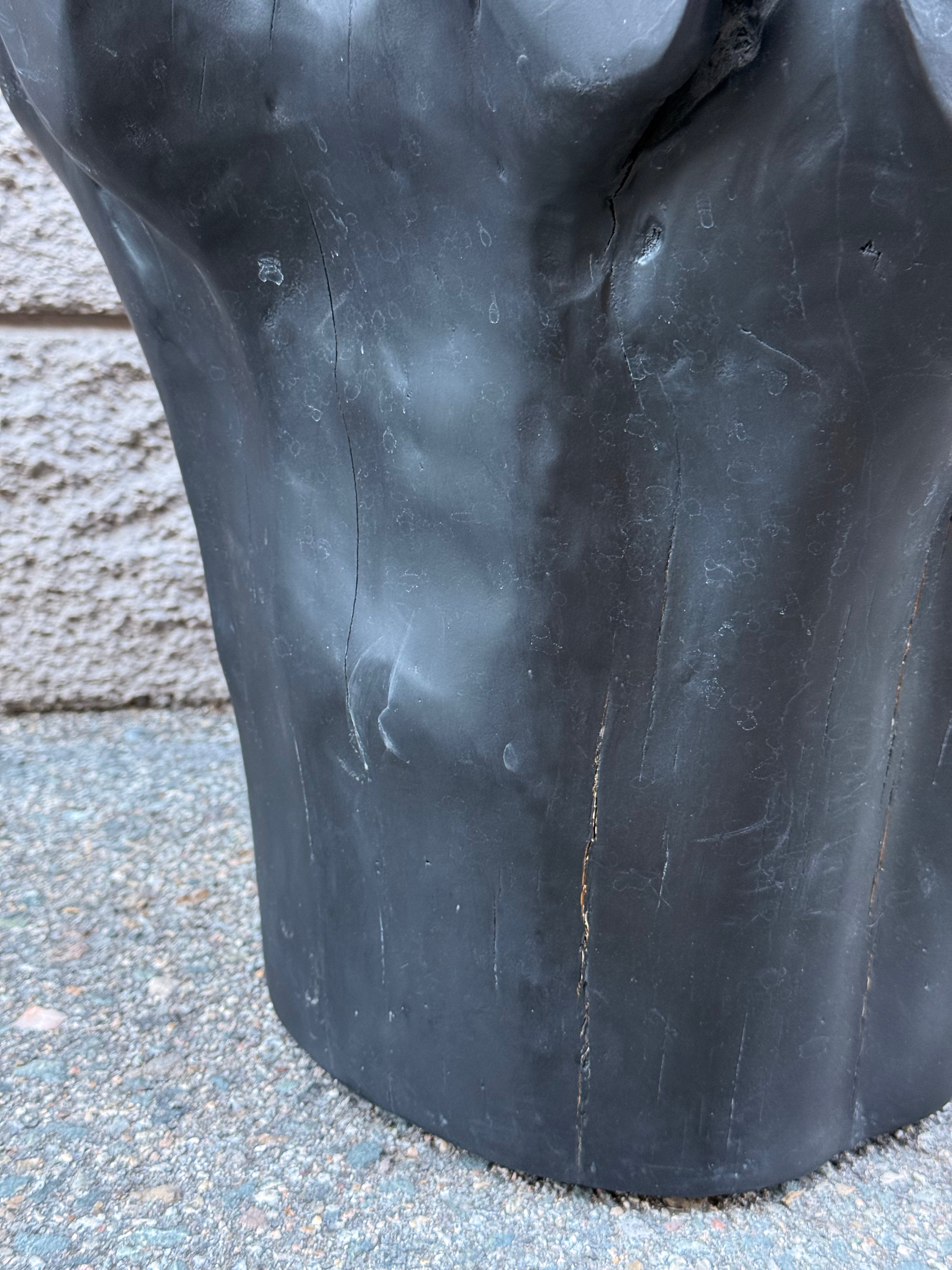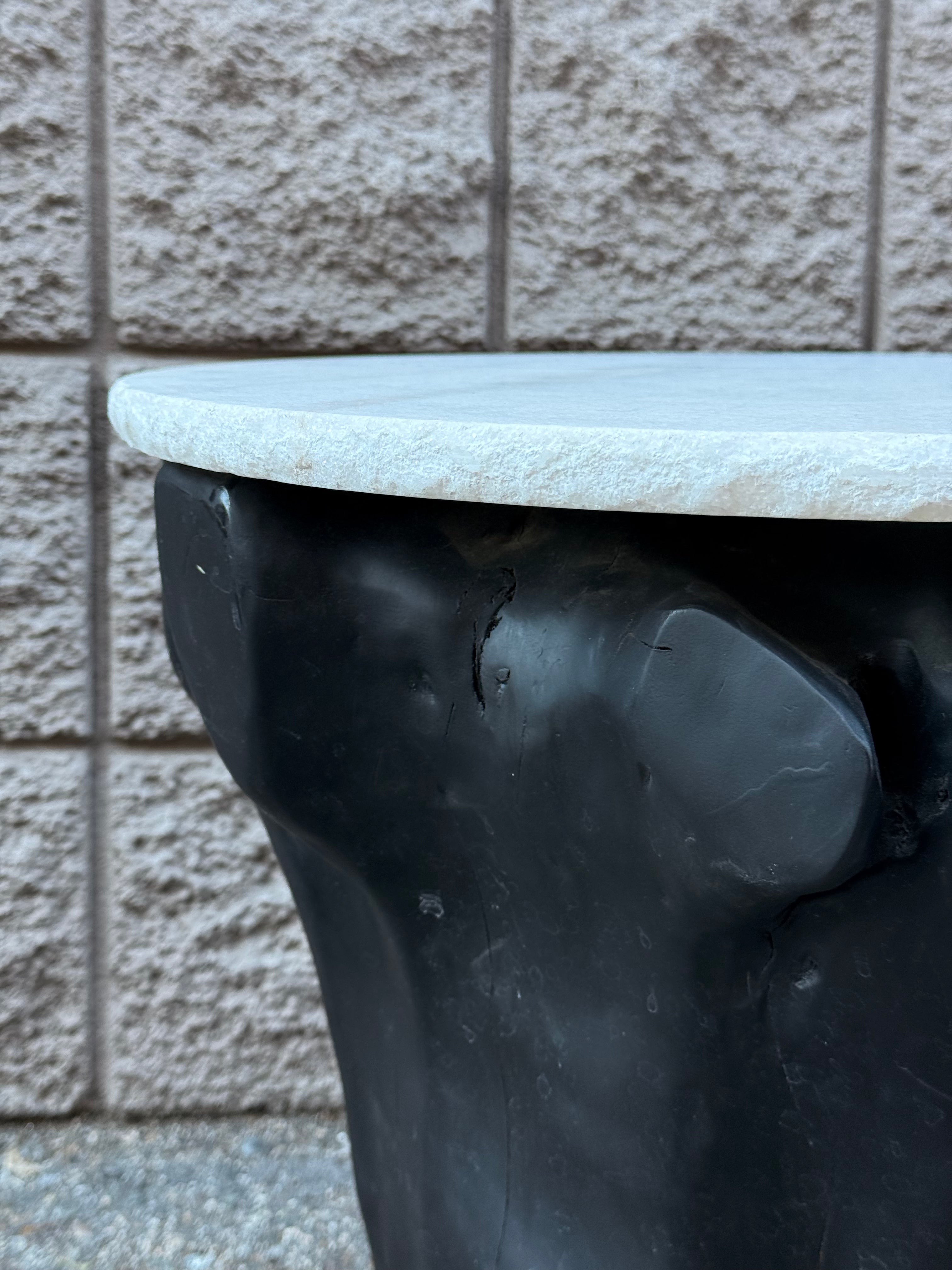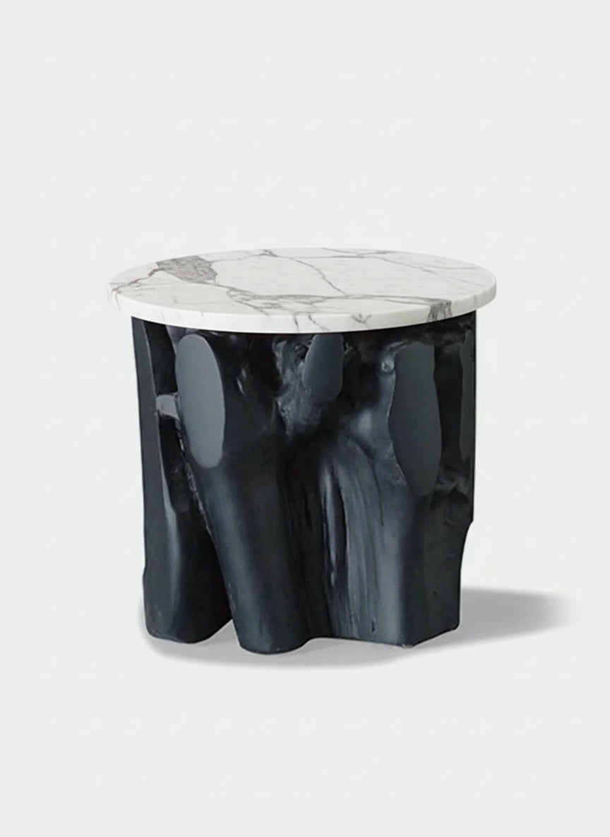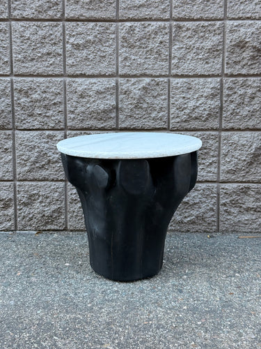Black painted tree stump side table with white marble top. Shape of the base may vary.