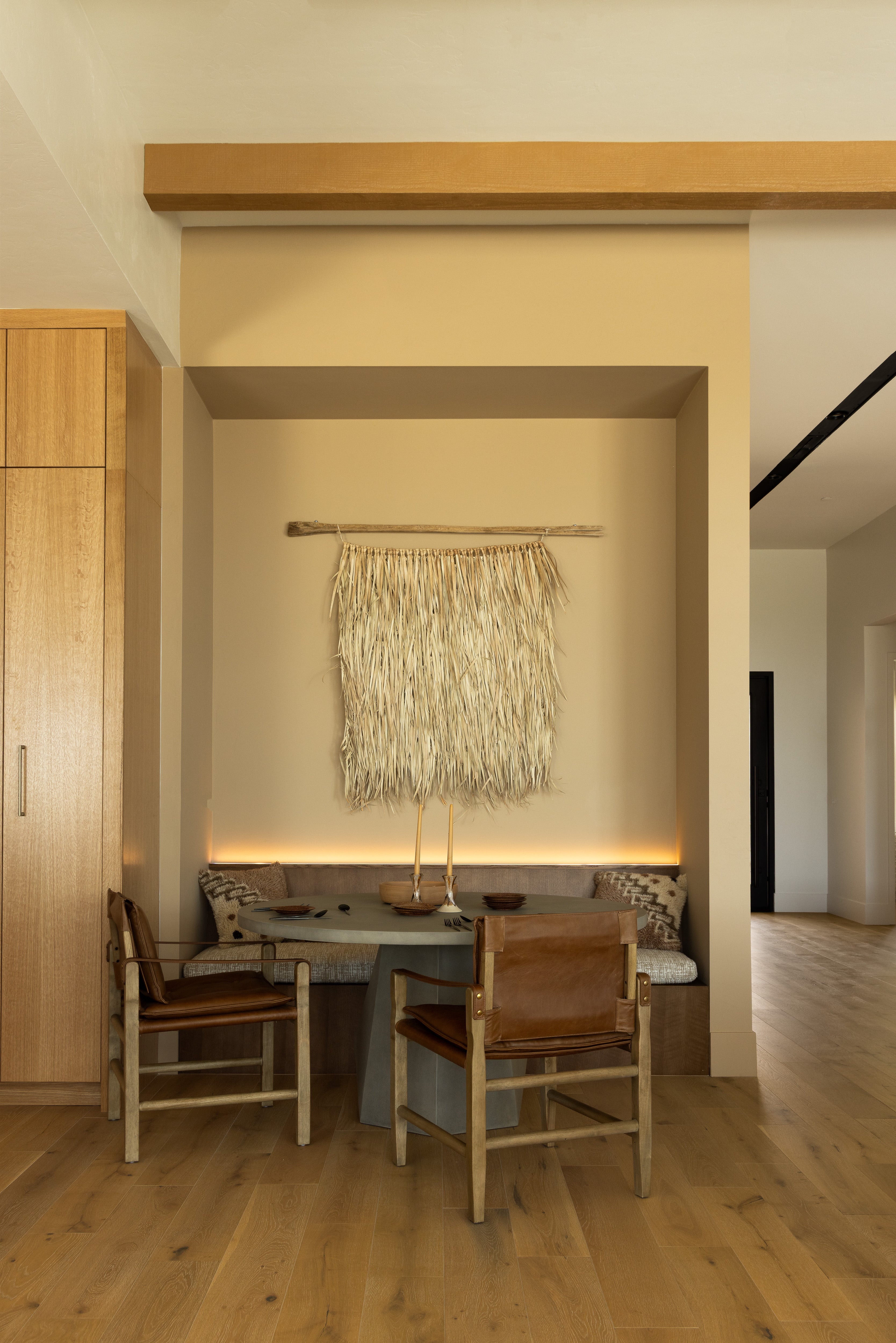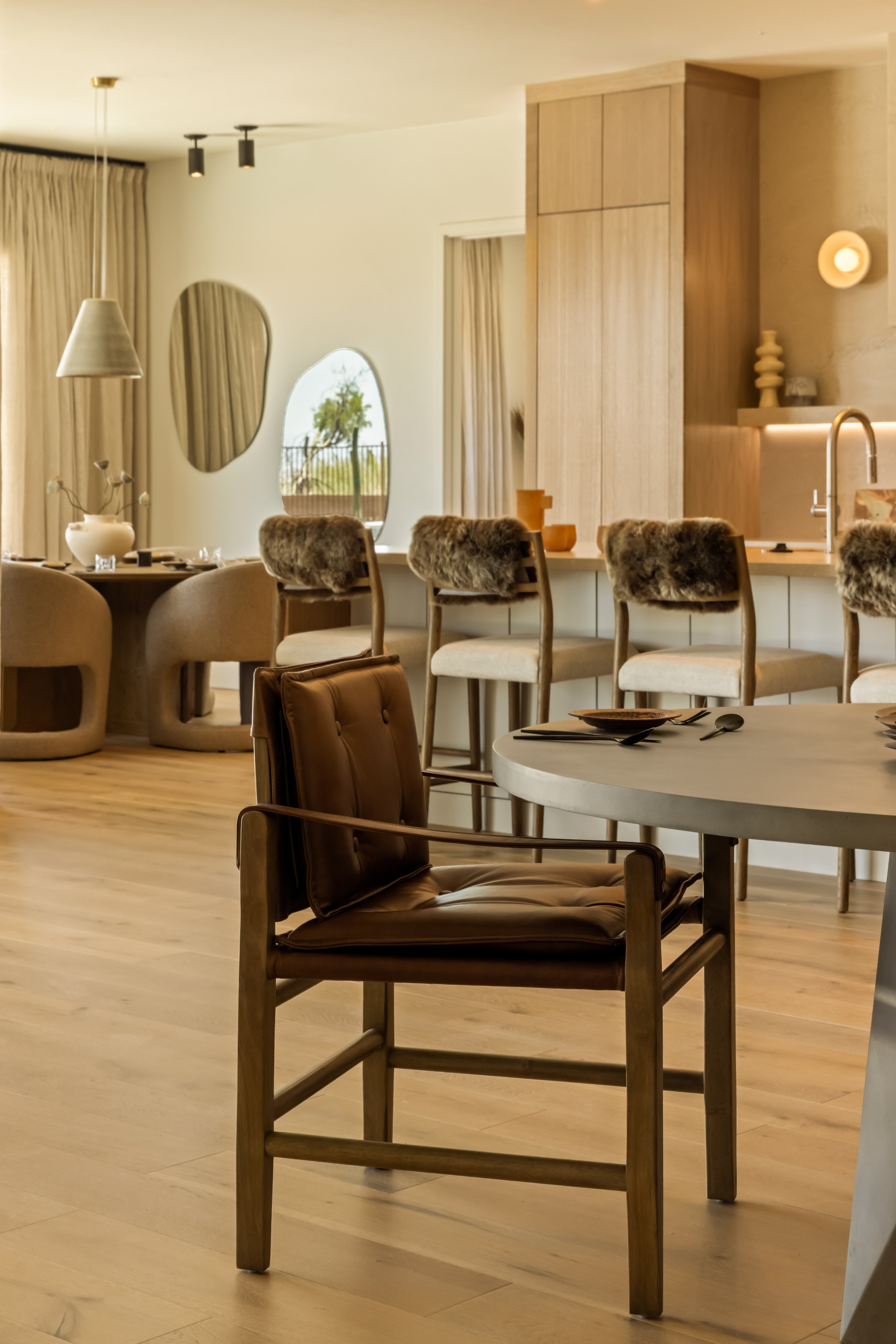Inspired by a vintage safari-style frame, this dining chair is defined by the fluid strap arms. Semi-attached cushions in rich chestnut leather, finished with button tufting details. It has a parawood frame and brass details which add warmth and texture.