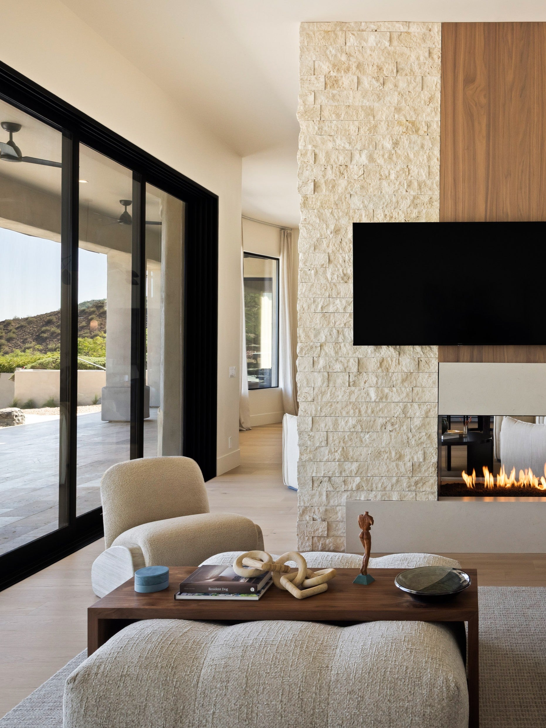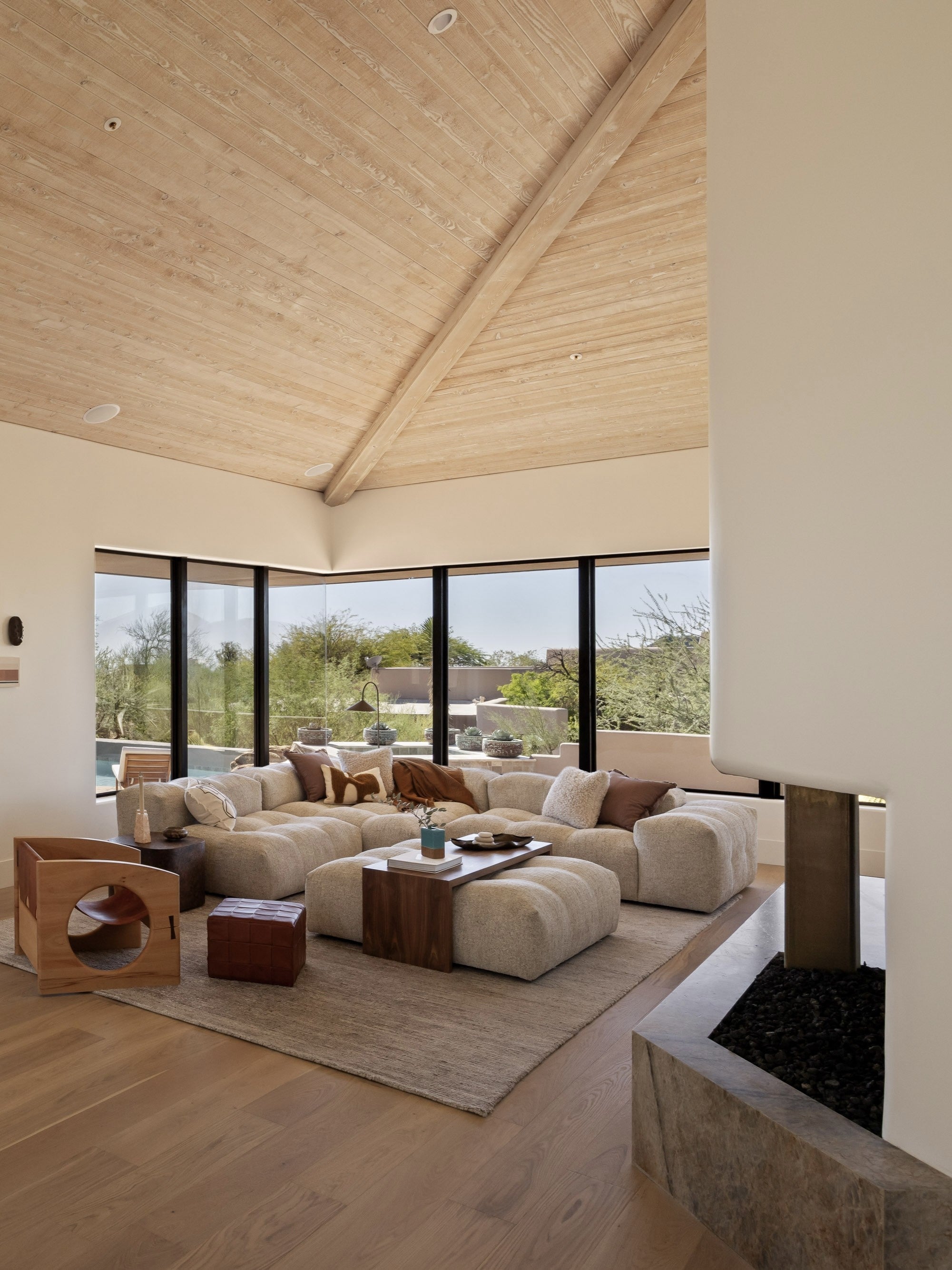 Luxury ottoman by Rene Cazares upholstered in soft off-white bouclé fabric, designed with clean lines and a low, modern profile. This plush modular ottoman features subtle tufting and a structured silhouette, making it ideal as a coffee table alternative, extra seating, or a relaxed lounge centerpiece.