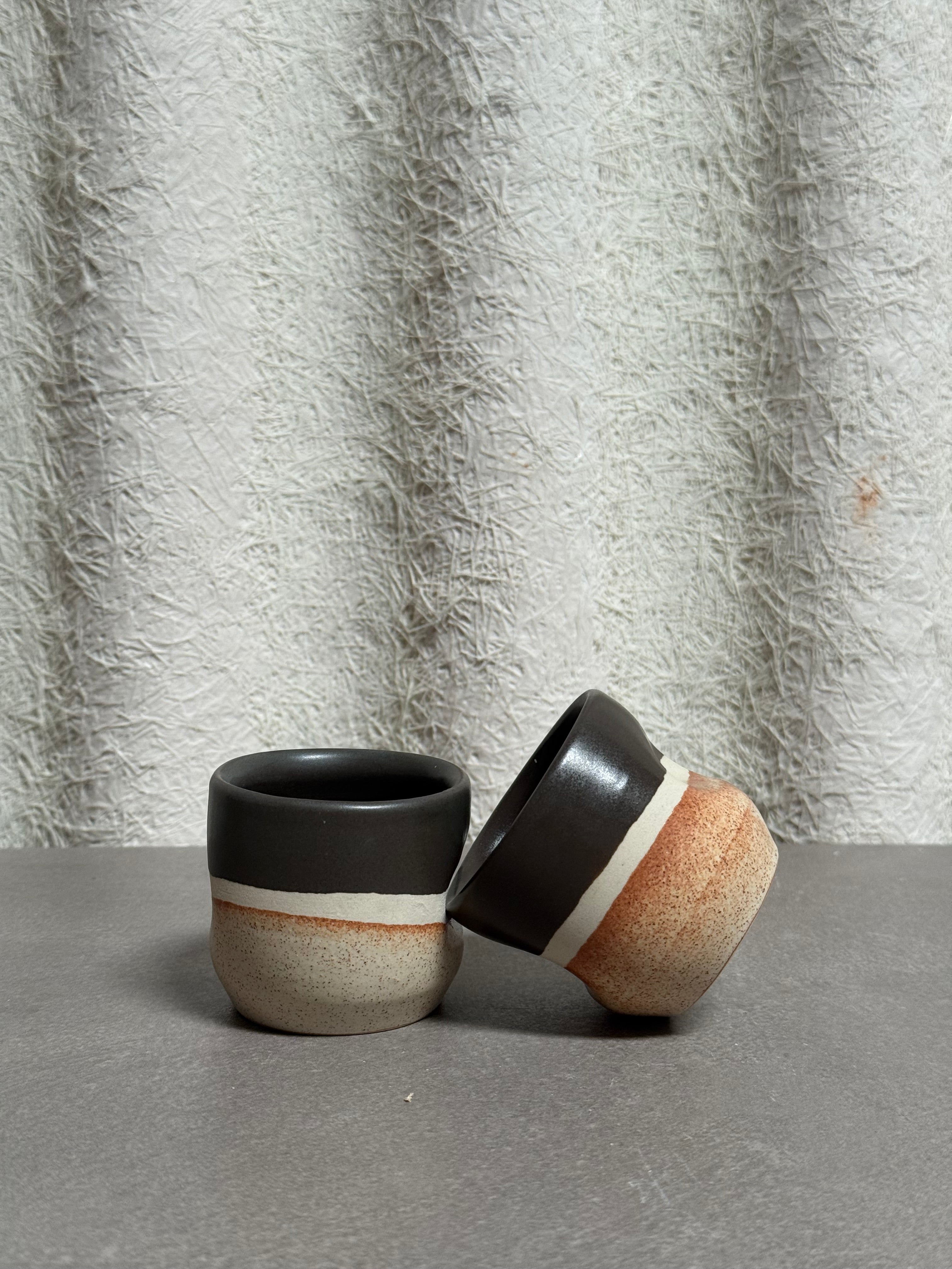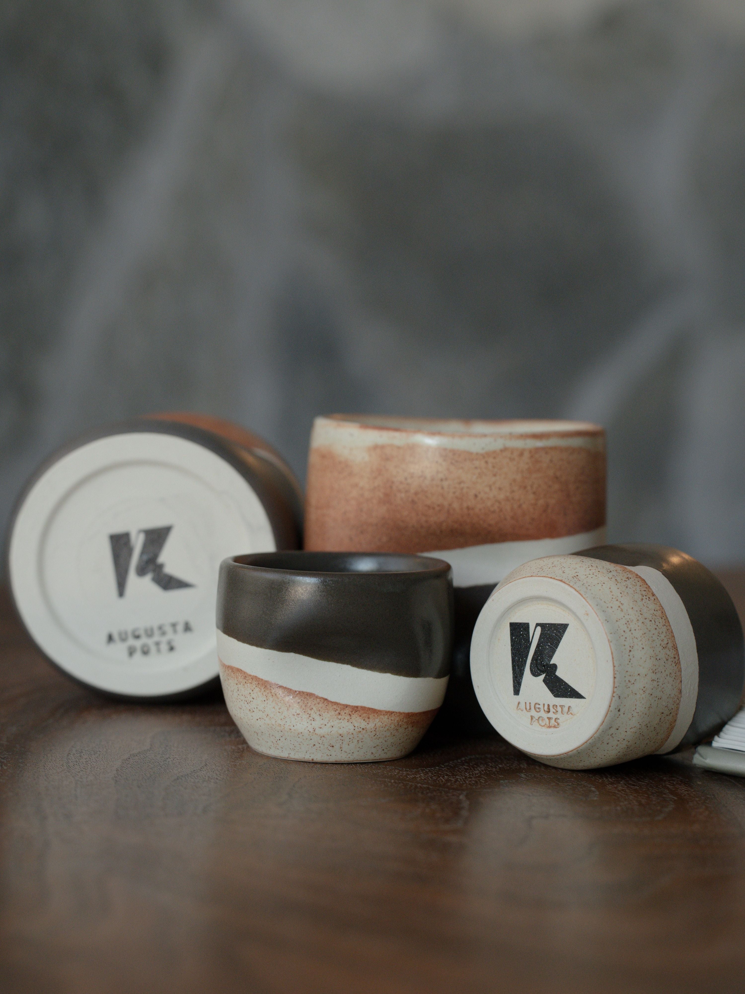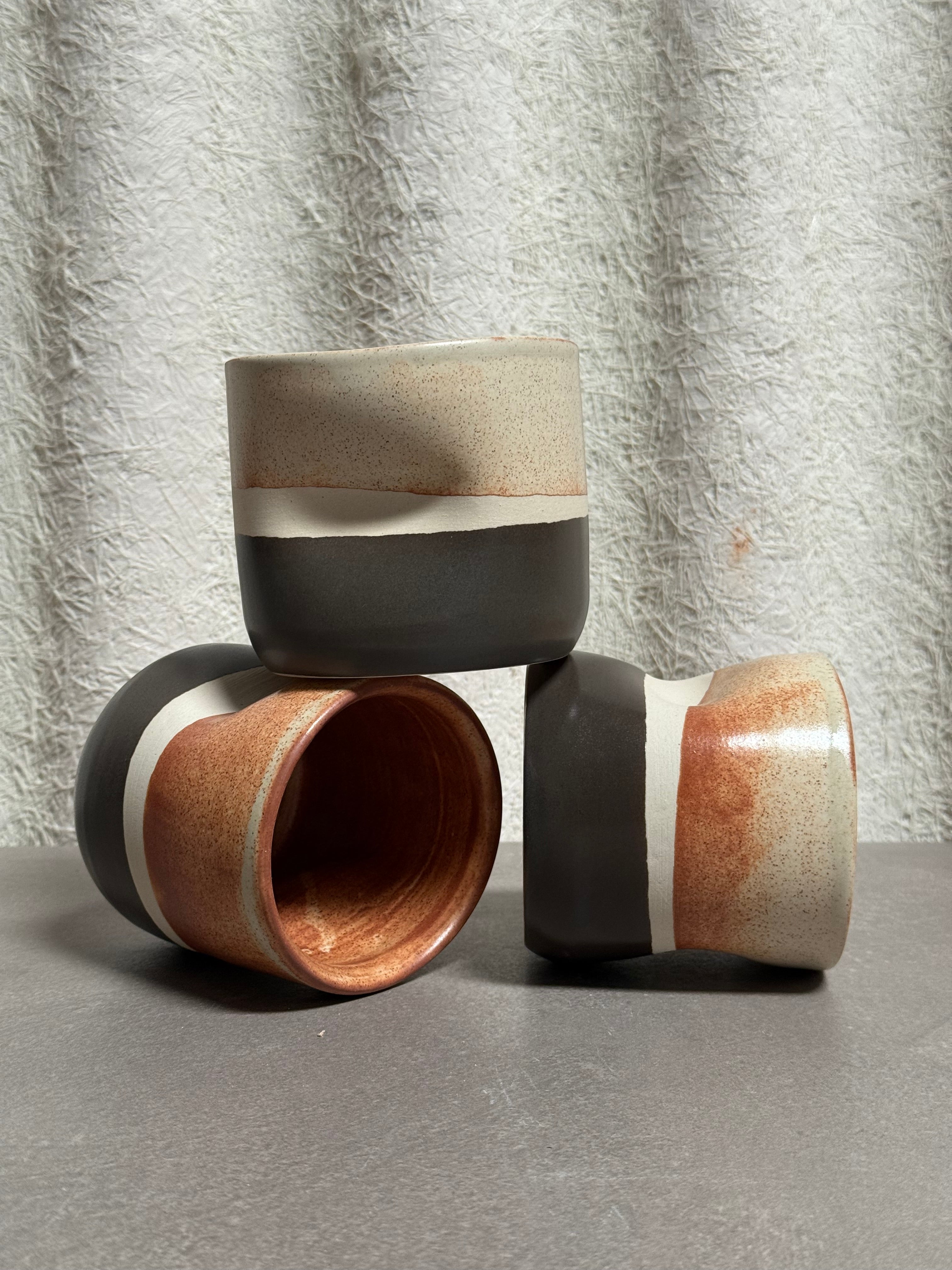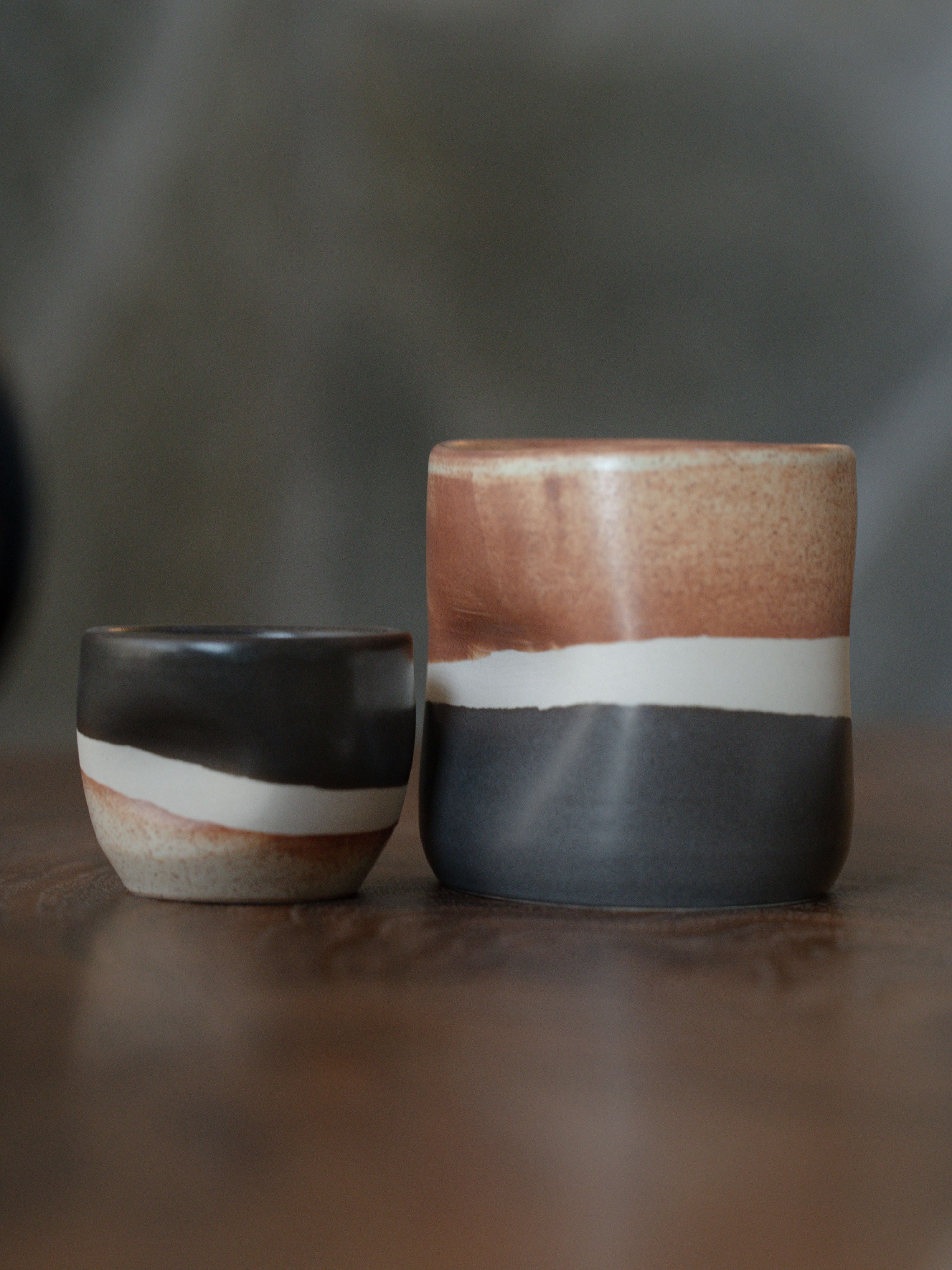 Shop our ceramic handle-less mugs handmade in Phoenix, Arizona and designed by Kaitlyn Wolfe. They feature a smooth design that ergonomically fits perfectly in your hand. With two size options, 12oz and 3oz, they make the perfect companion to your lattes, teas or espresso shots. The design was inspired by the rock layers found in Zion National Park. Don’t miss out on this limited edition design.
