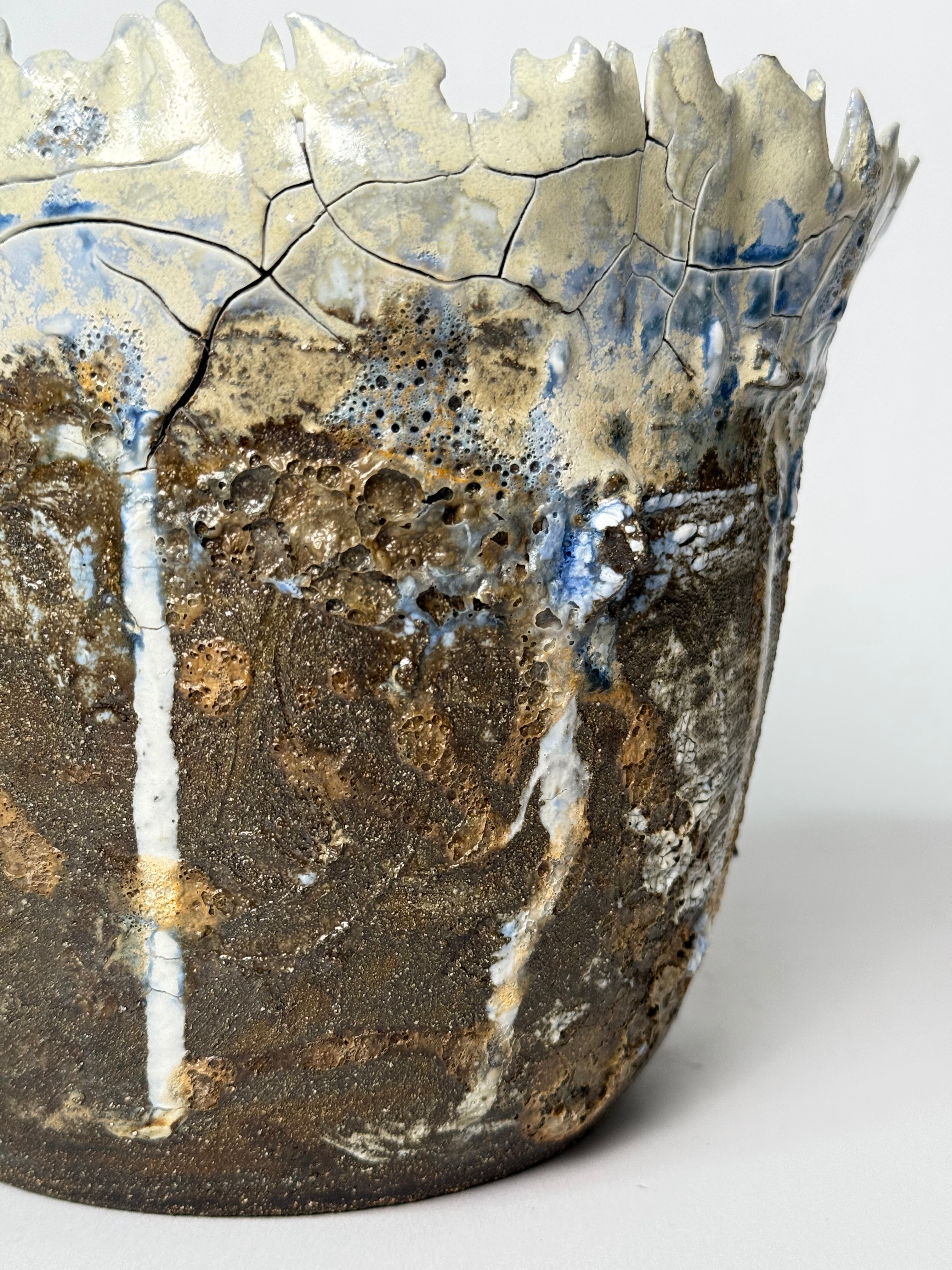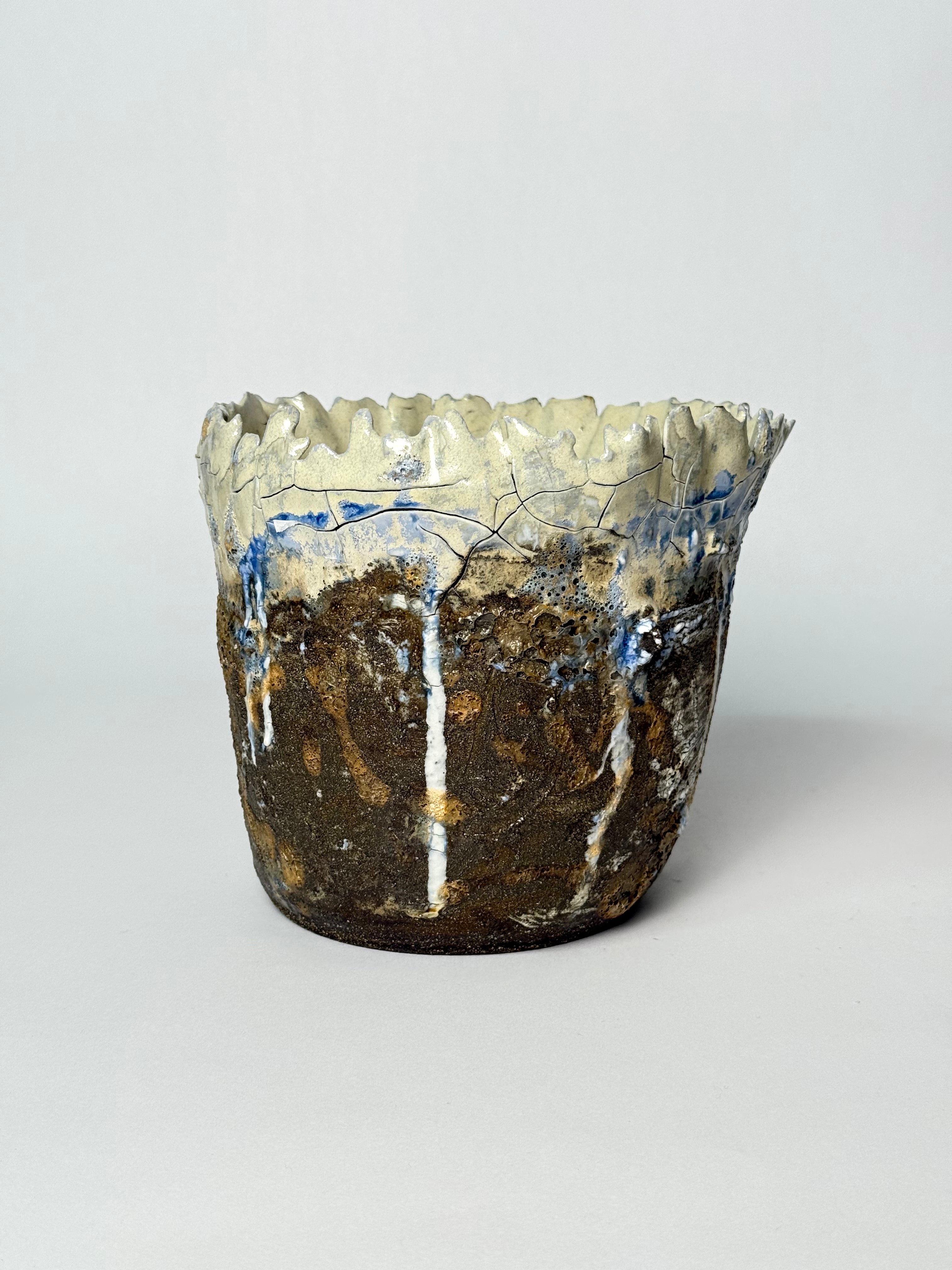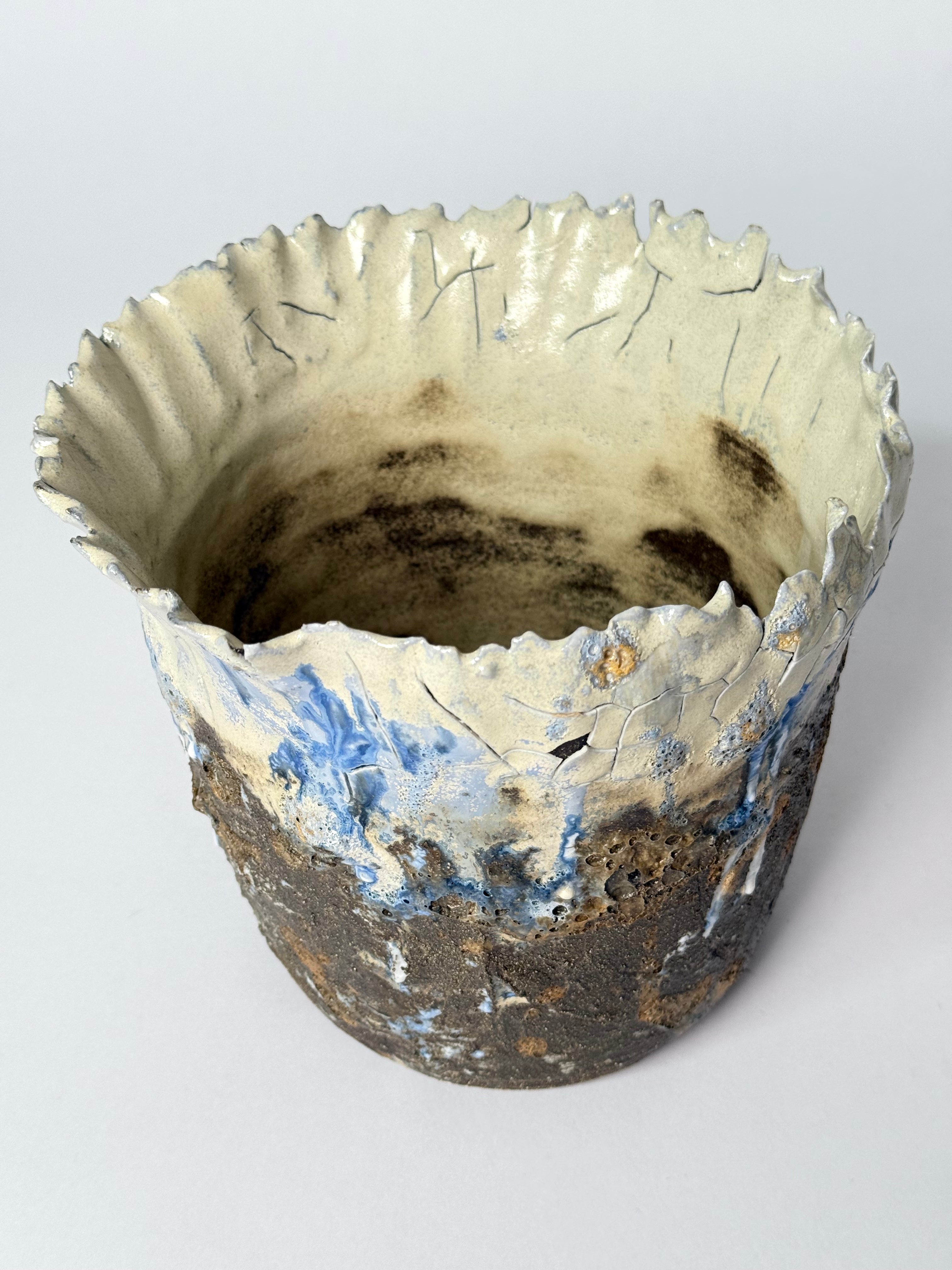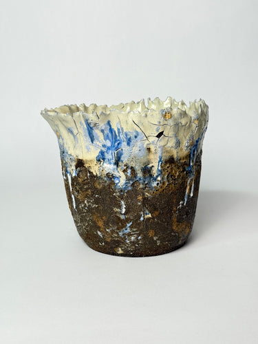 Handcrafted by Icelandic artist Hojr, this striking ceramic vessel combines a rugged, cratered base with an icy, crackled rim that resembles frozen cliffs or glacial meltwater cascading over dark volcanic rock. The vivid blues and earthy browns evoke Iceland’s powerful contrasts — where fire and ice shape the land together.