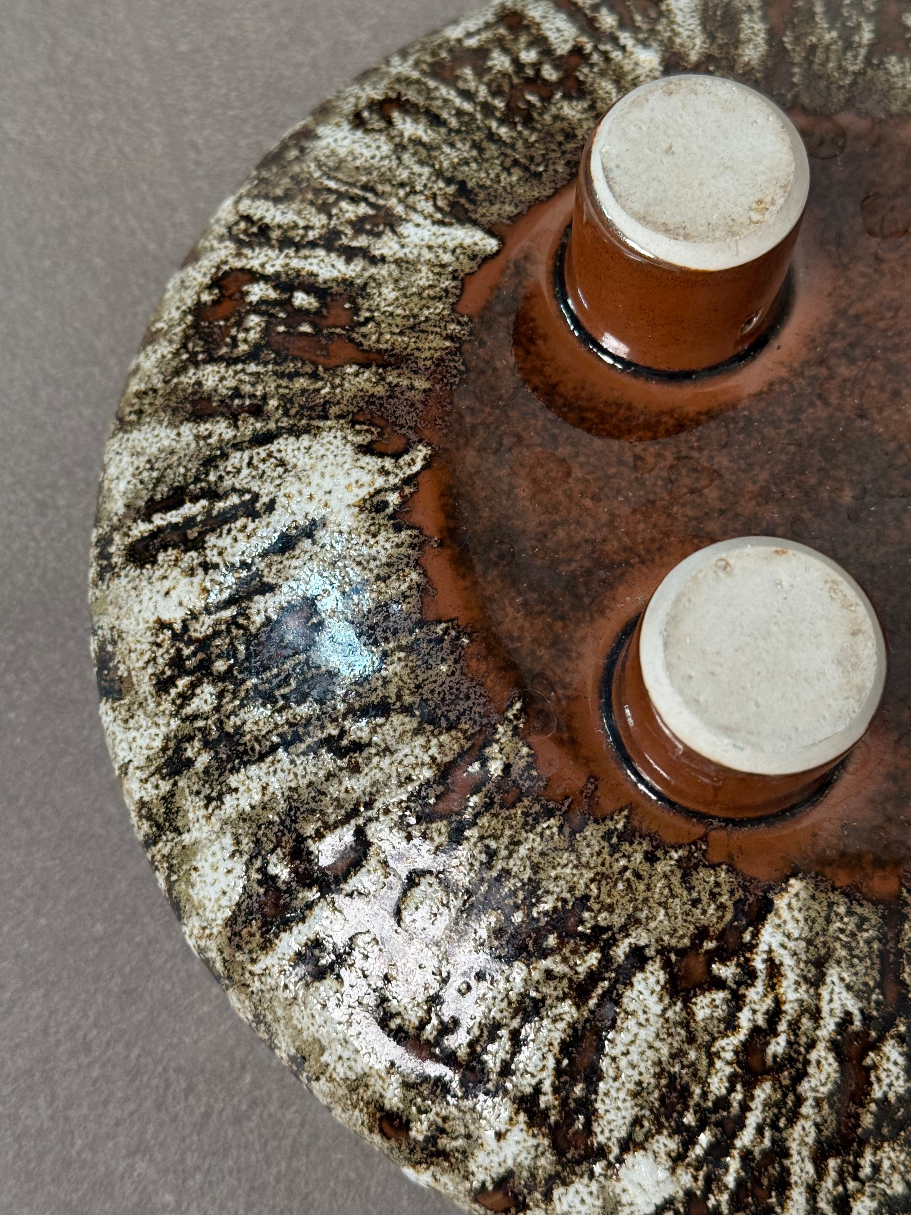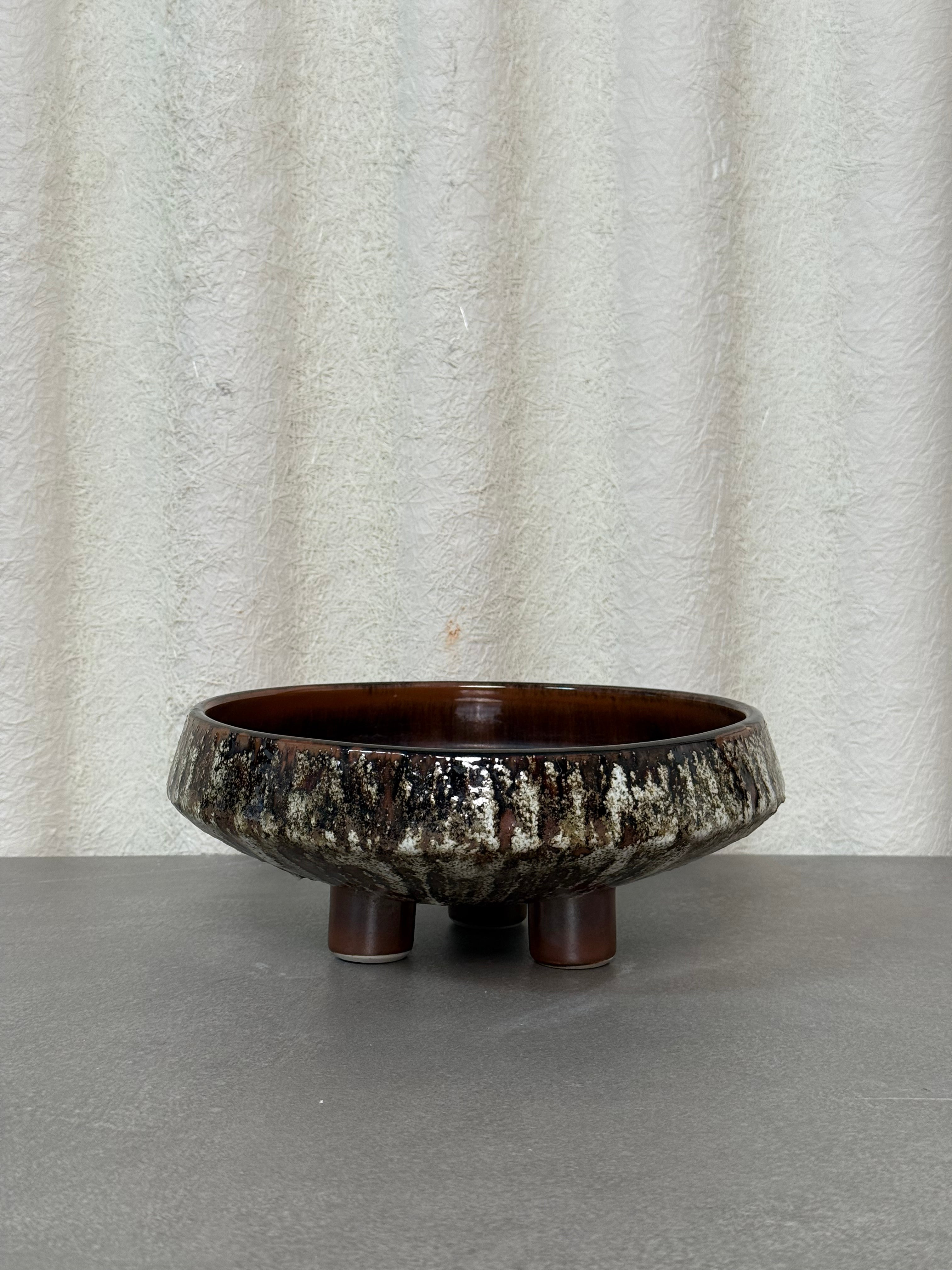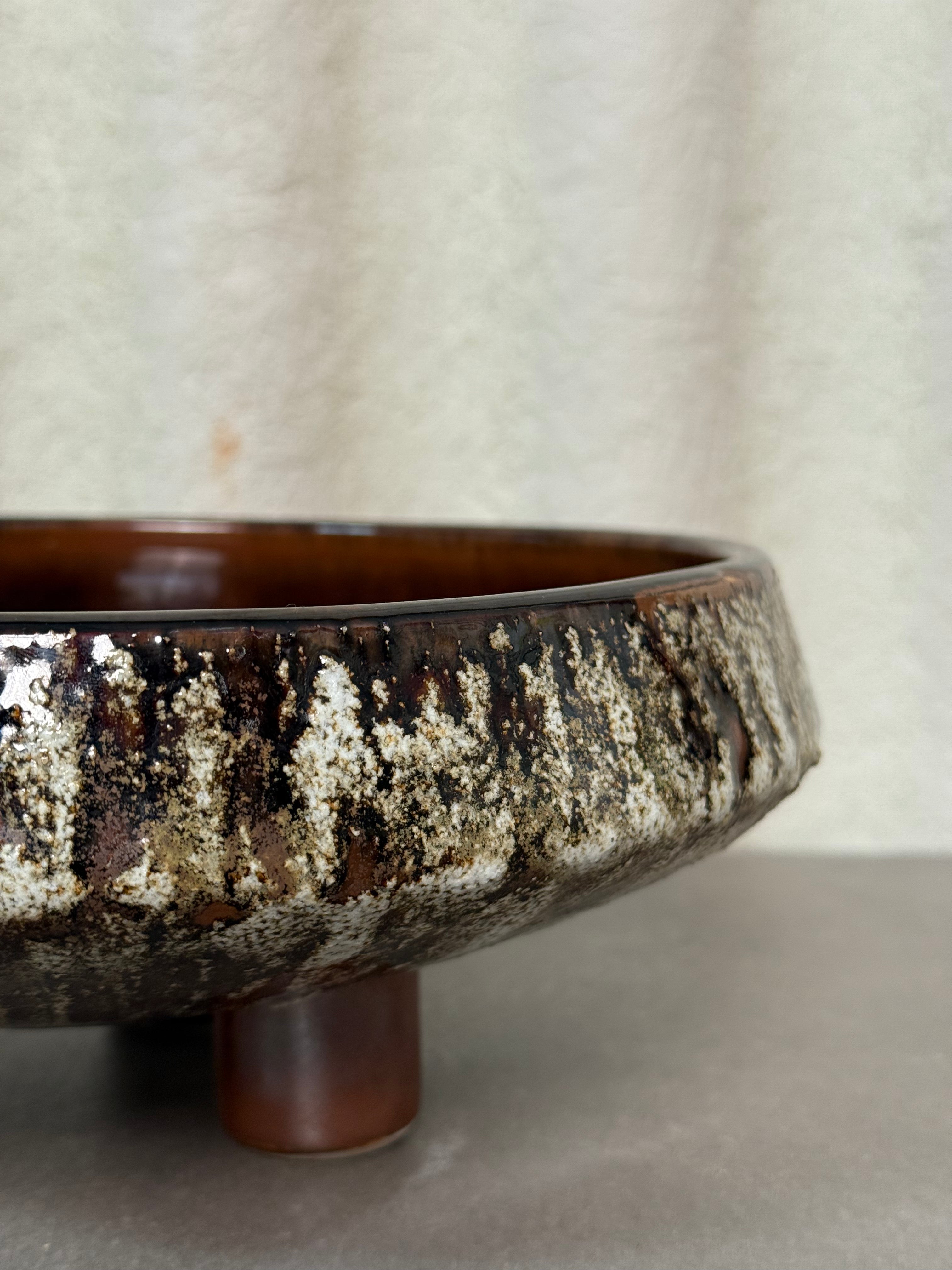 A striking vintage ceramic serving bowl with a bold glaze and tripod footed base. Perfect for entertaining, display, or as a mid-century inspired accent.