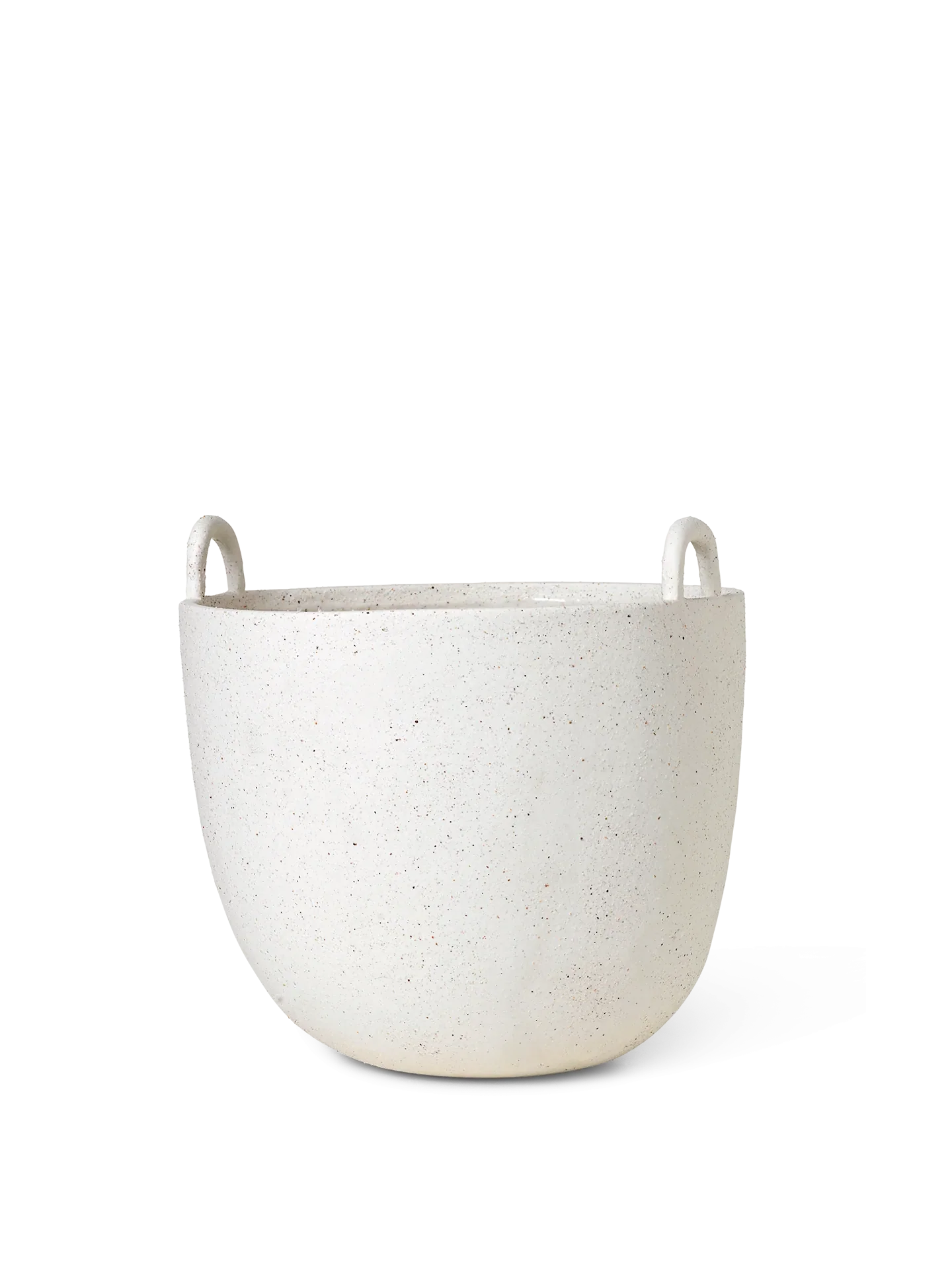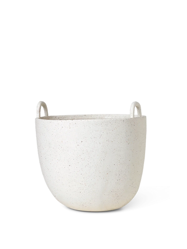 This distinctive stoneware pot is shaped in an oversized silhouette and left unglazed on the outside for a natural, speckled finish that lends a handcrafted feel to the design. The large container with handles makes an artisanal home for a large plant or a textural storage container for blankets or soft toys, as well as being a decorative object in its own right.