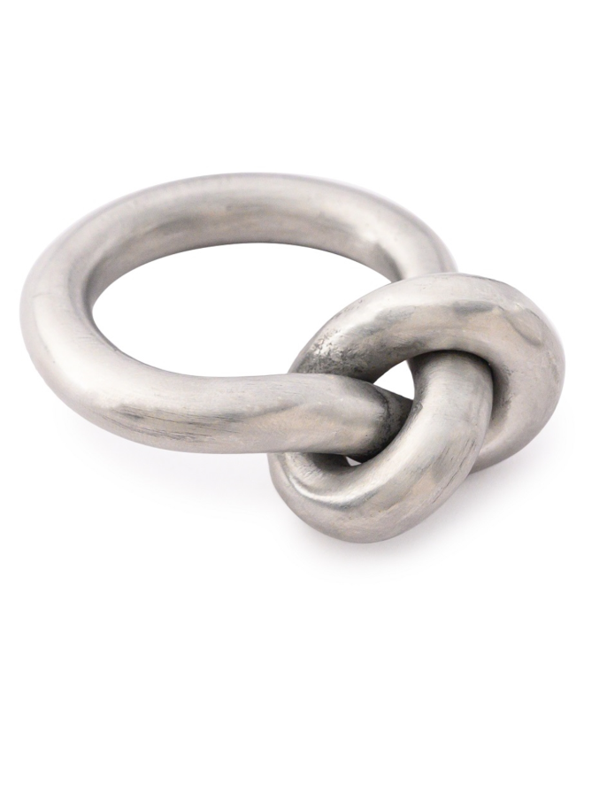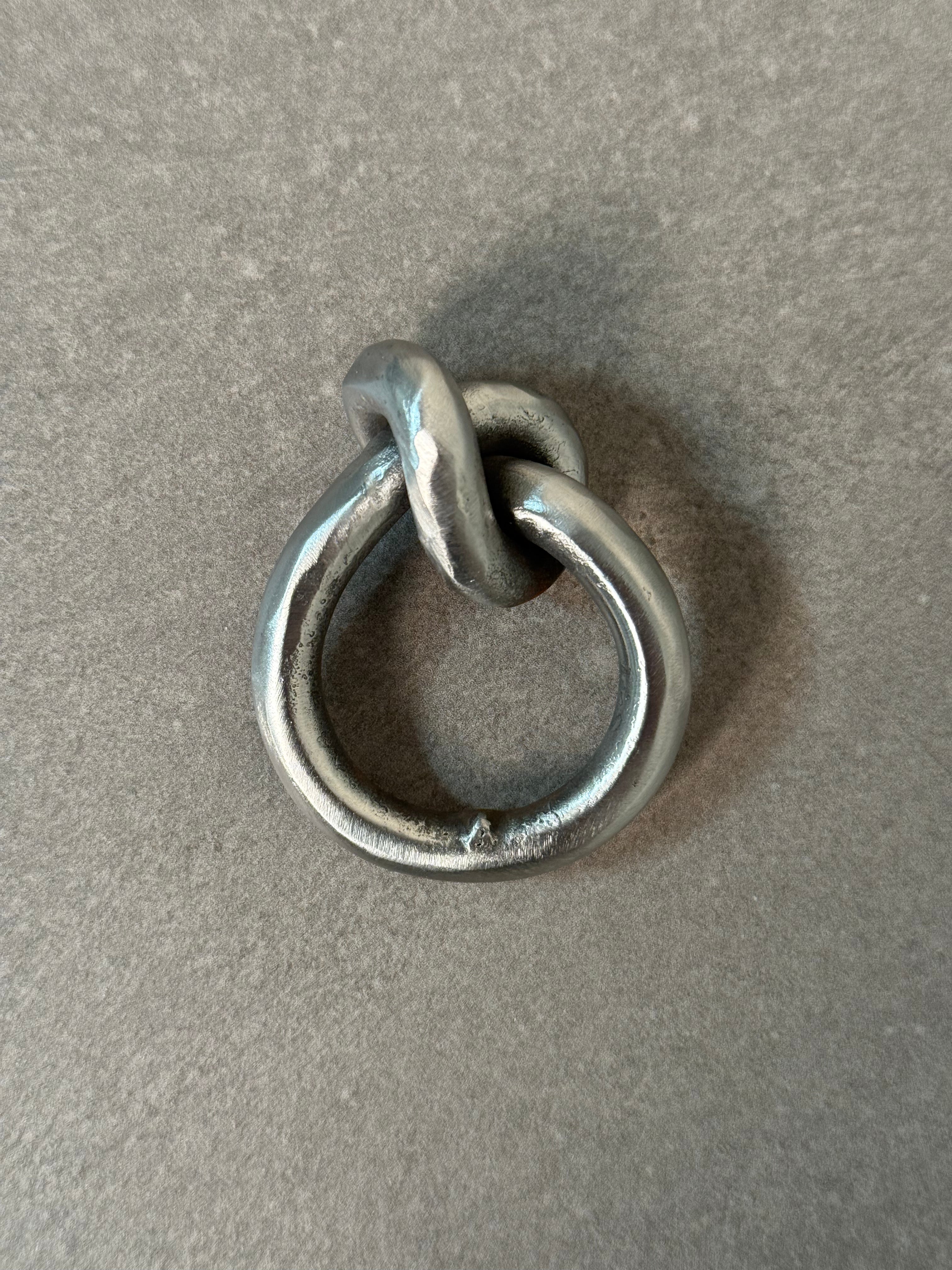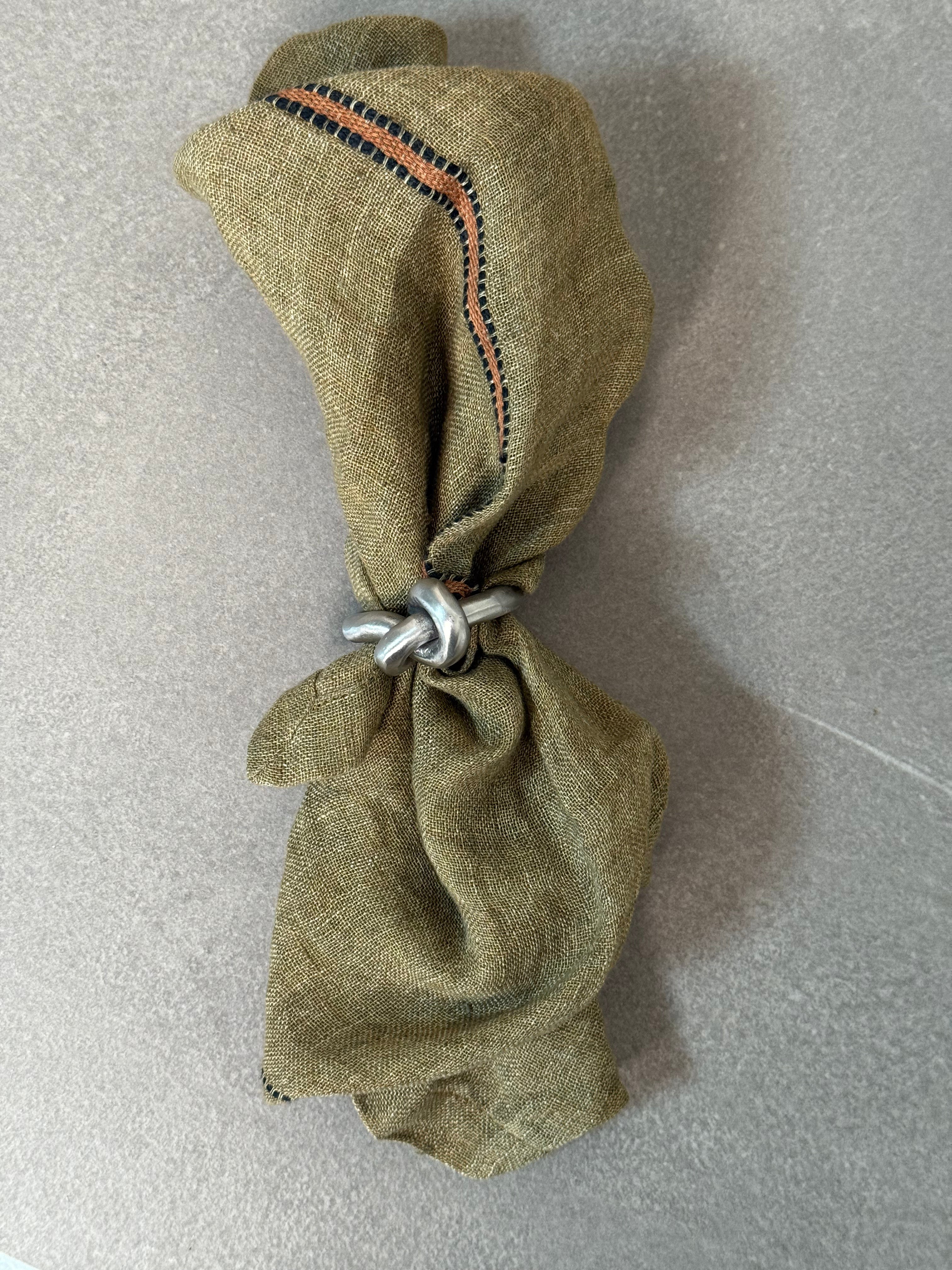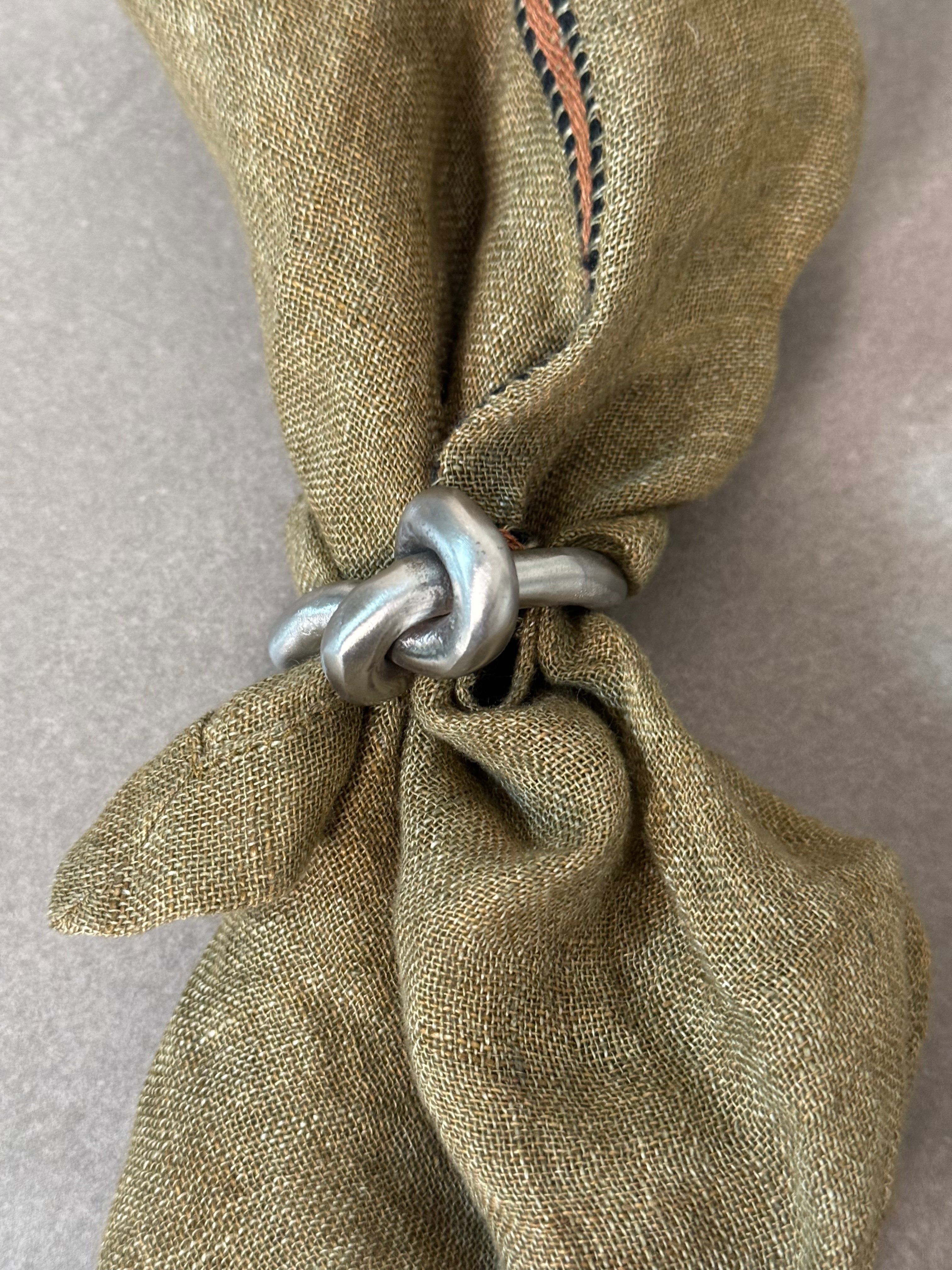 A set of four vintage steel napkin rings with sculptural knot design. Durable and stylish, perfect for adding an industrial-chic touch to your table setting.