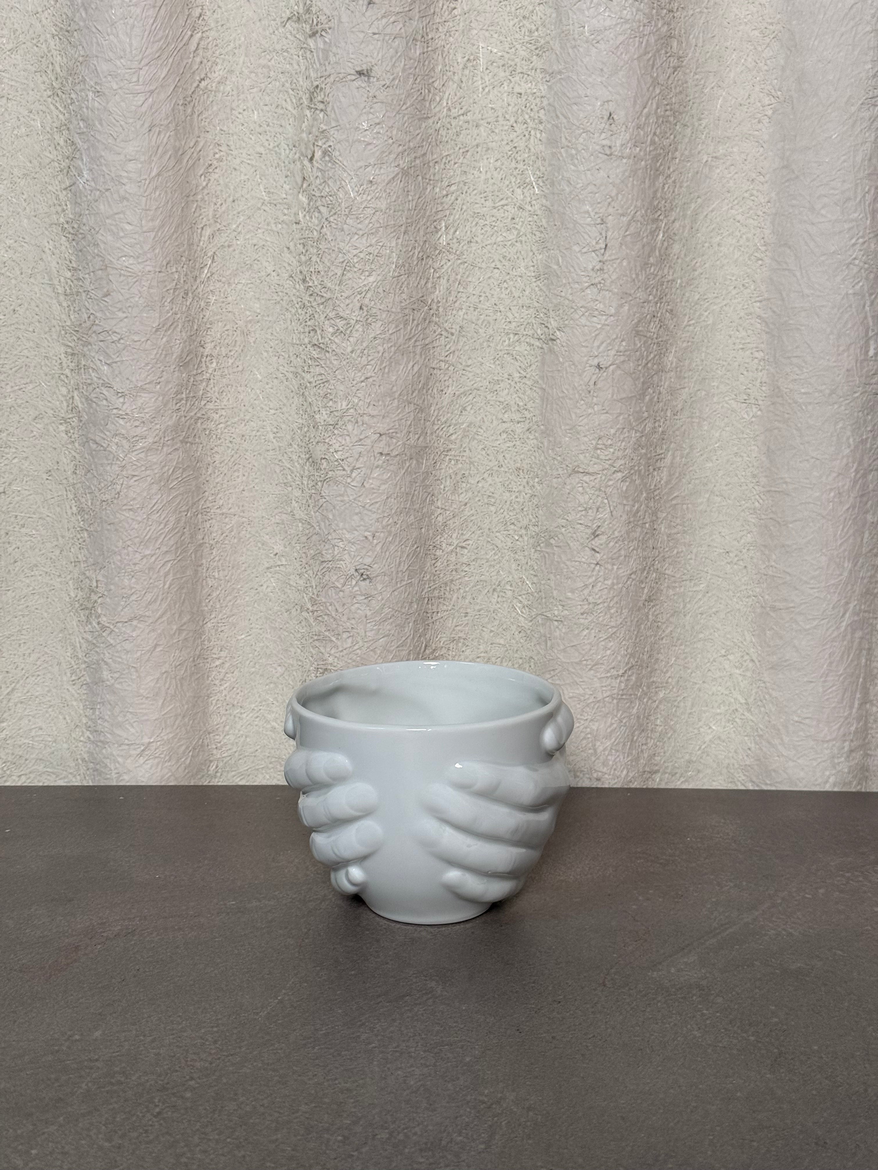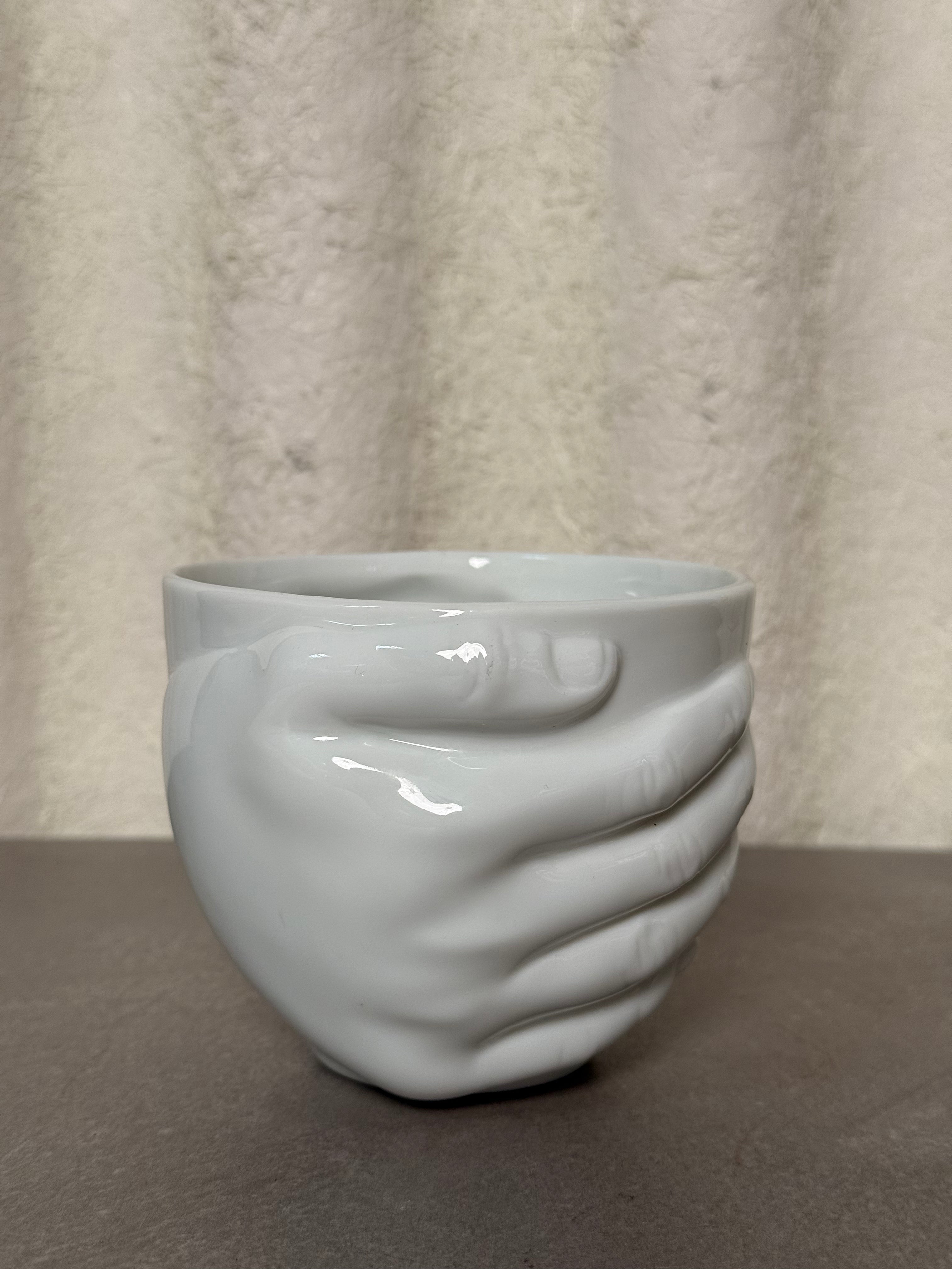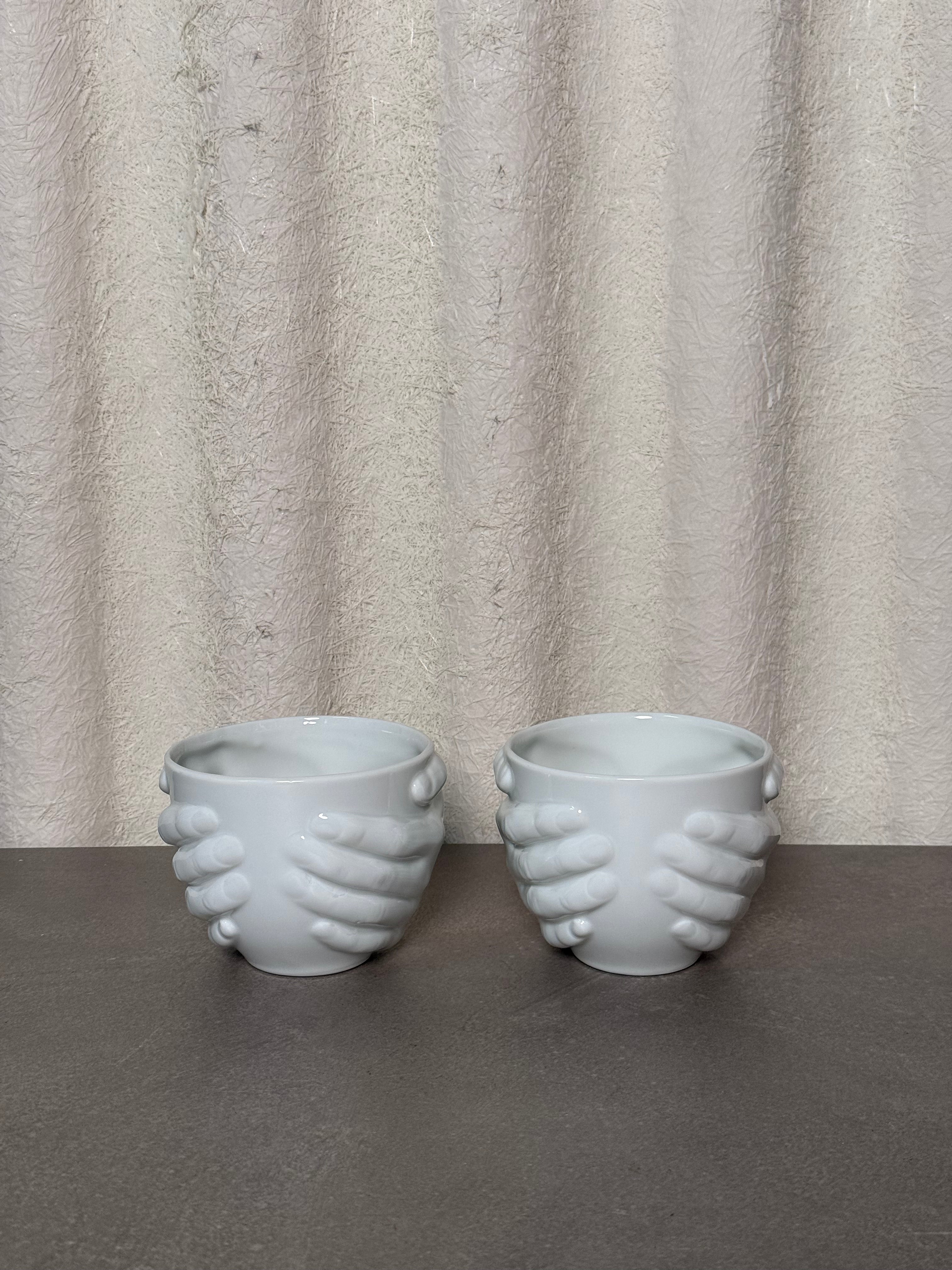 A playful and sculptural pair of ceramic mugs featuring raised hands wrapped around each cup, giving the illusion of being held while you hold them. Finished in a glossy white glaze that highlights the detailed finger forms, these pieces strike a balance between whimsy and modern design. Perfect as functional drinkware or as quirky decorative accents on open shelving.