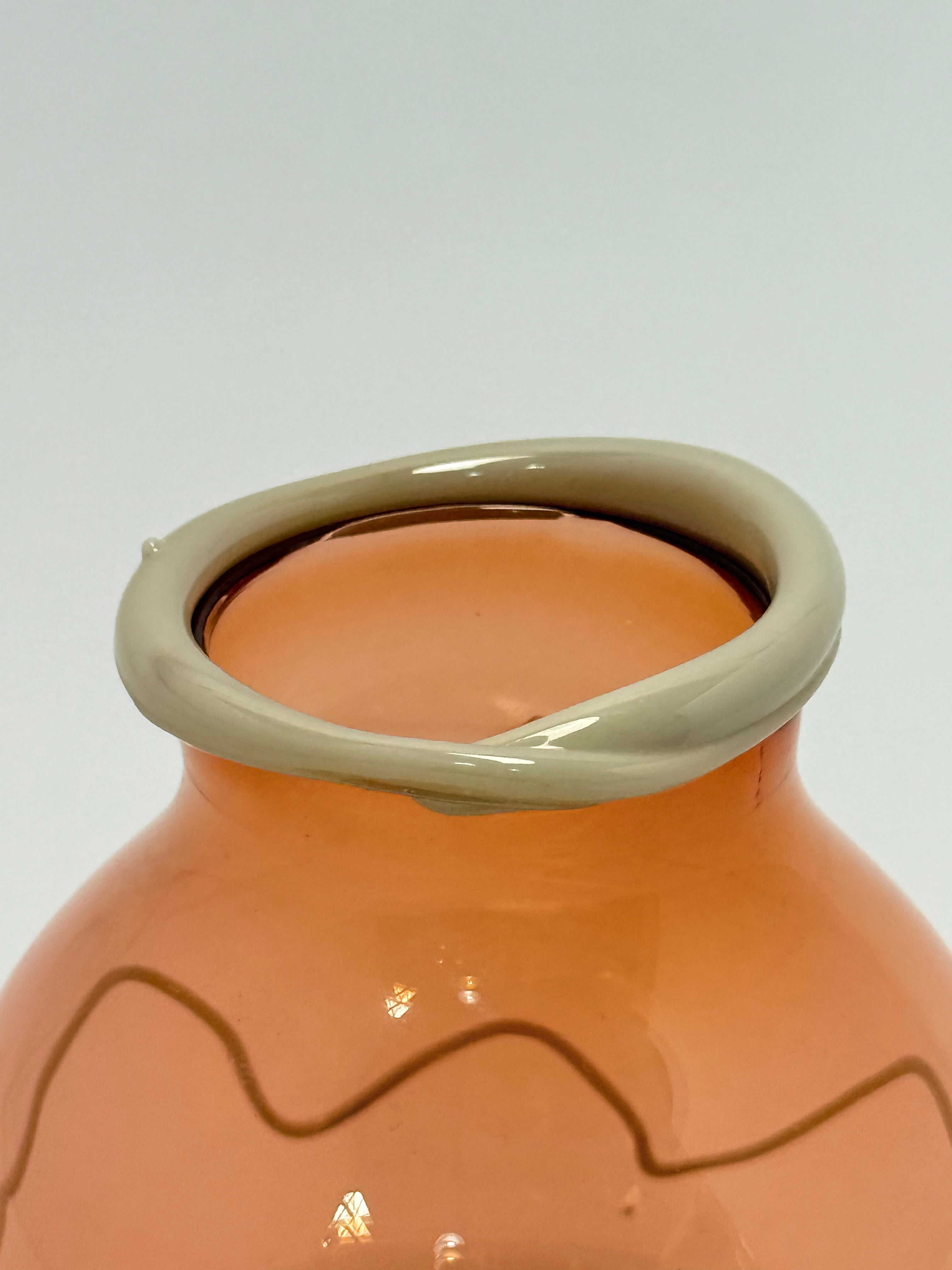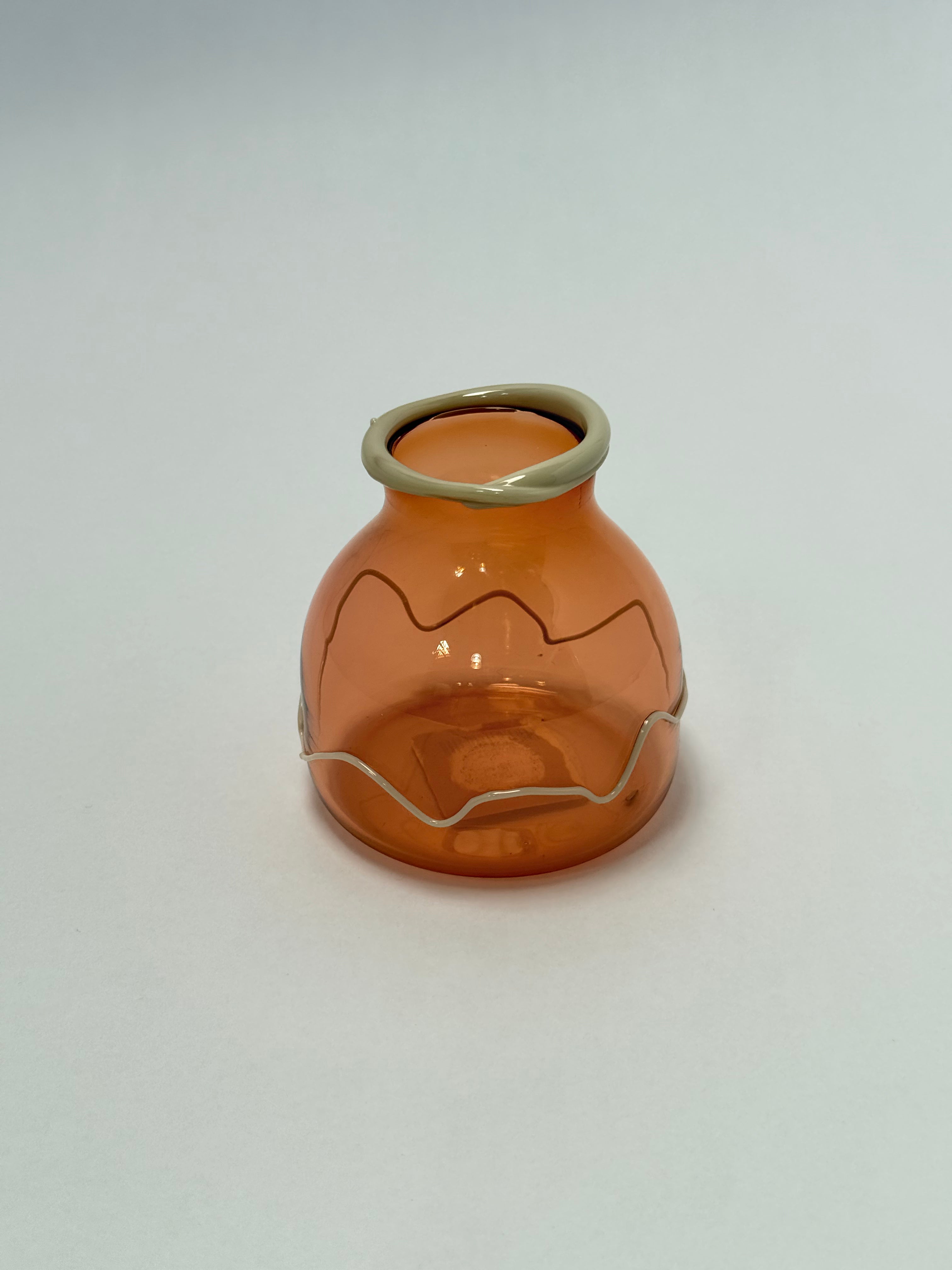 A hand-blown glass series by Cribbe Eriksson exploring the tension between fluid form and graphic line—each piece shaped by the landscapes, light, and color palettes of the Nordic coast. Sun-warmed glass in a soft amber hue, finished with a pale rim and flowing linework. A warm, earthy piece that feels both playful and timeless.