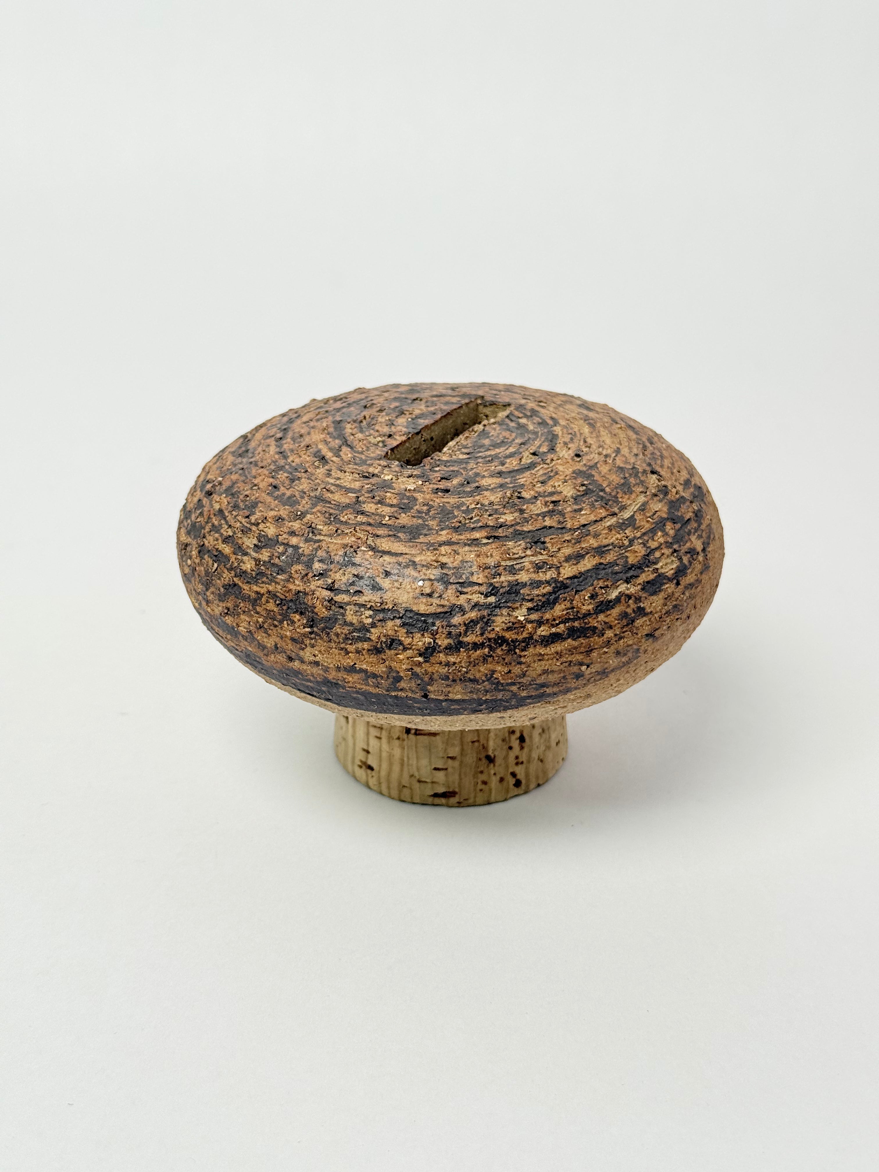 Coin bank featuring a rounded, dome-like form with visible concentric grain patterns across the top surface. Natural variation in grain, tone, and surface texture.