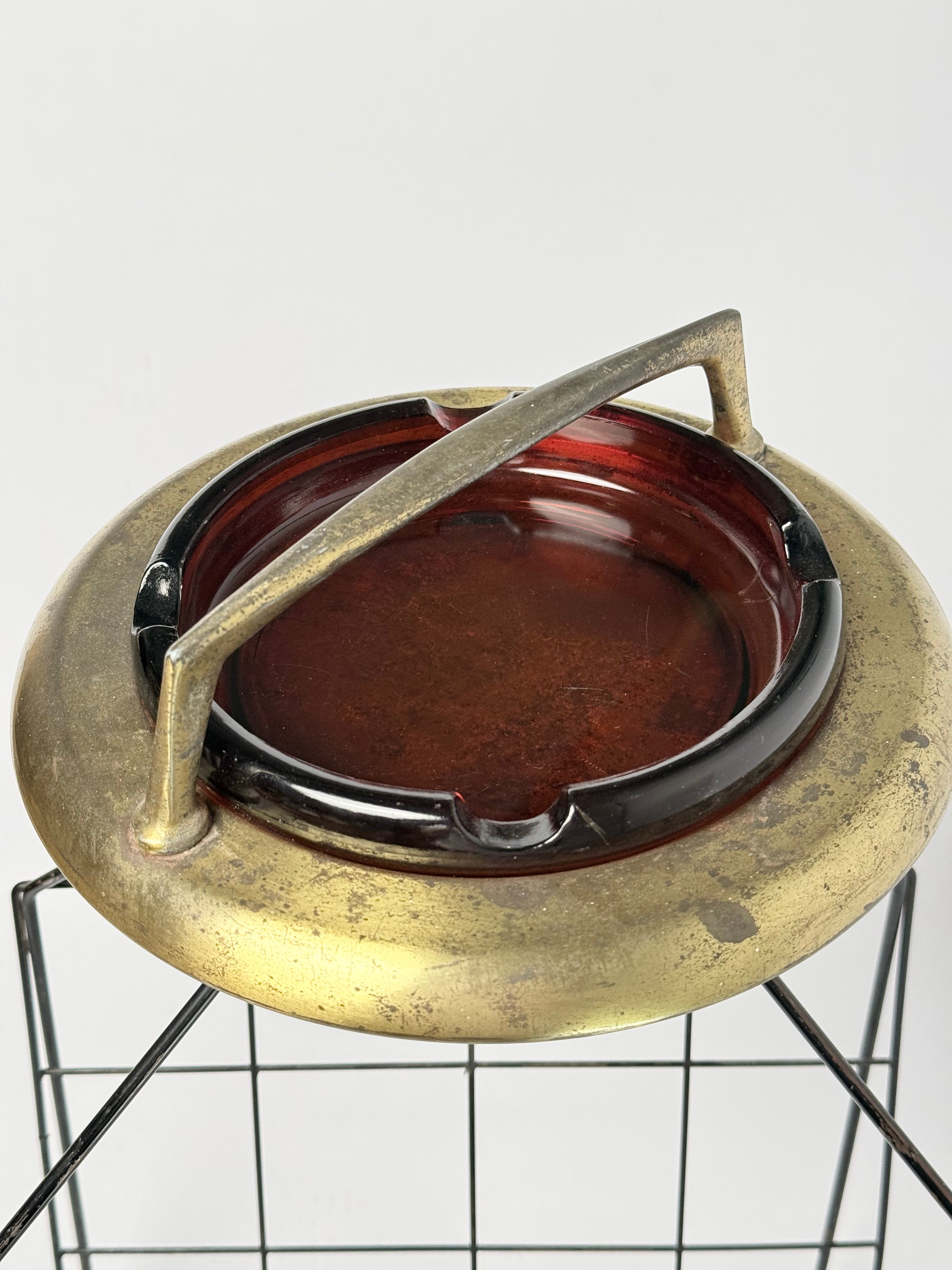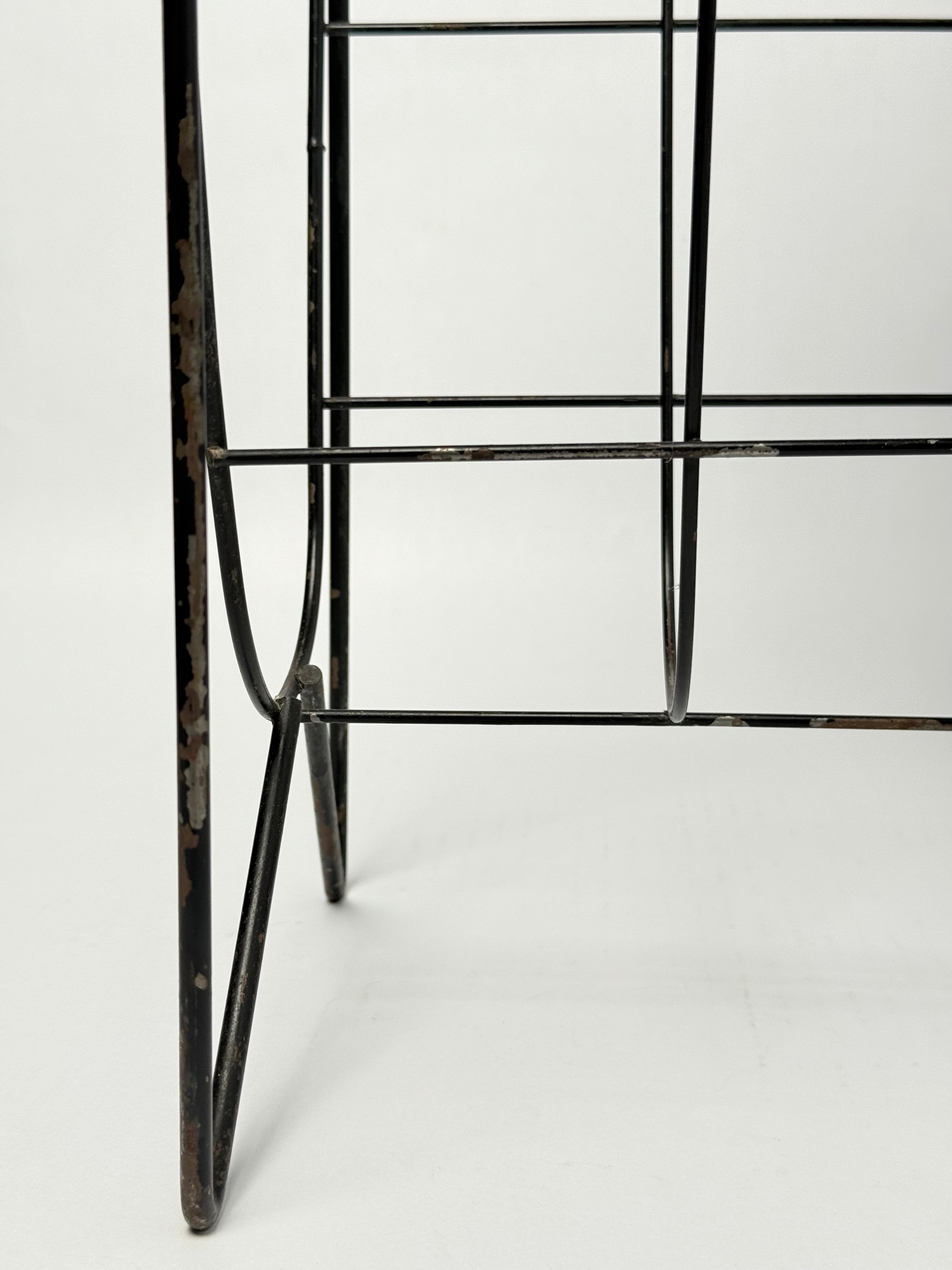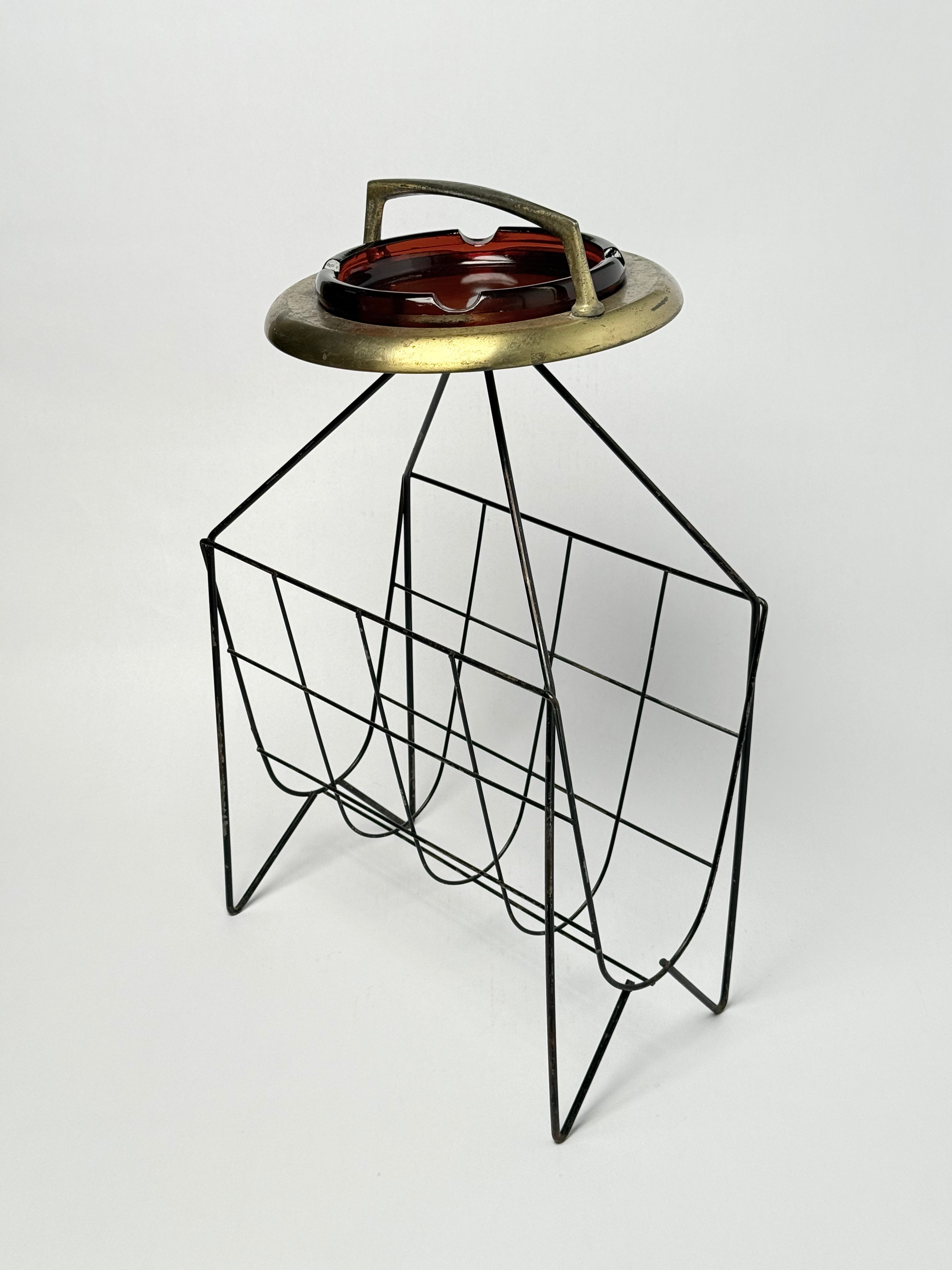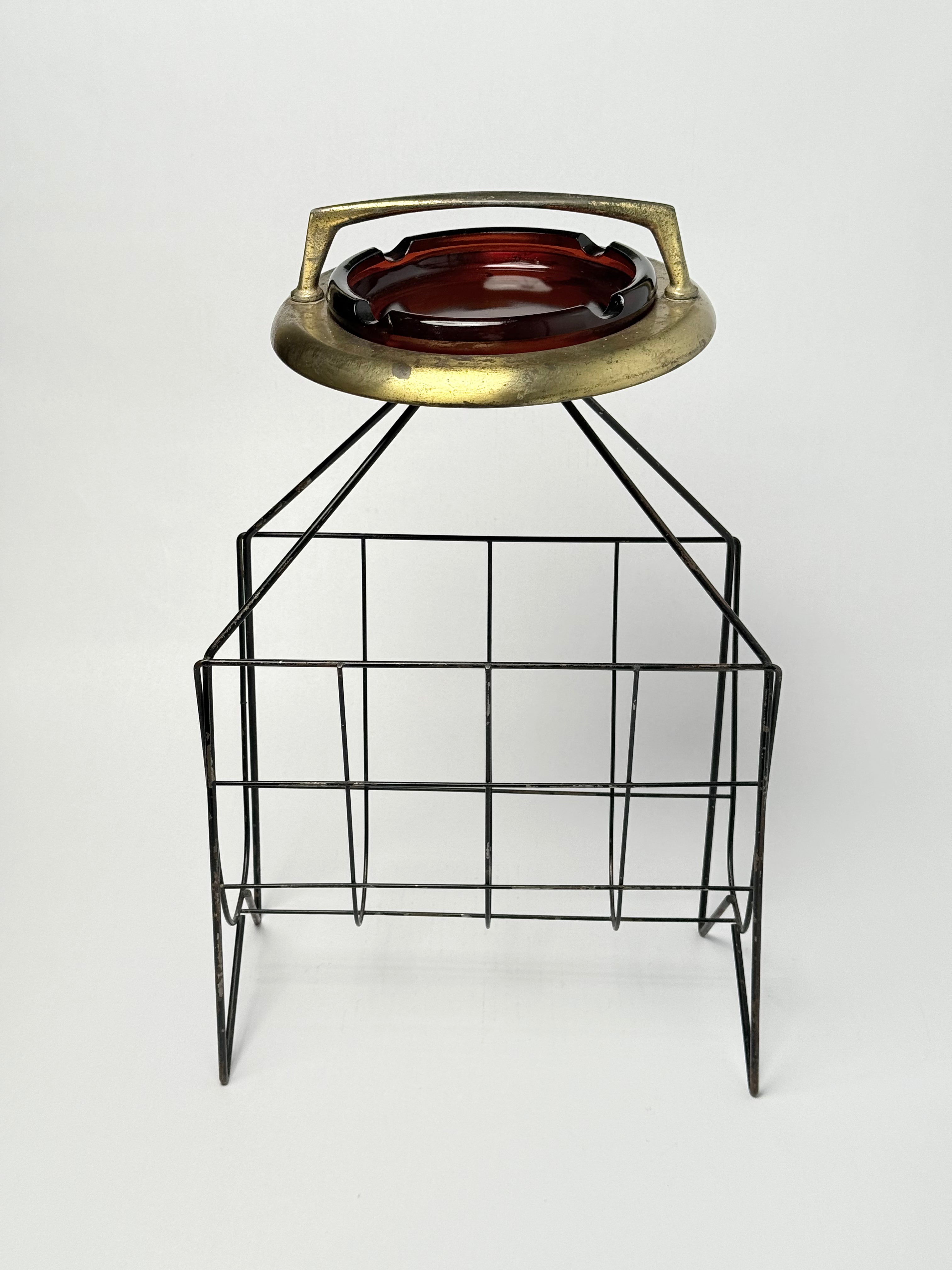 A mid-century metal magazine holder featuring an elevated brass-finish ashtray top and geometric wire base. Perfect as a functional accent piece or retro décor for living rooms, lounges, or smoking areas. Unique patina and sculptural form make it a standout collectible for vintage design lovers.
