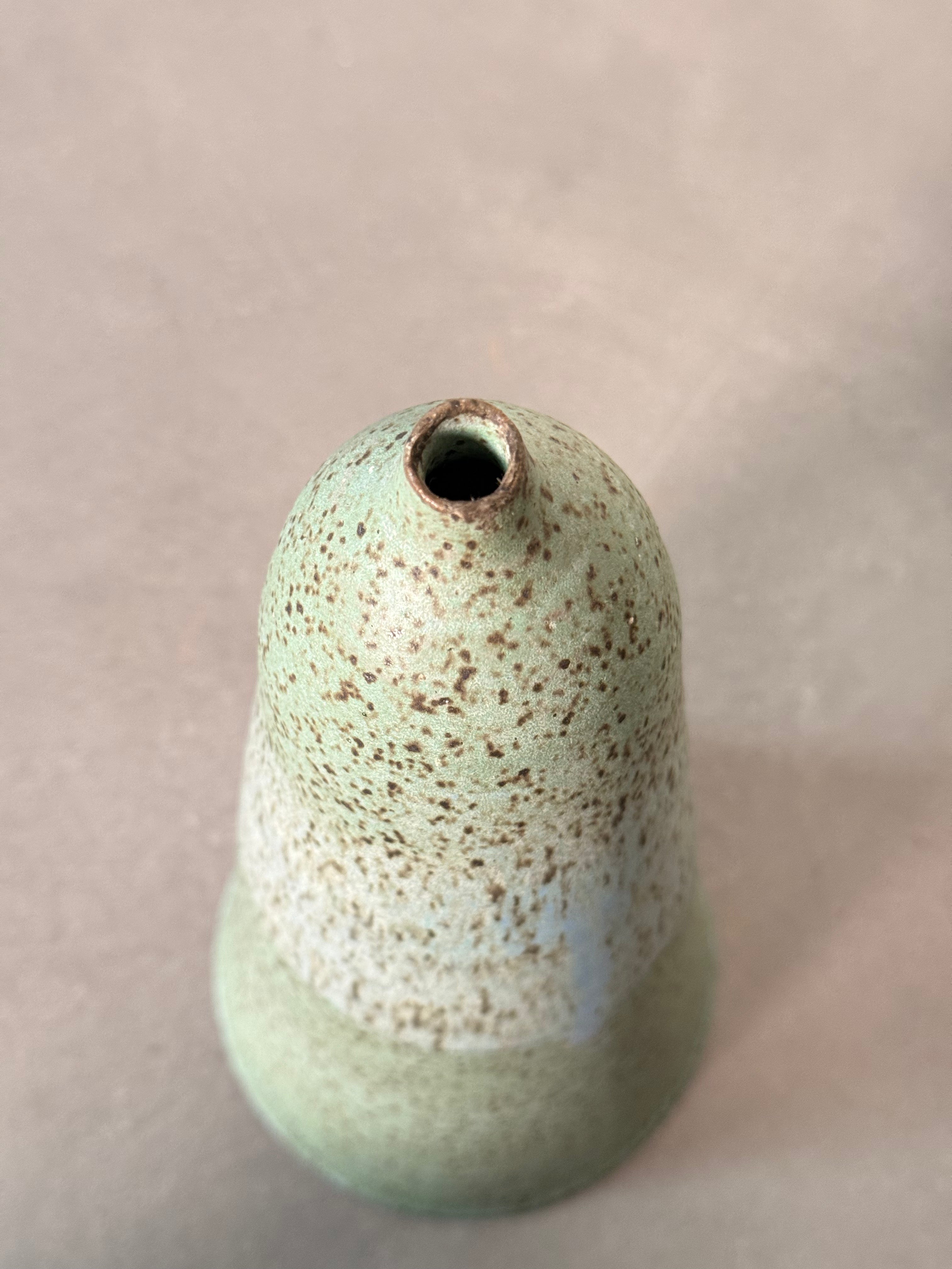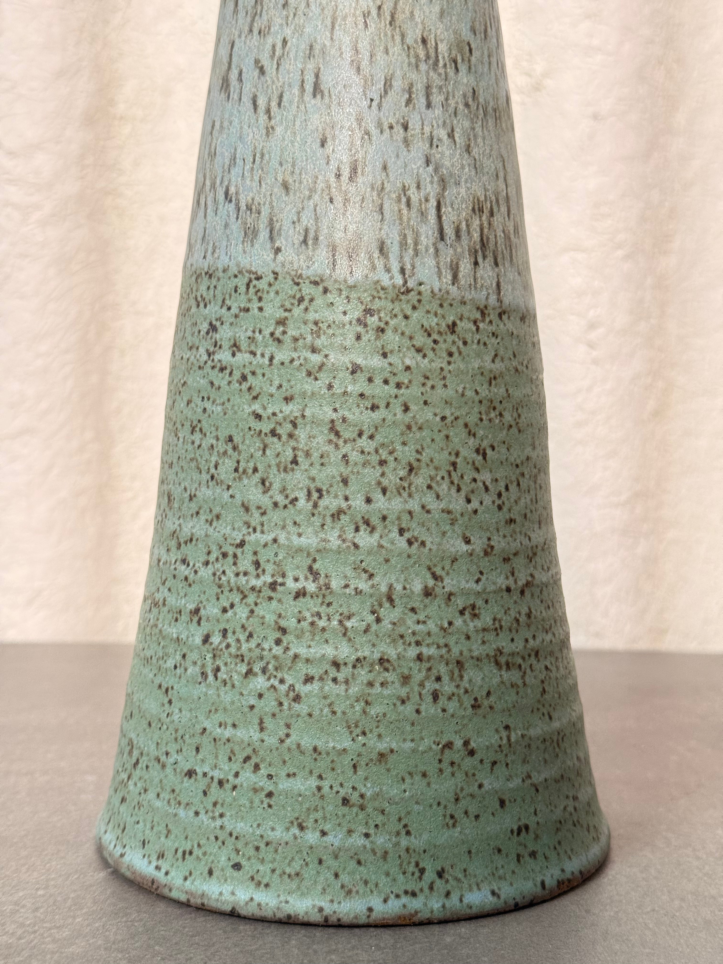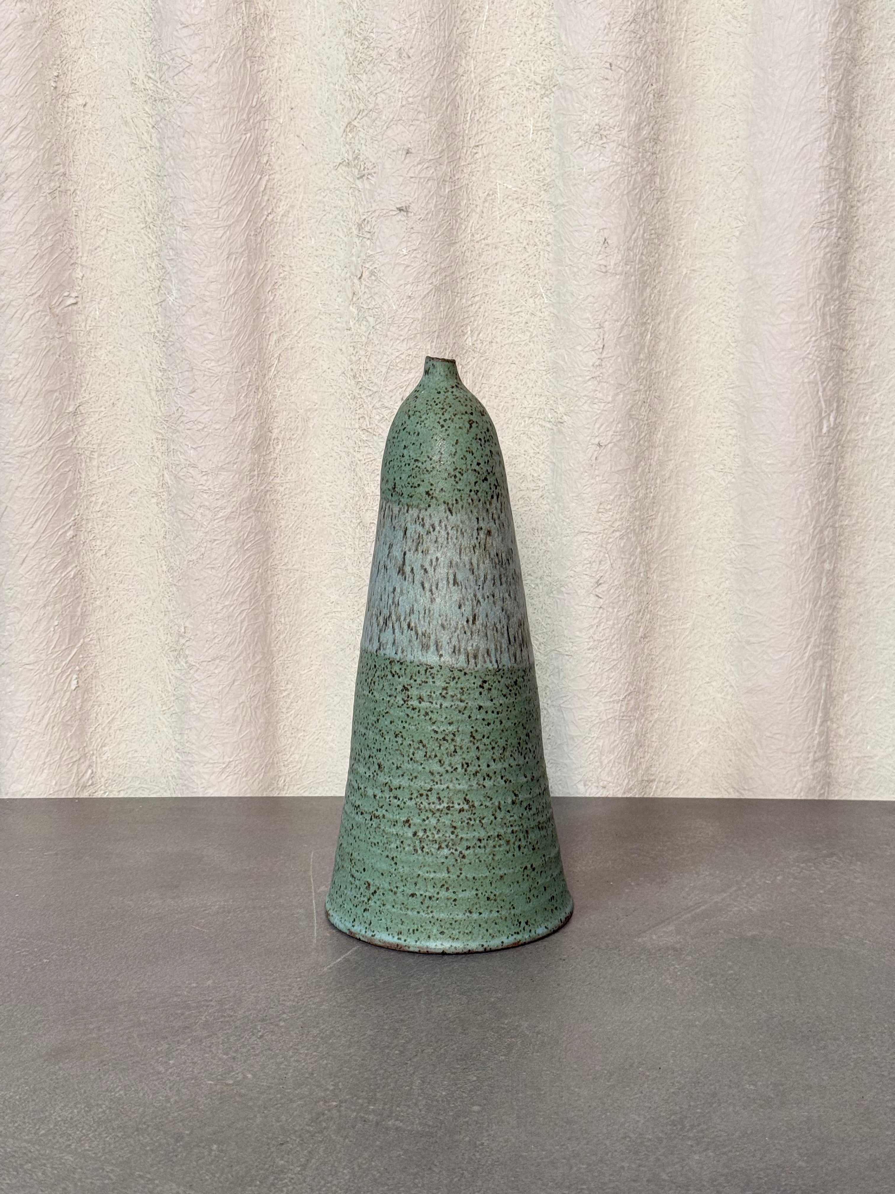 Tall, sculptural MCM vase with a tapered cone silhouette and speckled green glaze. Subtle two-tone texture adds depth and character. A clean, organic form—perfect as a standalone piece or paired with dried stems.