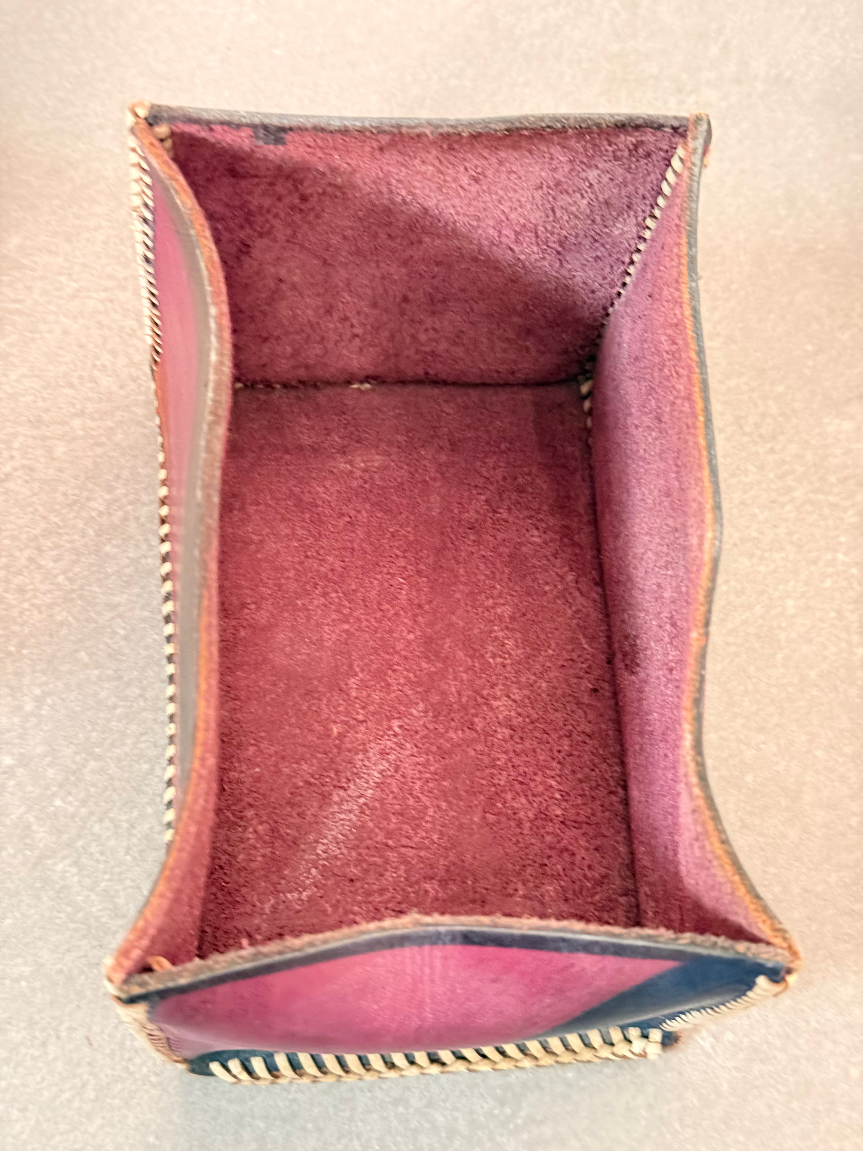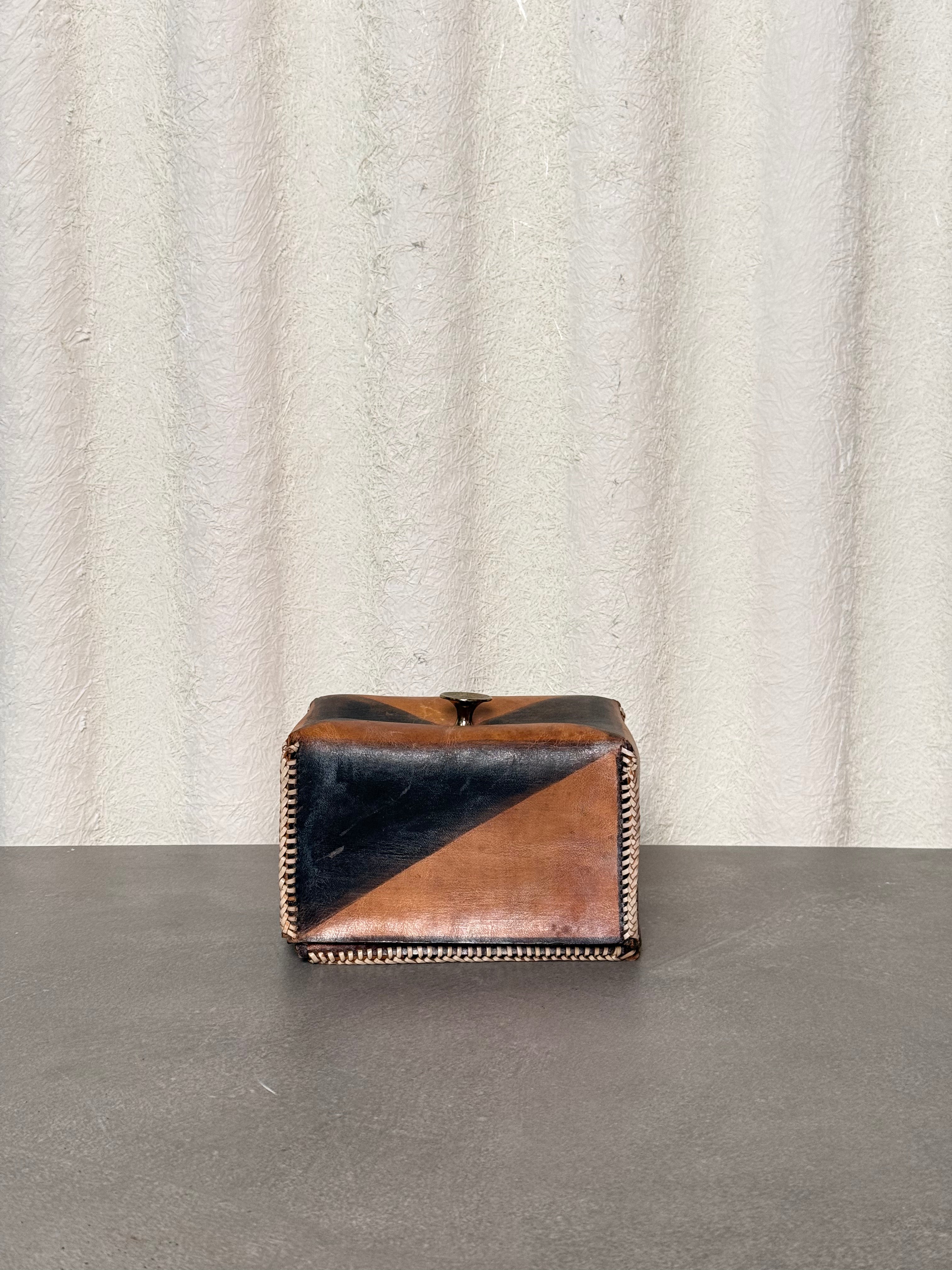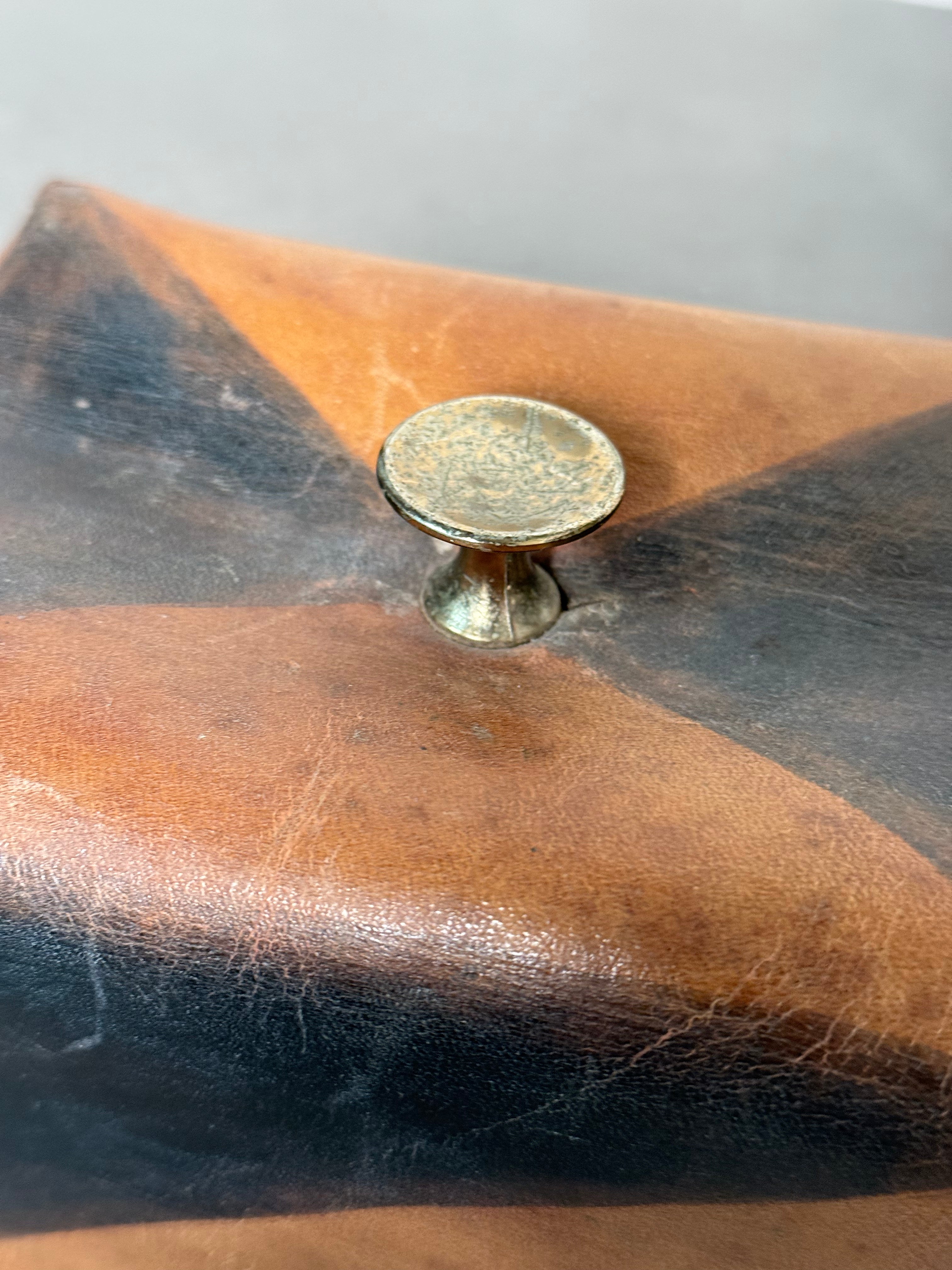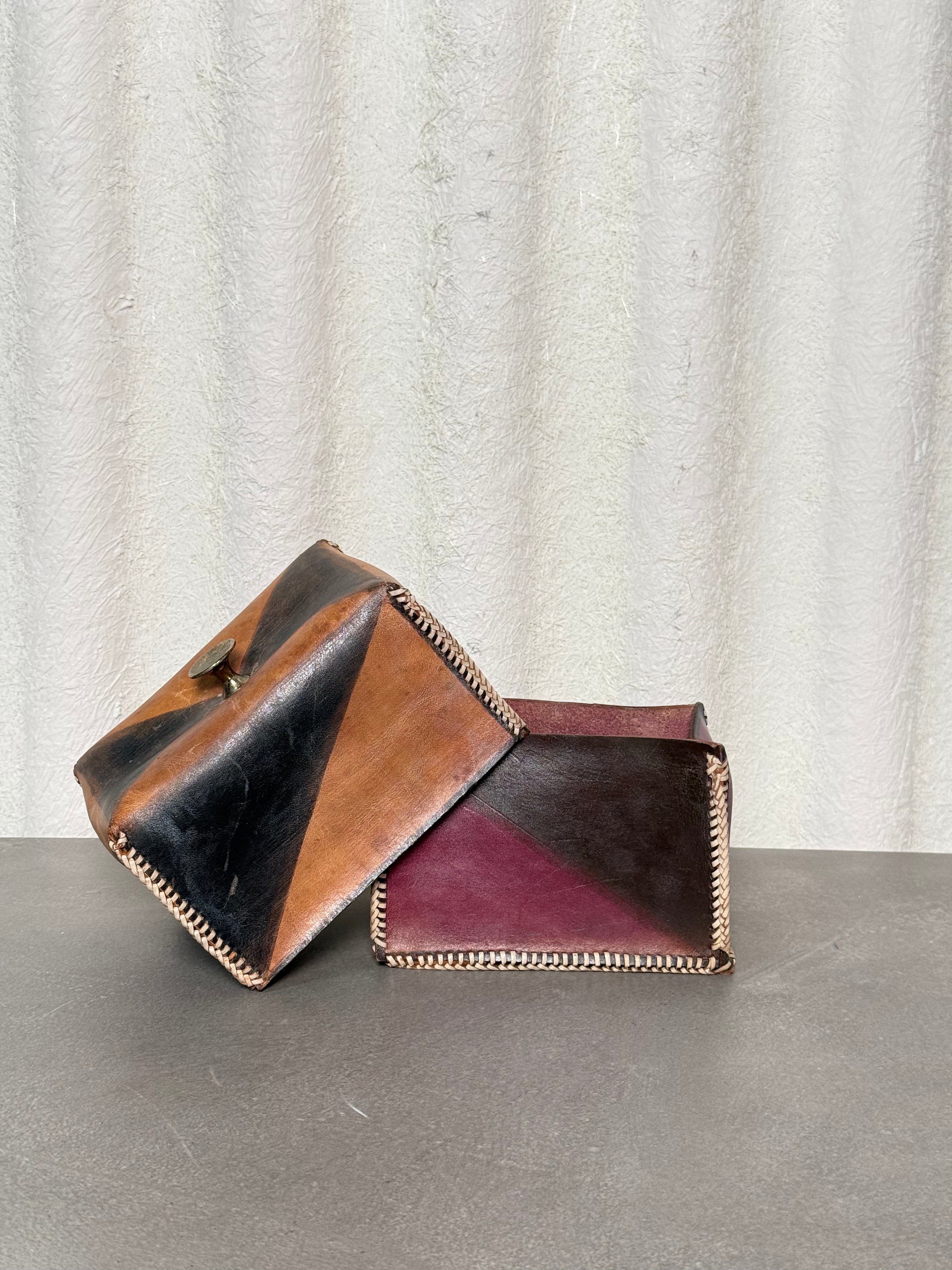 This vintage handmade leather rectangle box combines artisanal craftsmanship with striking design. Featuring a geometric black triangle pattern, a gold round knob on the lid, and leather-stitched corners, it exudes timeless elegance. The interior is lined with rich red suede, perfect for storing jewelry, keepsakes, or collectibles. A unique statement piece that blends functionality with artistic flair.