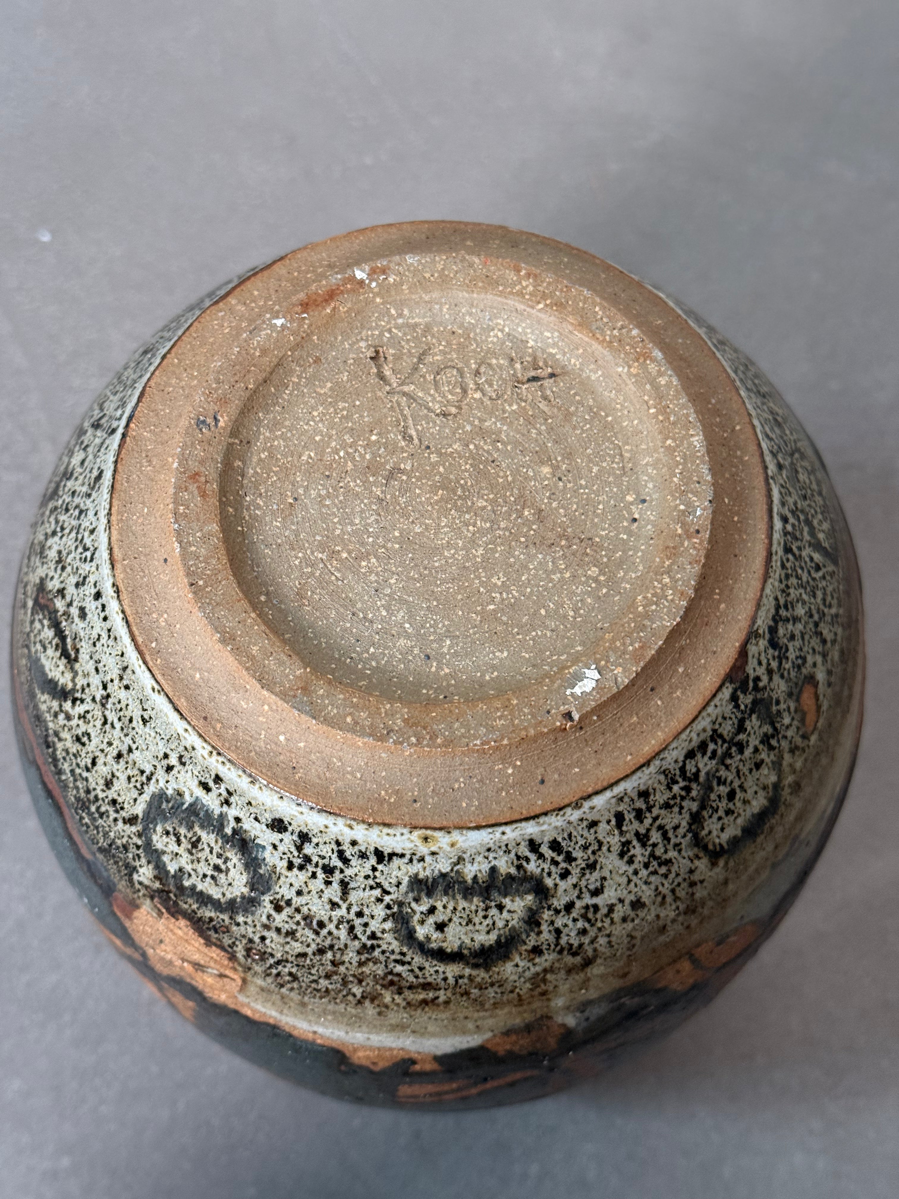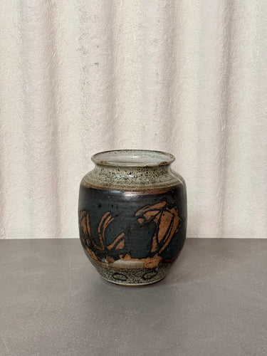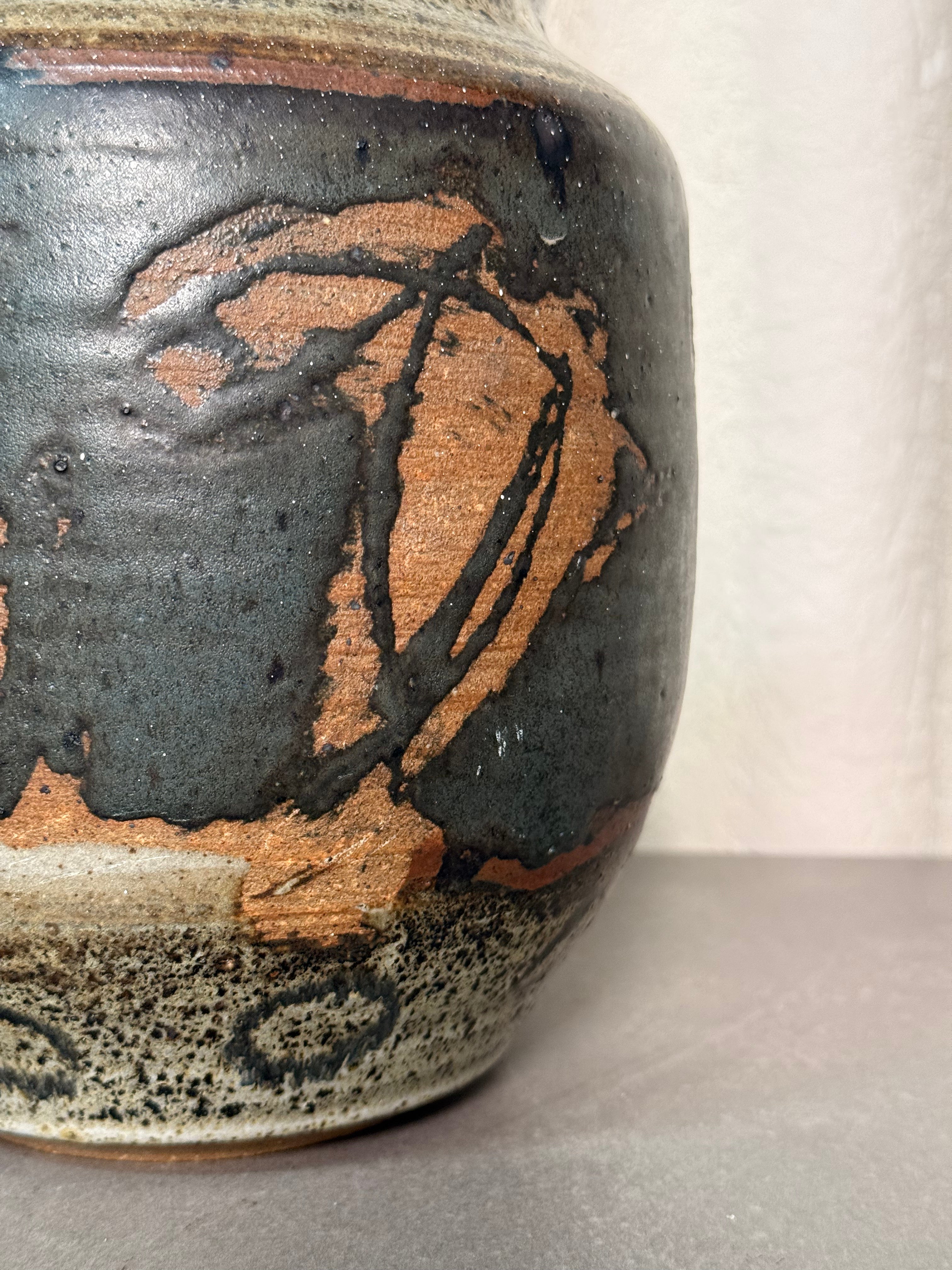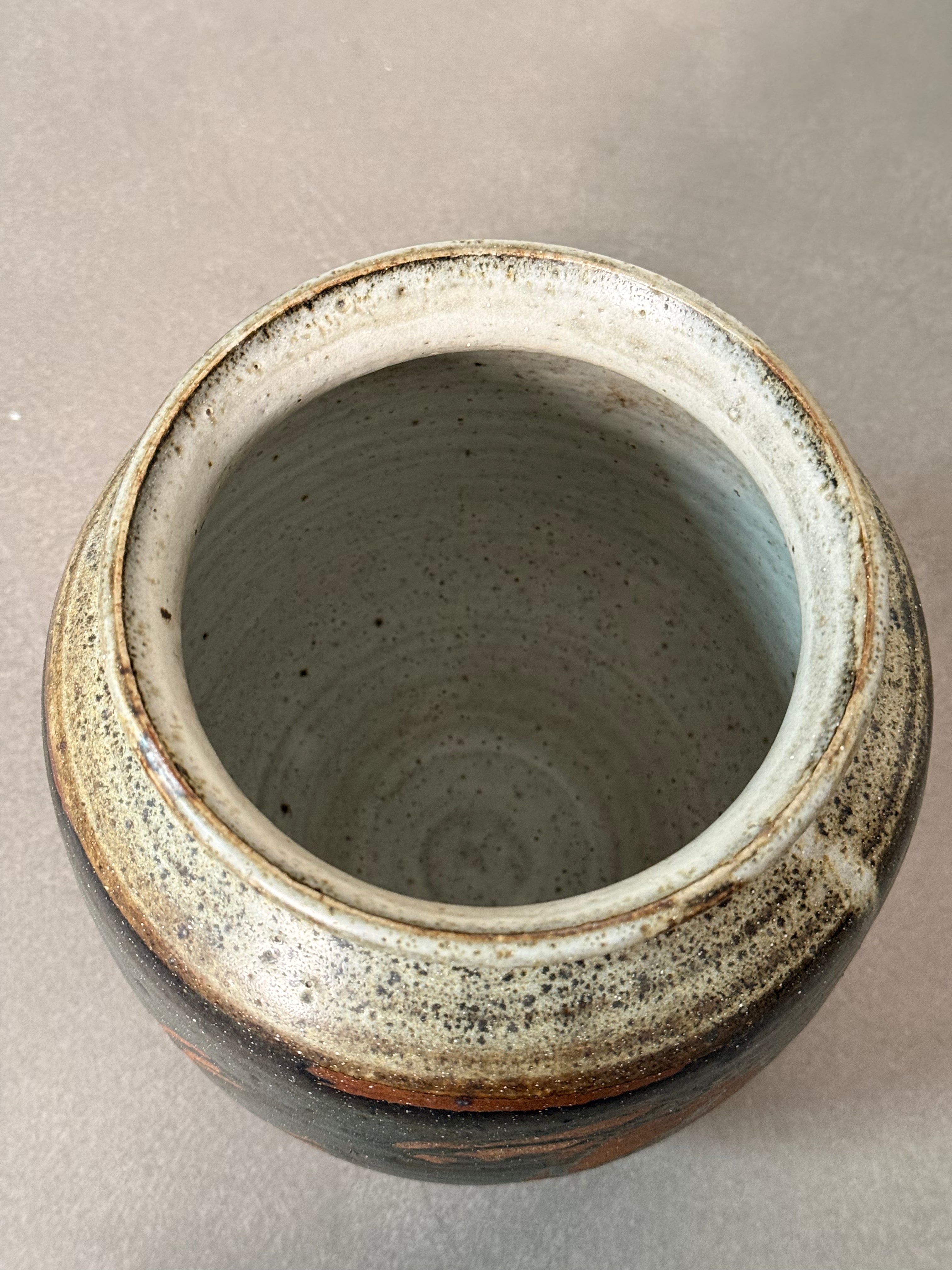 Hand-thrown MCM vase featuring a speckled glaze, earthy charcoal and rust tones, and abstract carved brushwork. Signed by the artist on the base. A timeless studio pottery piece with rich texture and classic mid-century character.