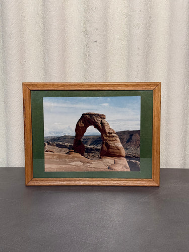 Vintage framed photograph of Delicate Arch in Arches National Park, Utah. Displayed in a natural oak frame with a deep green matte, this piece captures the timeless beauty of the American Southwest—perfect for rustic, nature-inspired, or travel-themed interiors.