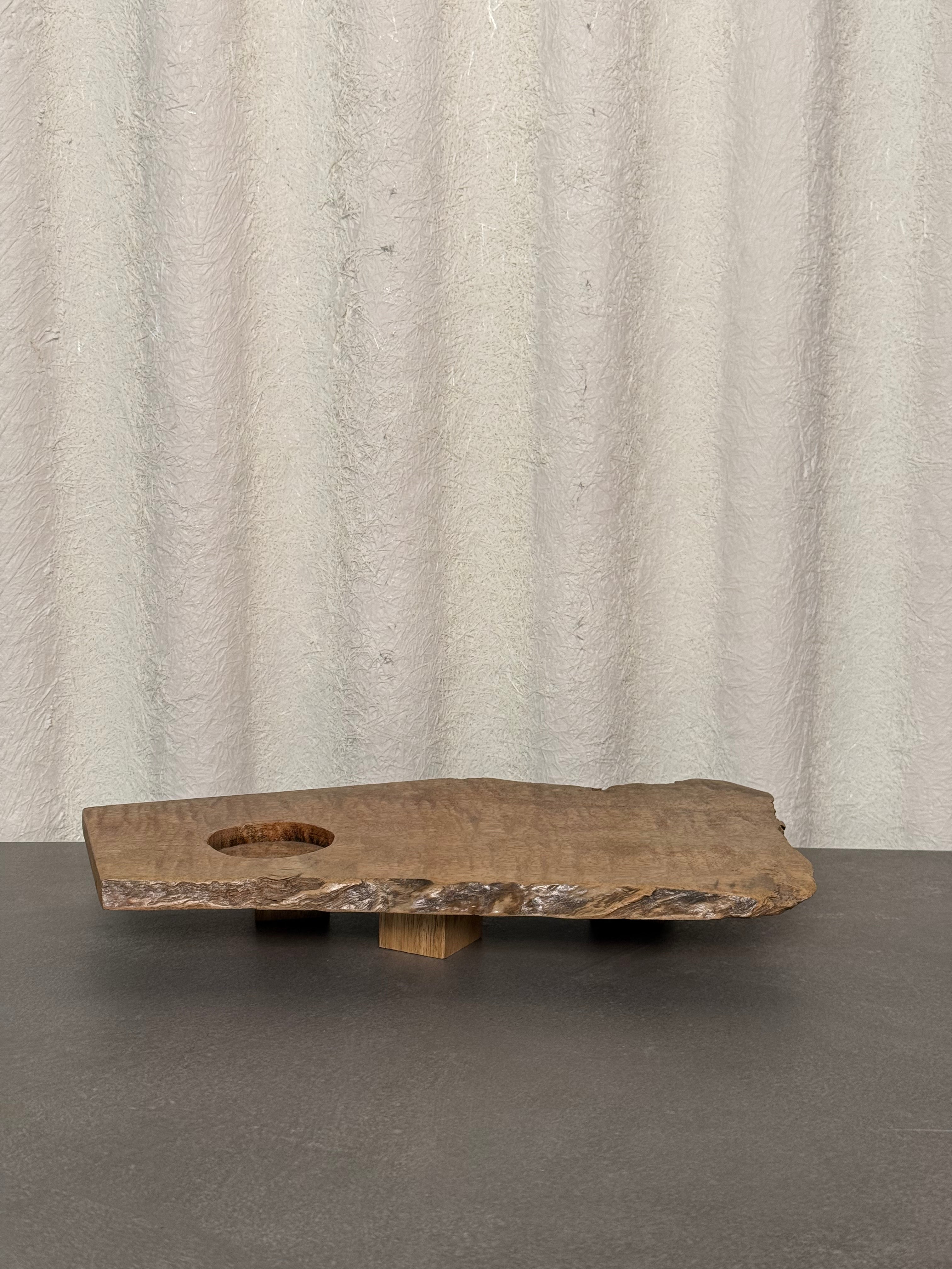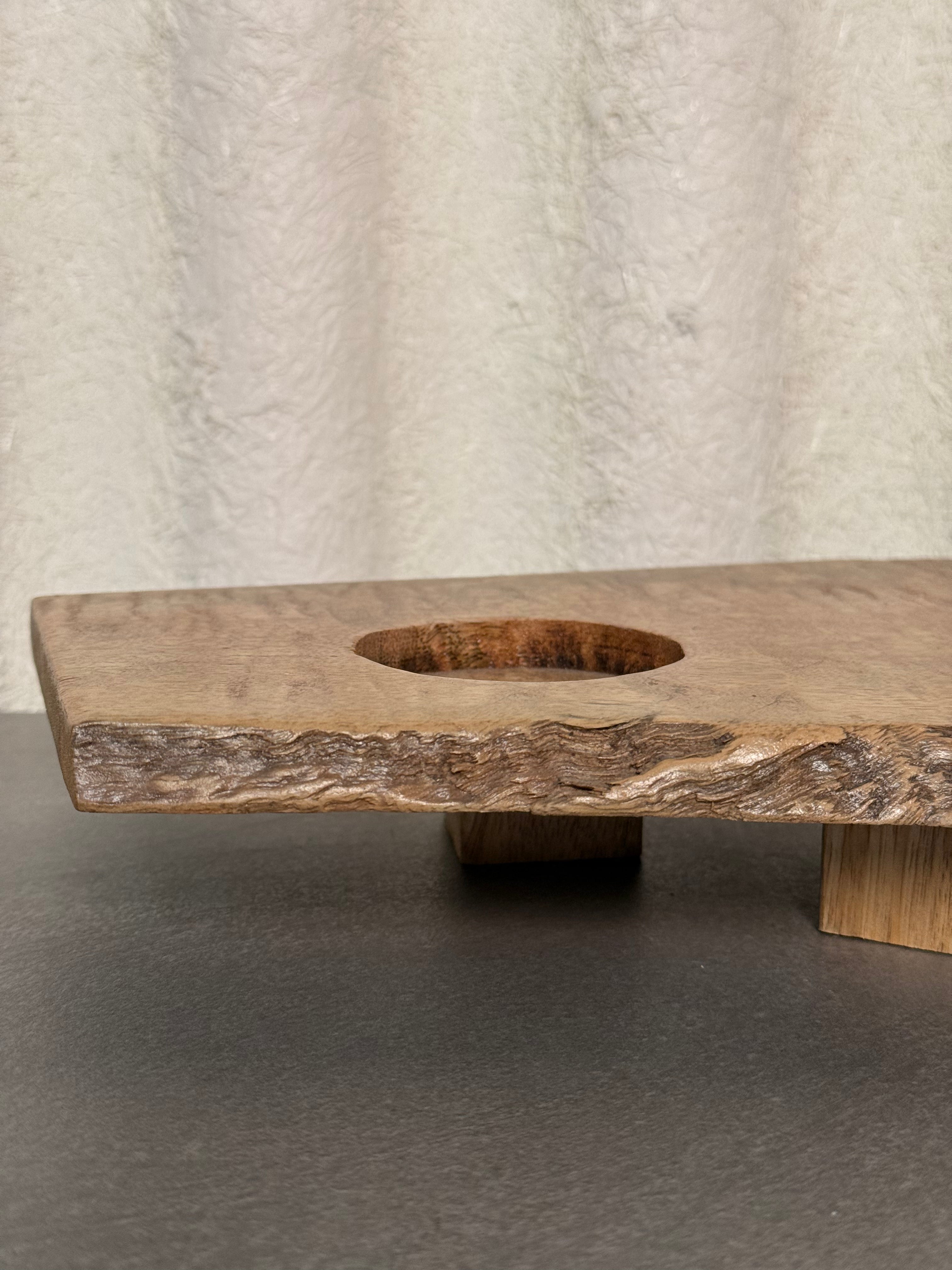 Live-edge wood footed tray with natural grain and hand-carved detailing. Elevated on solid wood block feet, this artisan-crafted piece is perfect for displaying candles, ceramics, or serving as a minimalist centerpiece with organic warmth and character.
