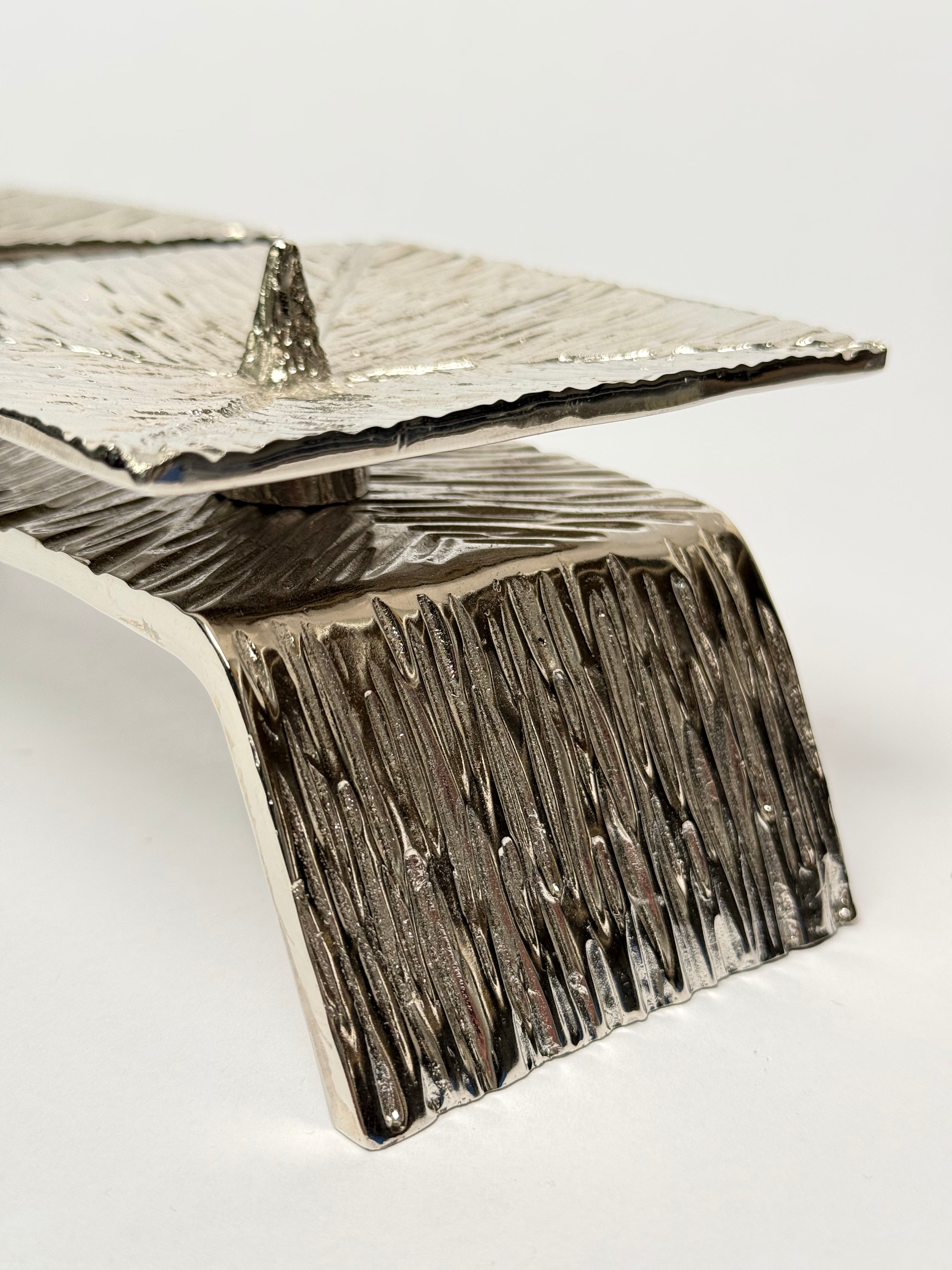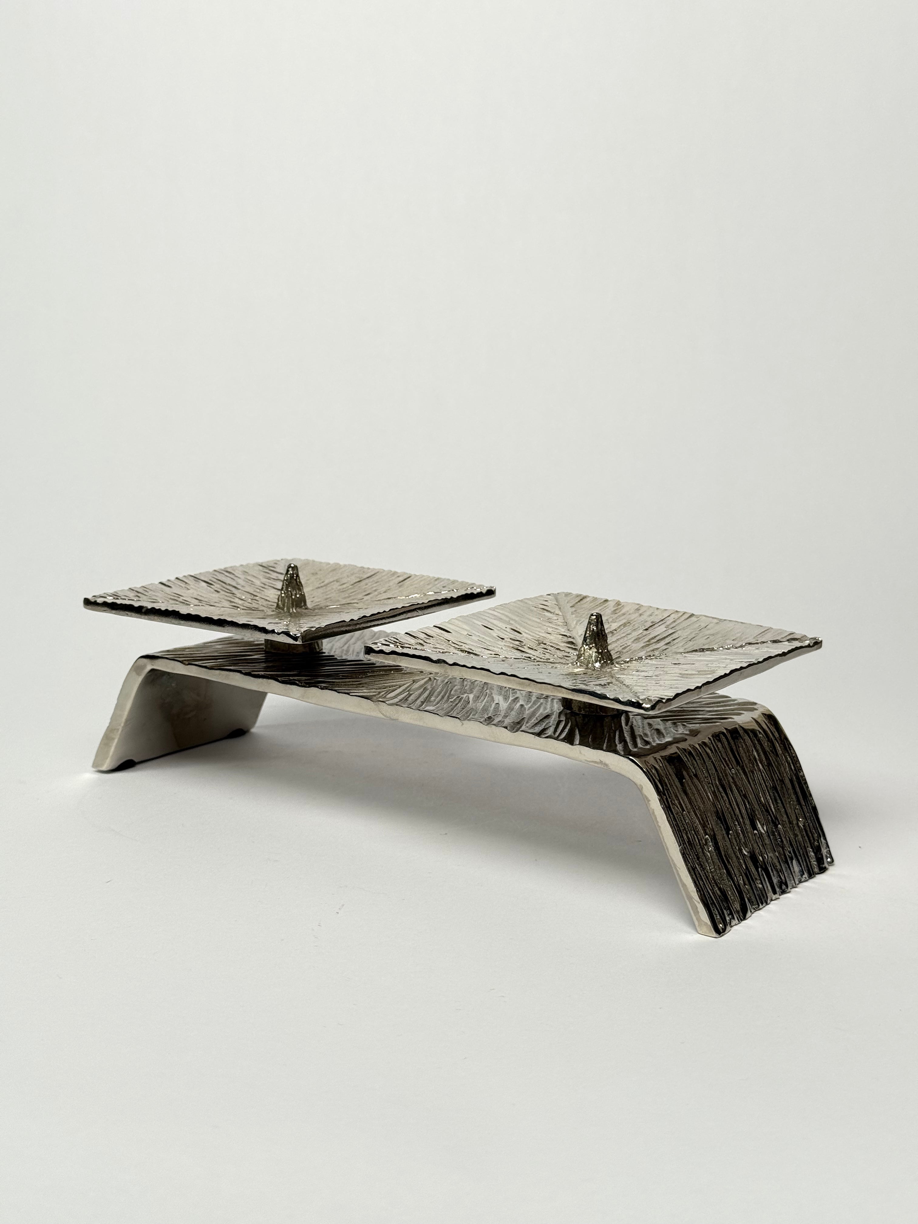 Dual-candleholder with nickel and brass plating. The polished finish complements modern and traditional interiors alike, while the sturdy construction accommodates standard taper candles.