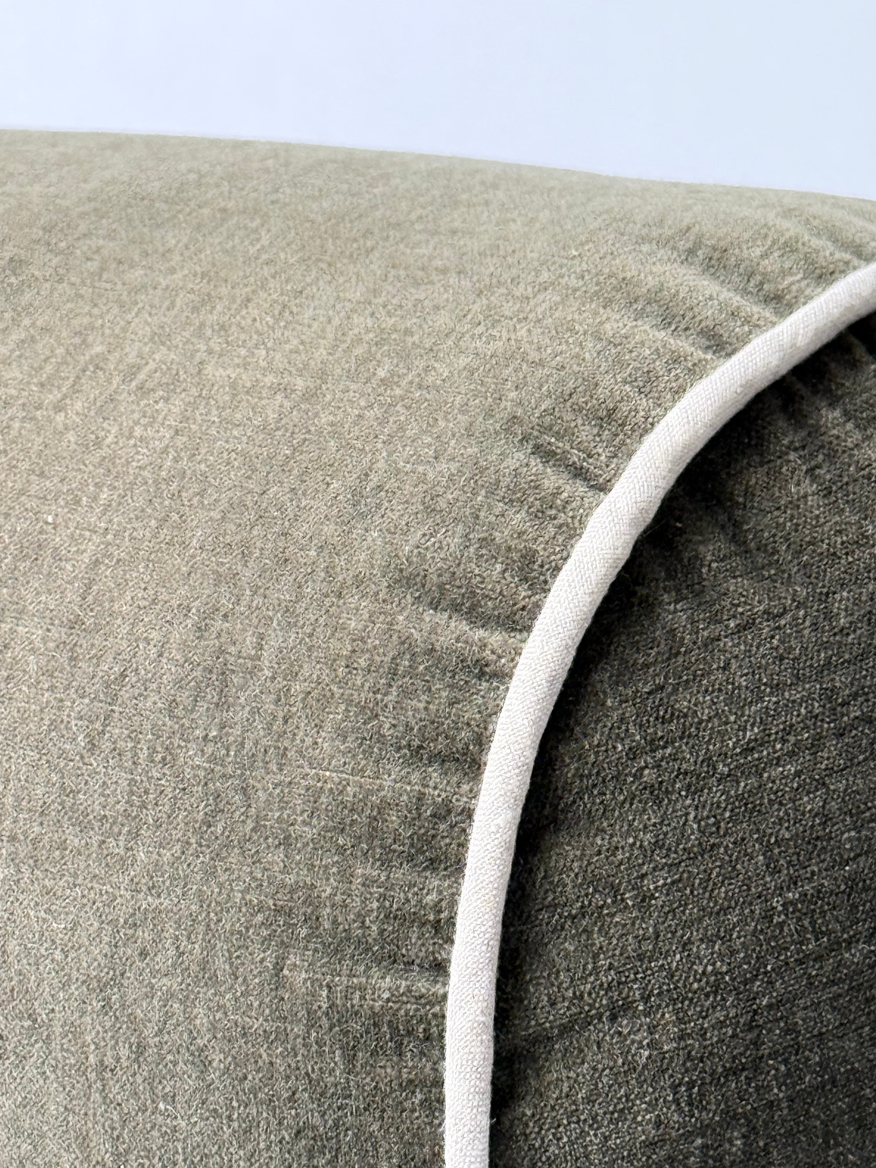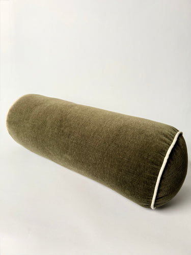 Olive green velvet bolster pillow accented with crisp white piping for refined home styling.
