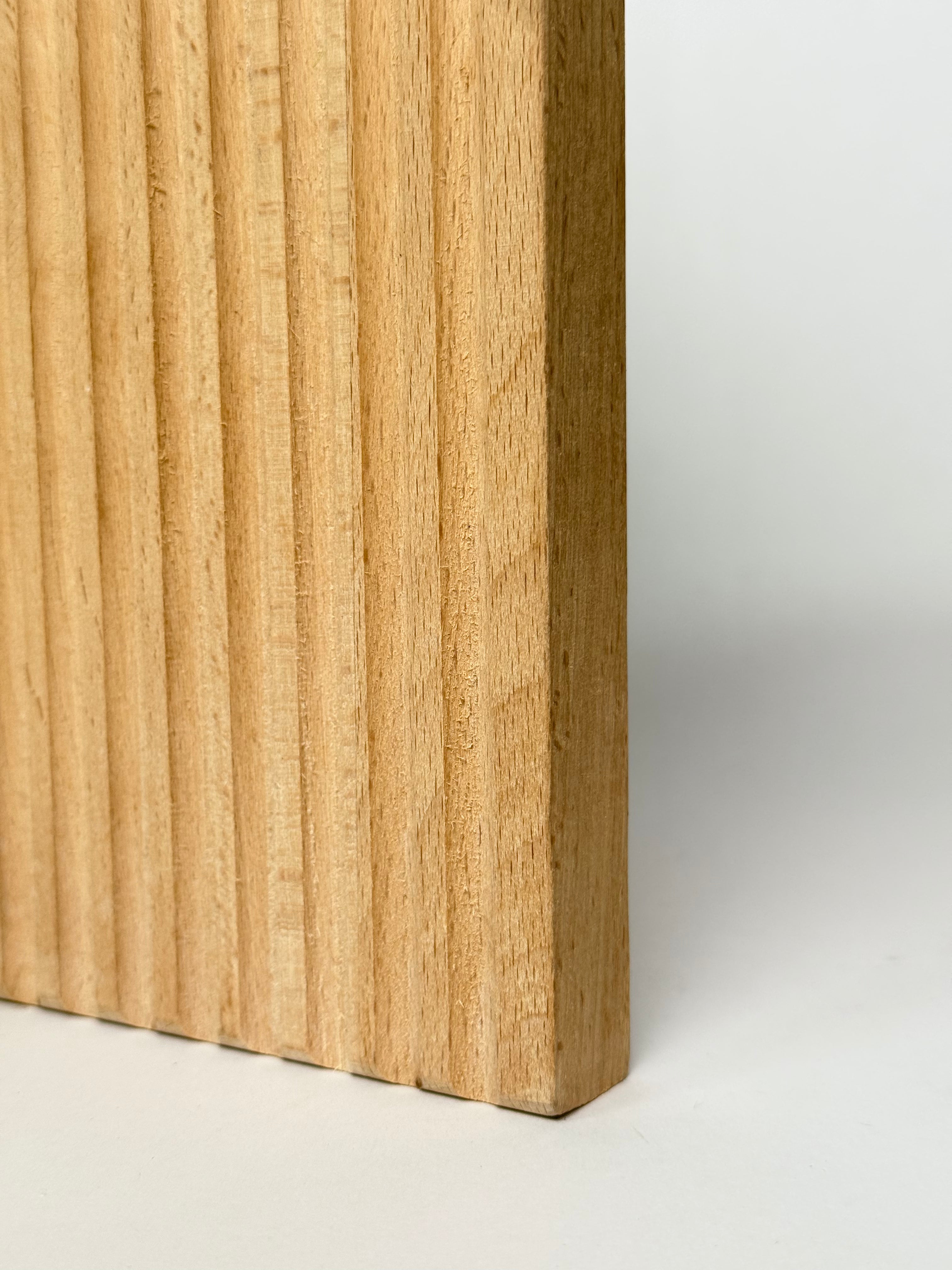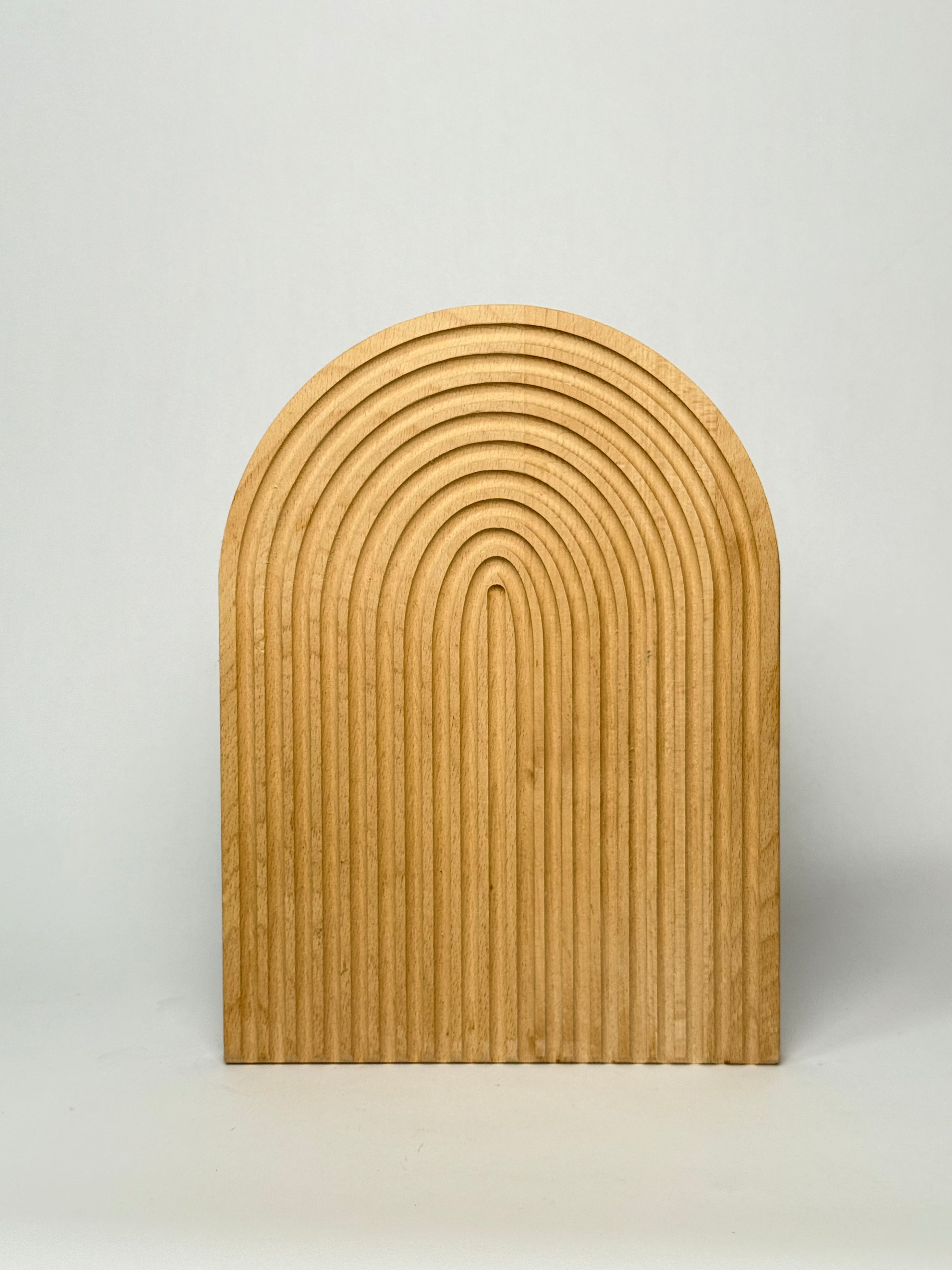 A modern decorative wood panel featuring a carved arched motif with clean, repeating grooves. The natural finish highlights the grain and gives it a warm, minimalist feel.