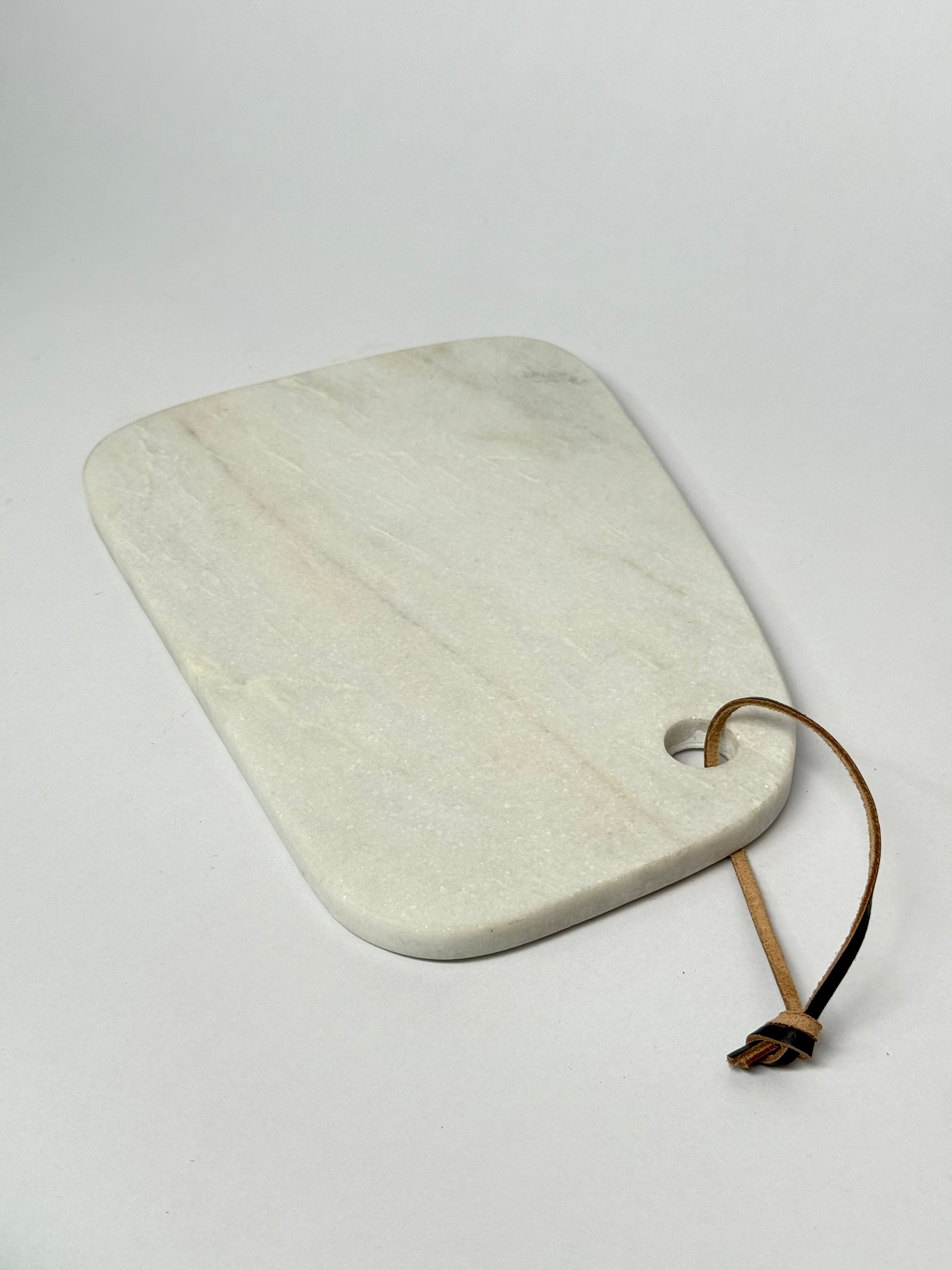 Elegant marble serving surface designed with understated sophistication. The white marble's natural veining creates a refined backdrop while its smooth, cool surface keeps ingredients at ideal temperatures.