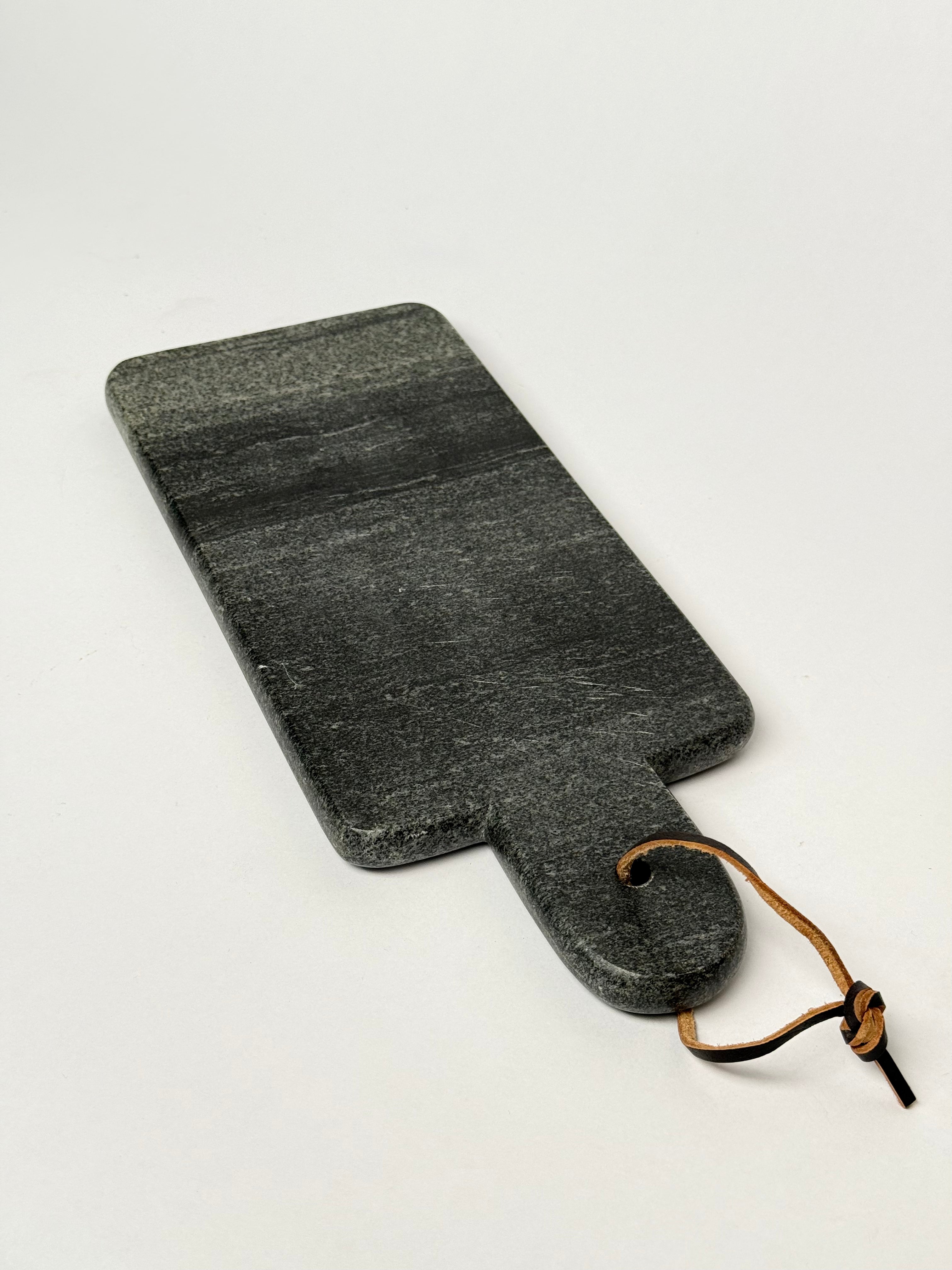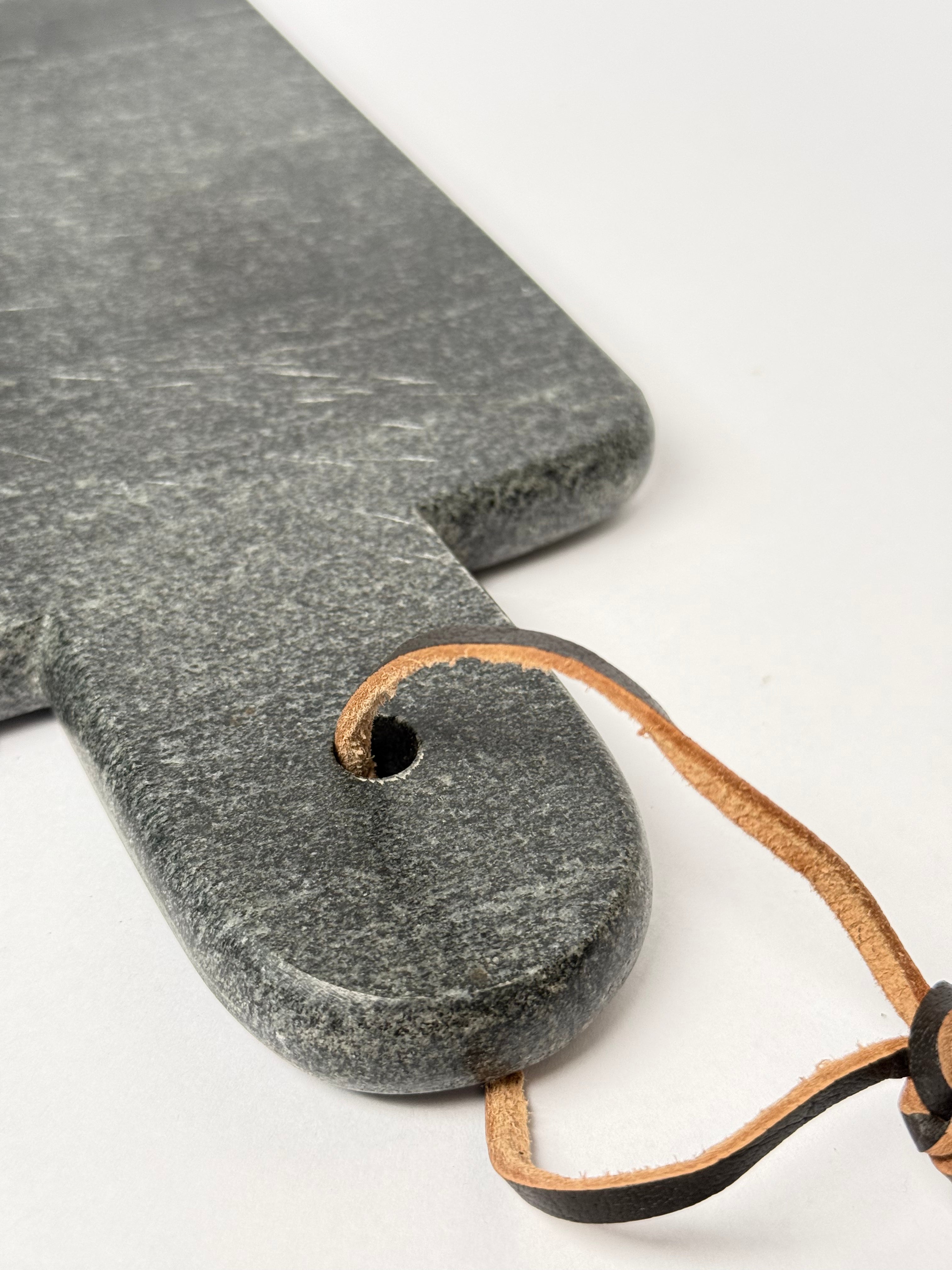 A rectangular marble cutting board with a rounded handle and leather hanging loop. Featuring natural stone veining and a honed finish, this piece functions as a serving board, prep surface, or decorative kitchen accent with timeless, minimalist appeal.