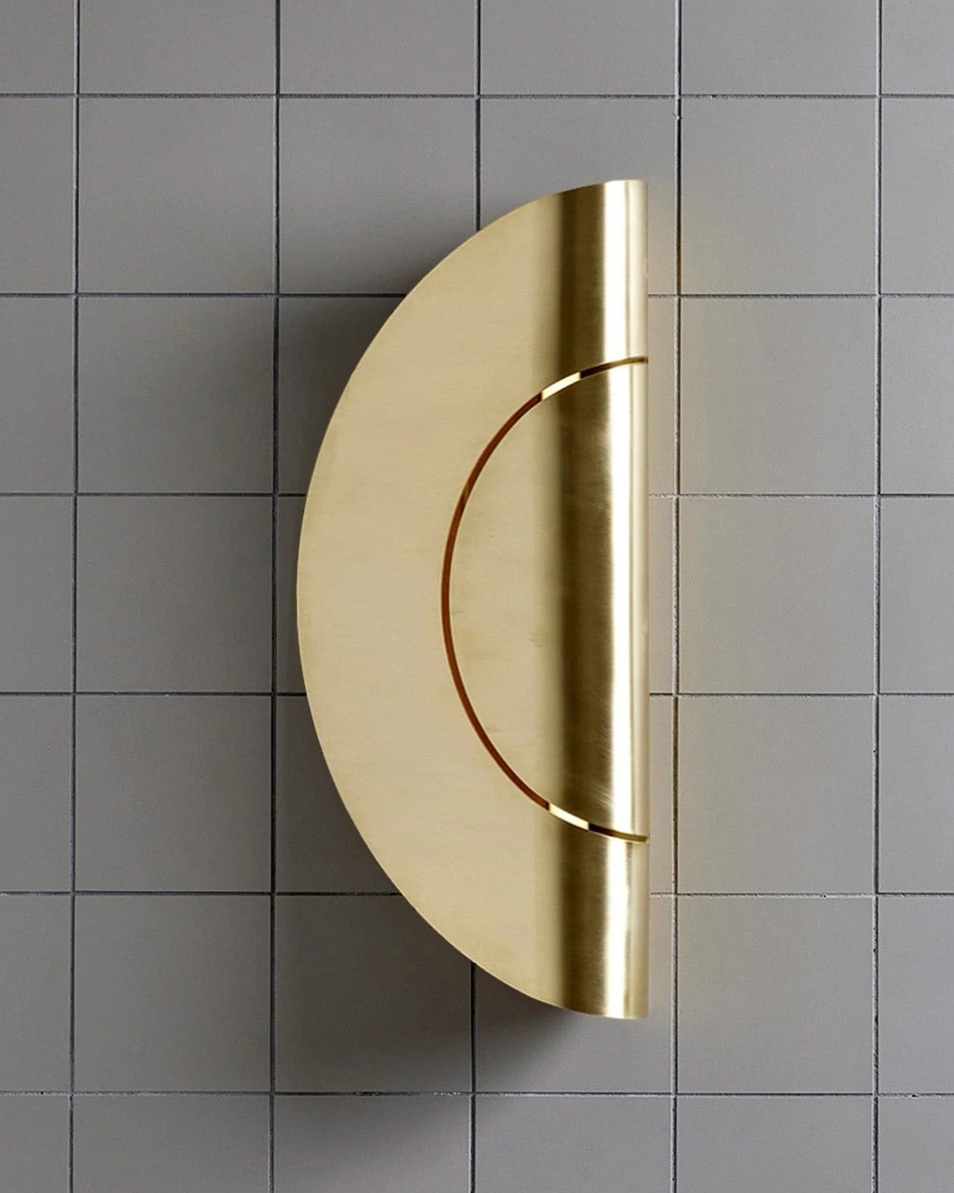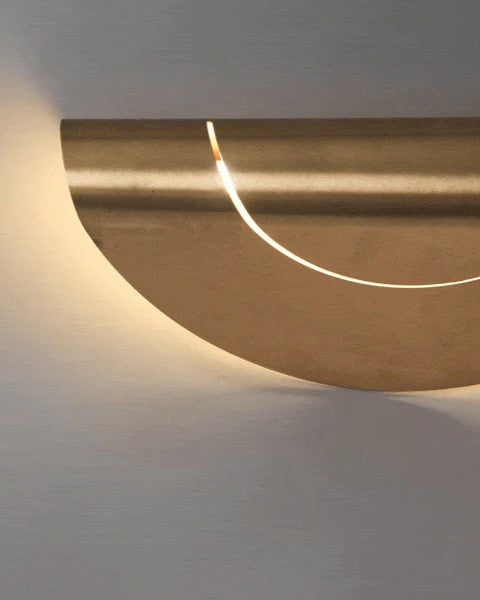 Architectural half-moon wall sconce crafted in Australia, featuring a sculptural curved brass form with a warm, indirect glow. Fitted with a G9 LED bulb (included), 3000K color temperature, and rated IP67 for indoor or outdoor use. Available in raw brass, powder-coated brass, or powder-coated white.