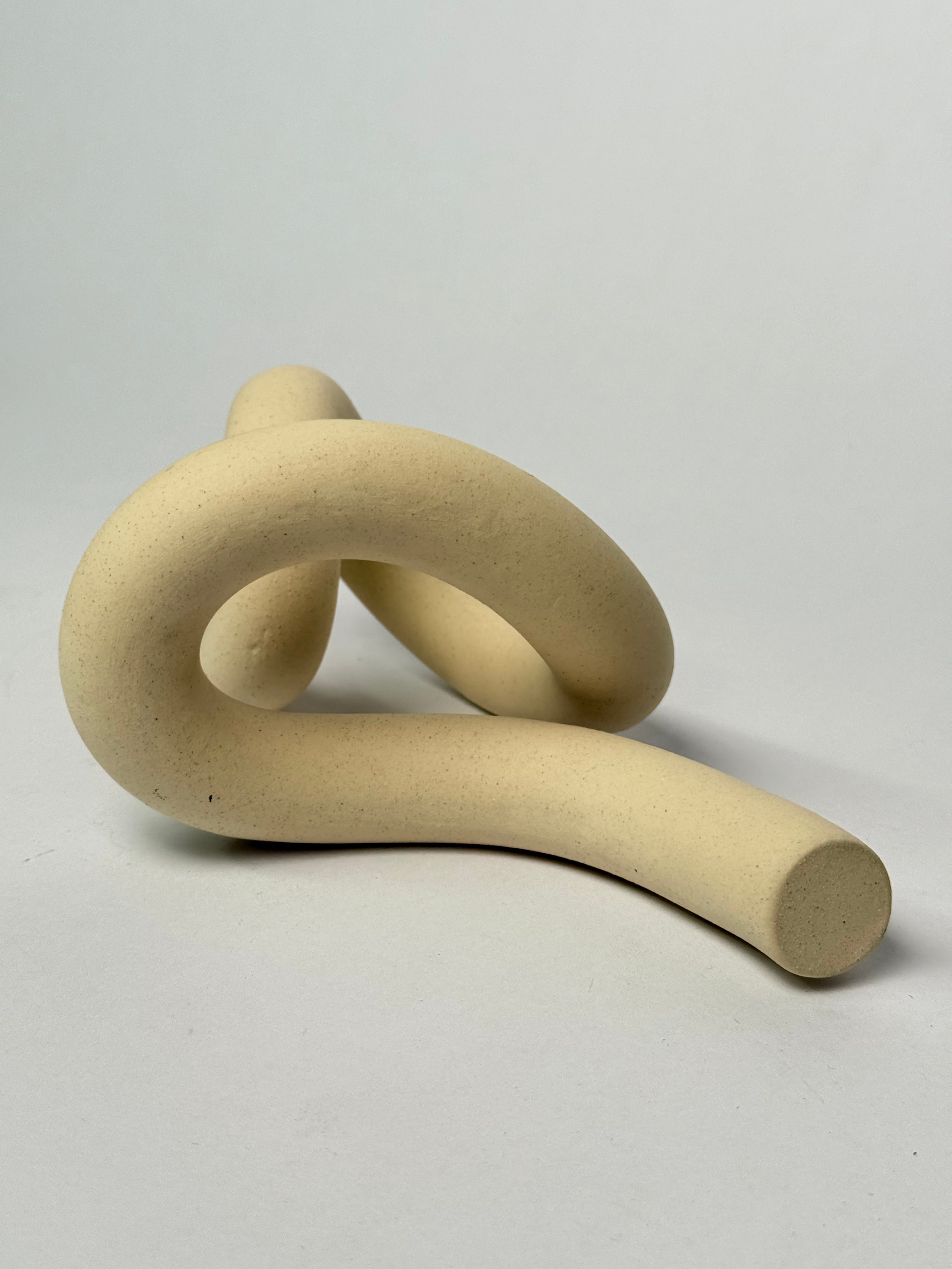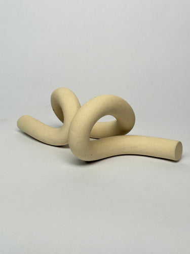 A contemporary sculptural object formed from smooth, tubular ceramic elements intertwined in an abstract knot. Finished in a soft neutral tone with subtle speckling, this modern art piece adds an organic, tactile presence to shelves, tables, or curated vignettes.