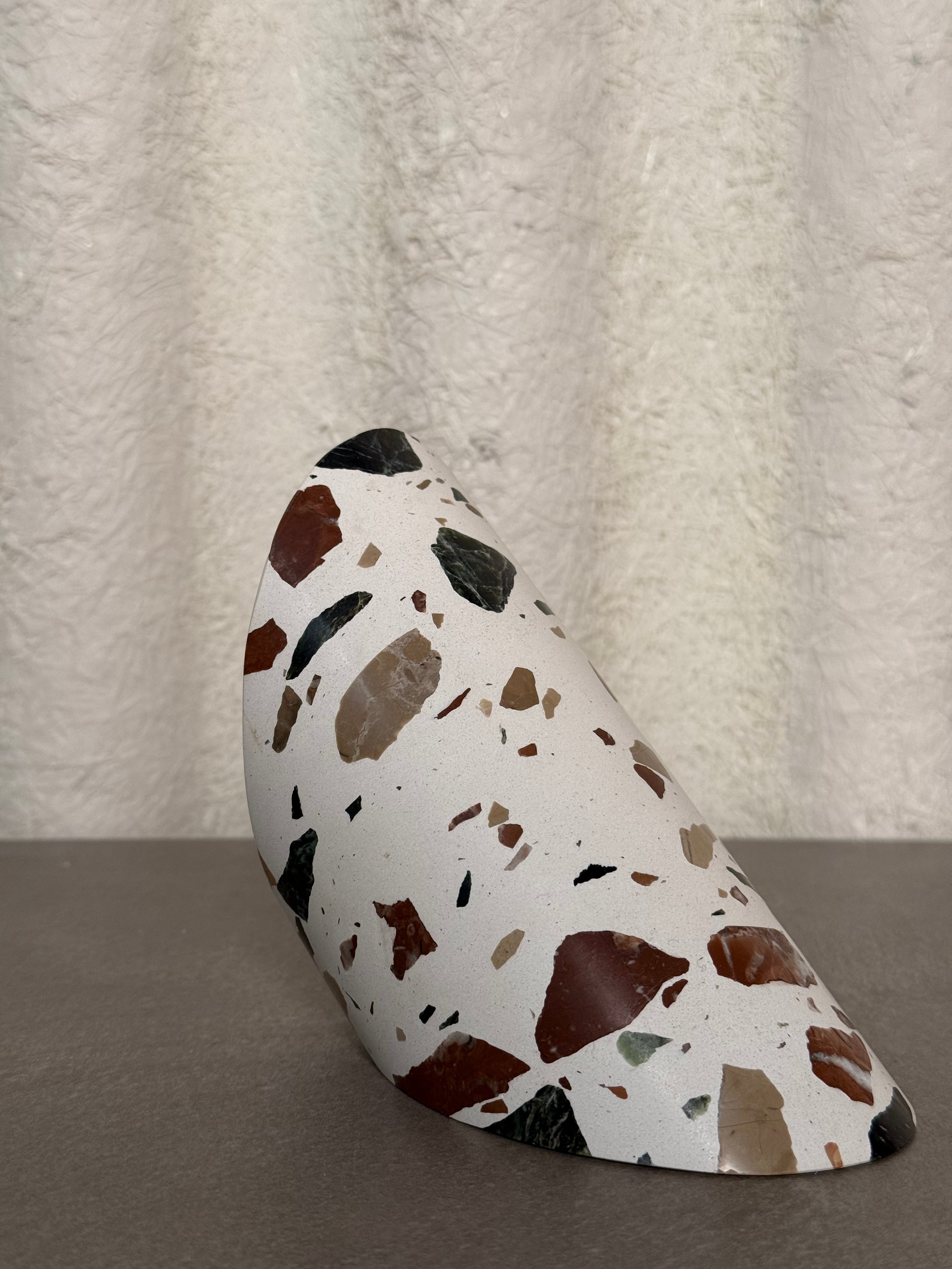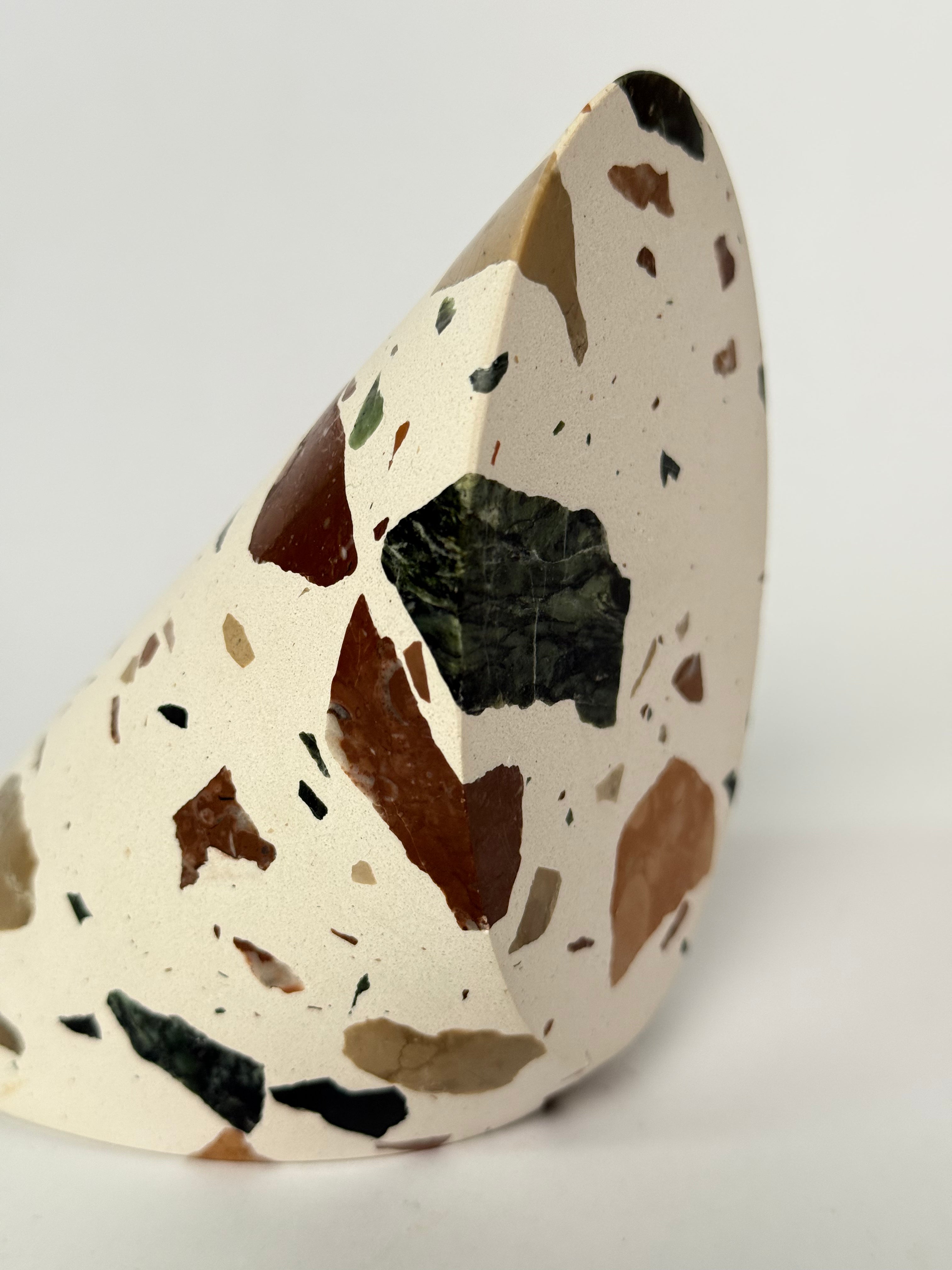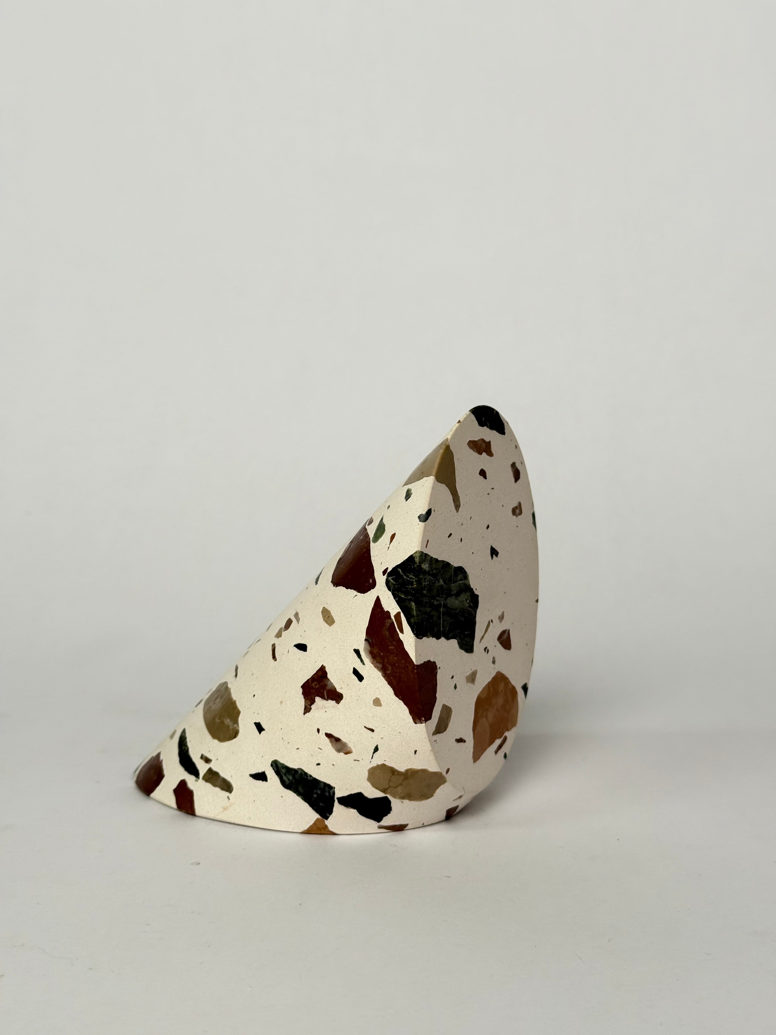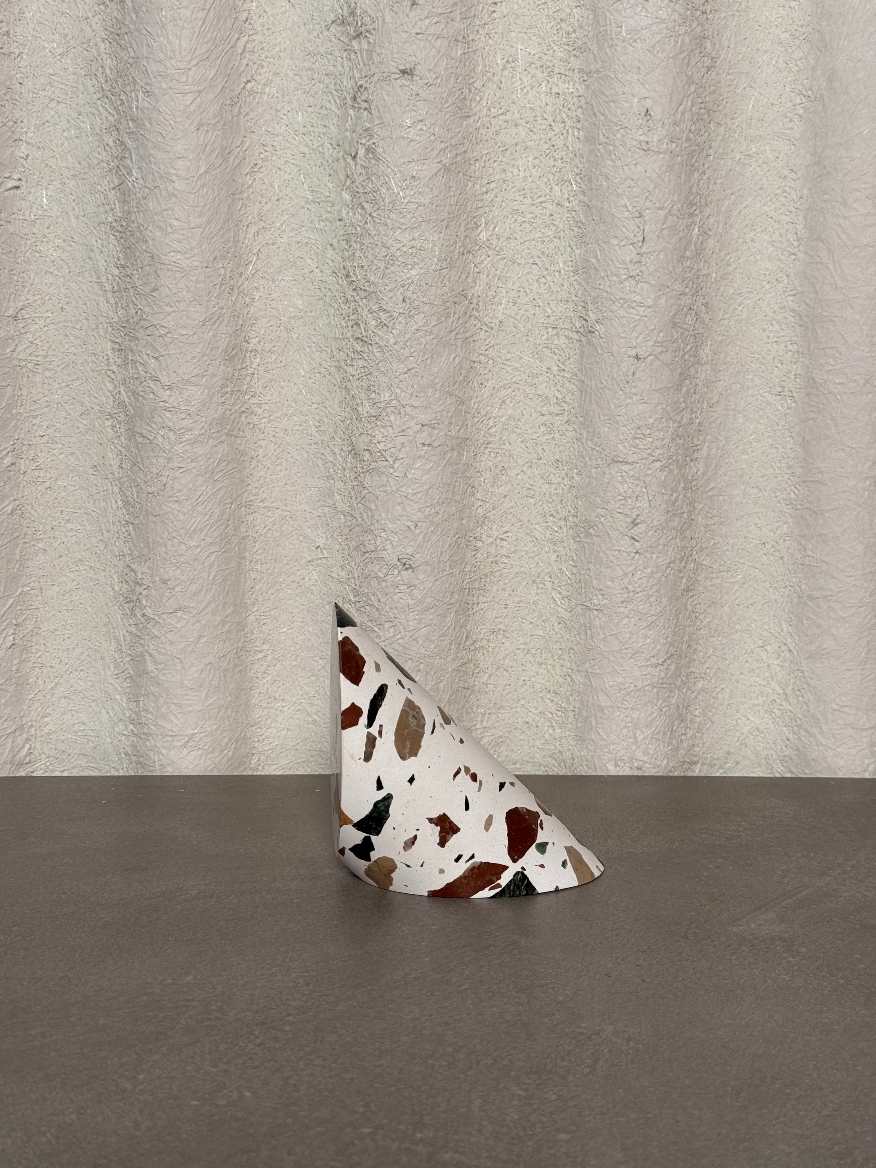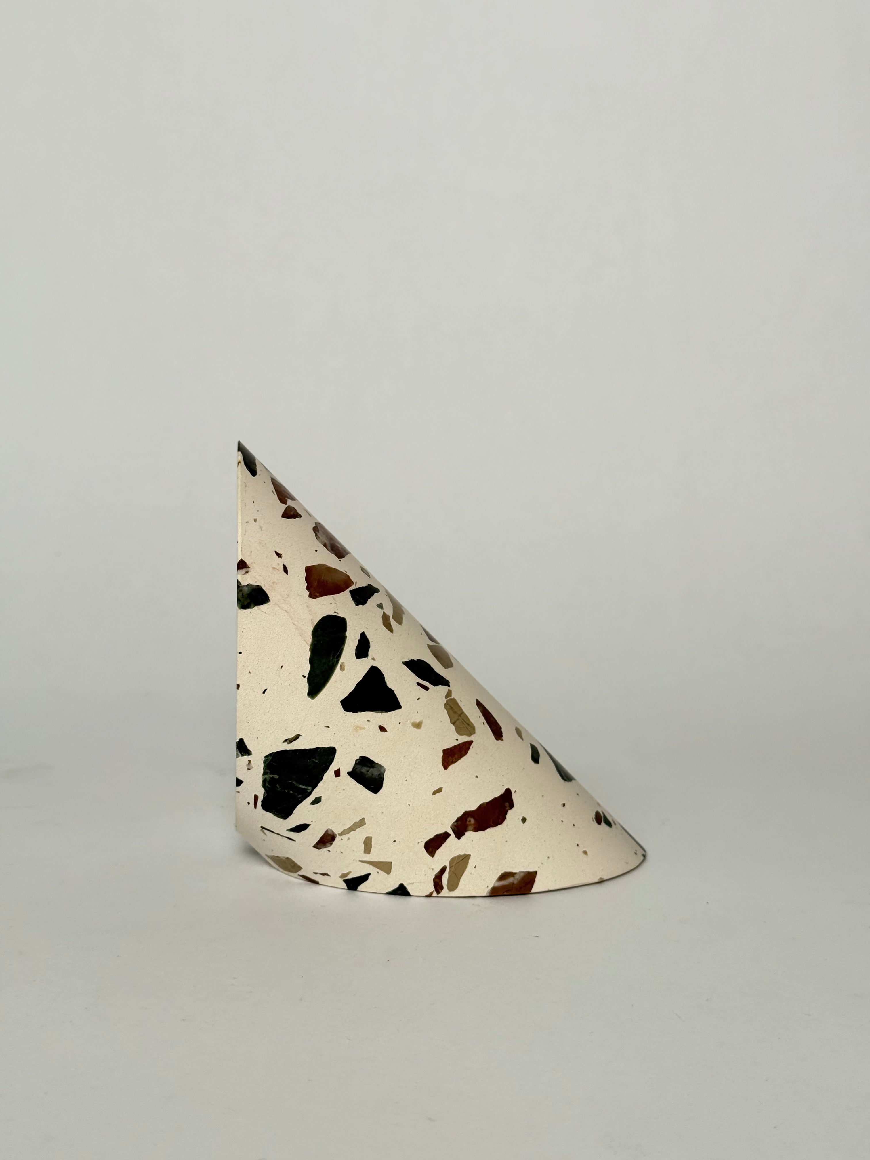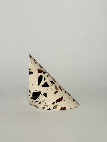 A modern terrazzo accent piece featuring a sculptural cone shape and a mix of earthy stone chips set into a smooth white base. The combination of terracotta, brown, black, and green fragments gives it a warm, organic feel while still reading clean and contemporary.