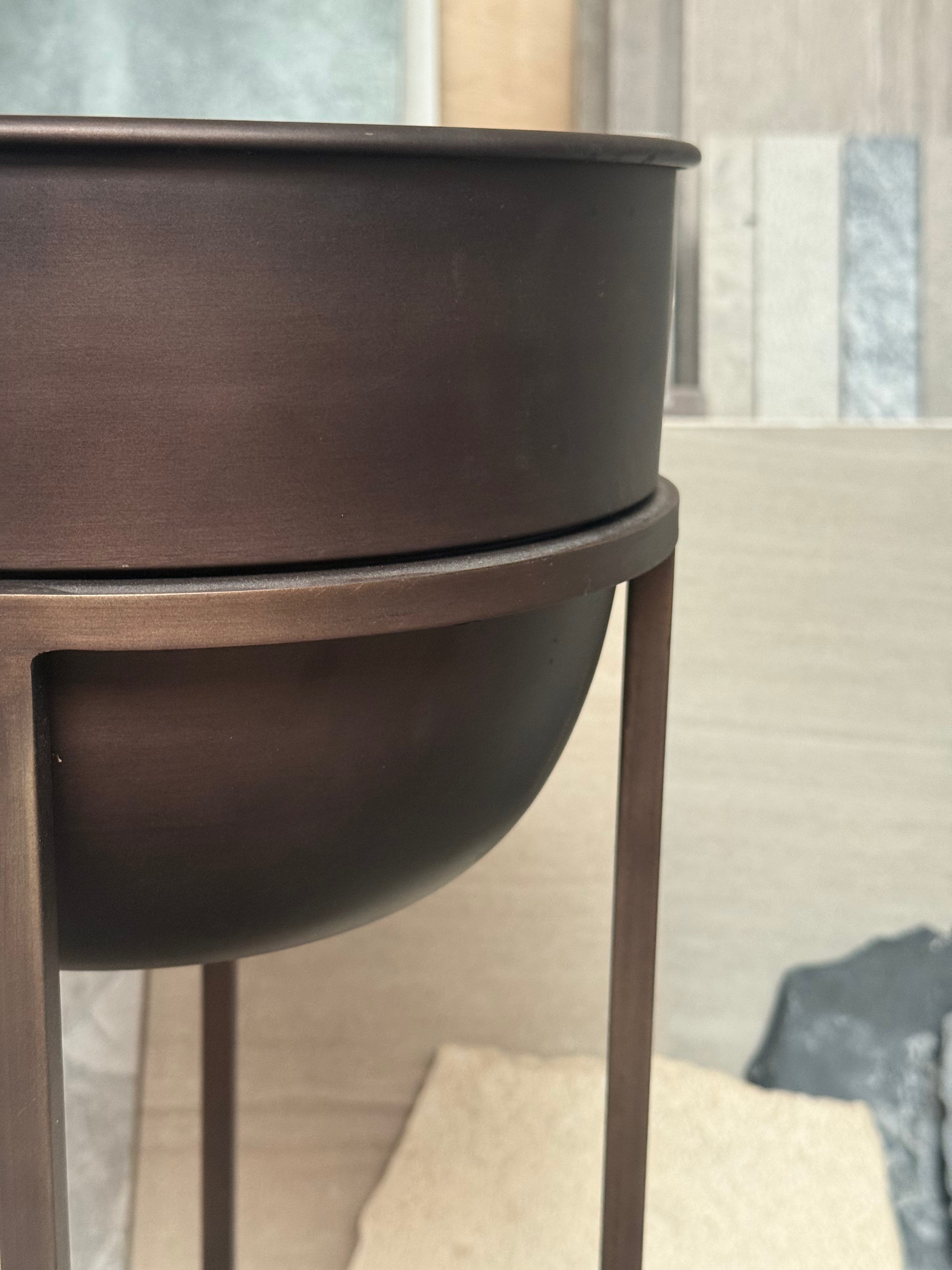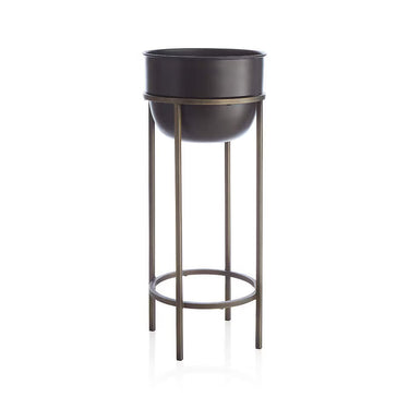 This handcrafted plant stands elevate houseplants with a modern mixed-metallic design. Finished in bronze, our exclusive sturdy iron stands secure round-bottomed, antique brass pots.