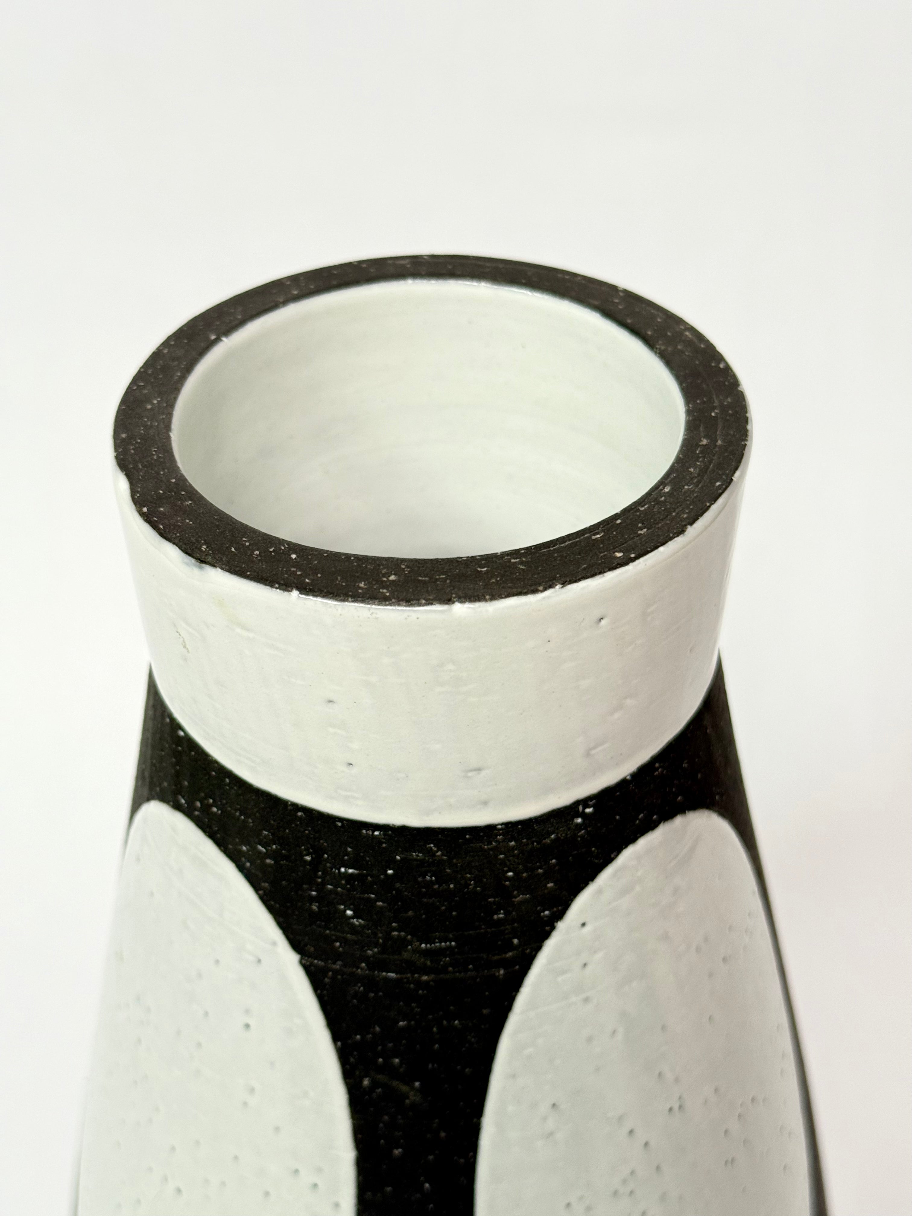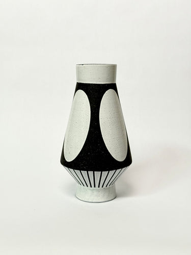 Striking black and white vessel featuring a timeless mid-century modern form. This sculptural piece brings sophisticated contrast and refined geometry to any space.