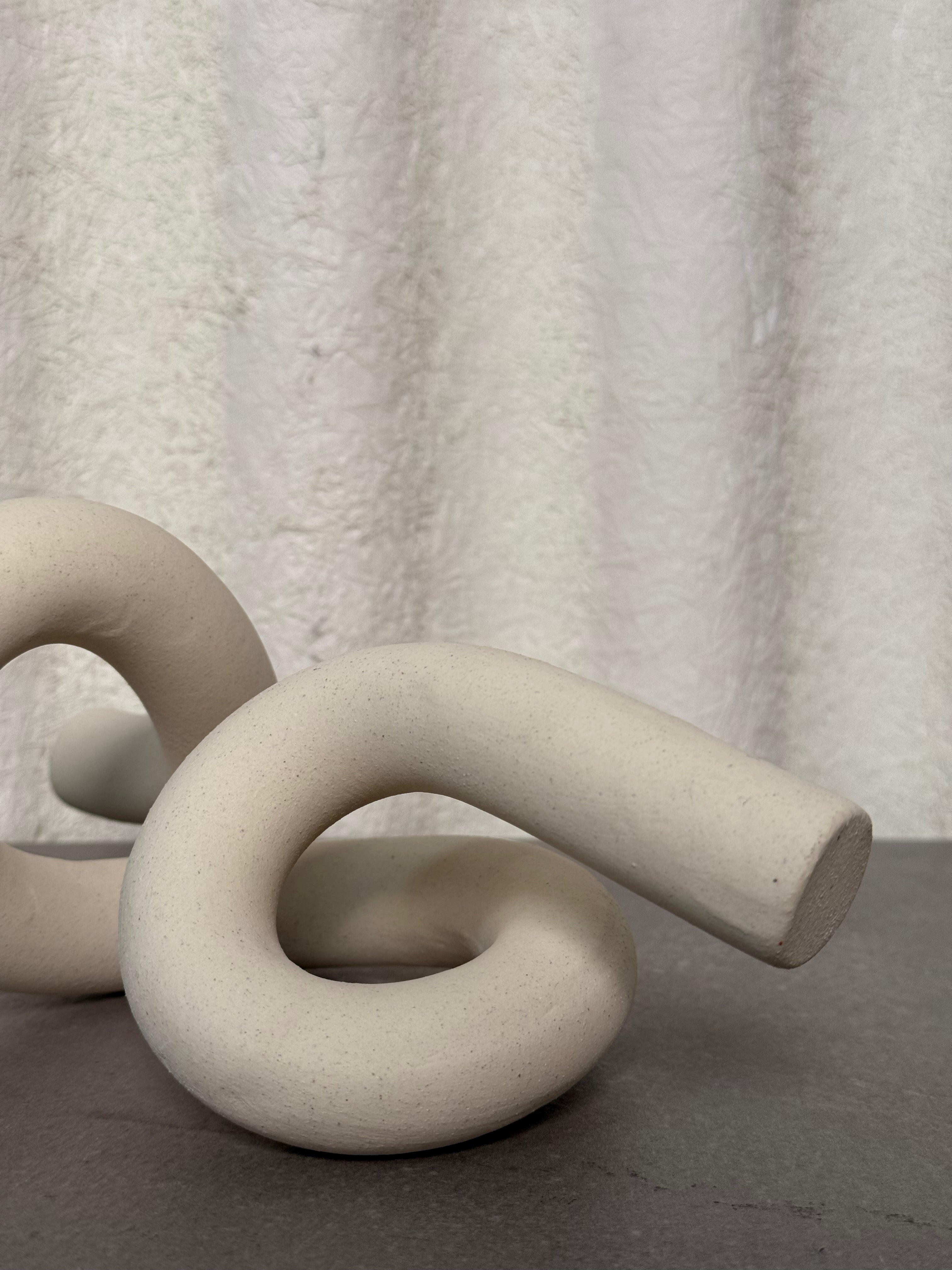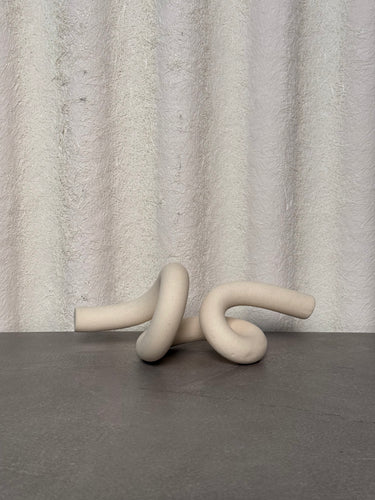 A contemporary sculptural object formed from smooth, tubular ceramic elements intertwined in an abstract knot. Finished in a soft neutral tone with subtle speckling, this modern art piece adds an organic, tactile presence to shelves, tables, or curated vignettes.