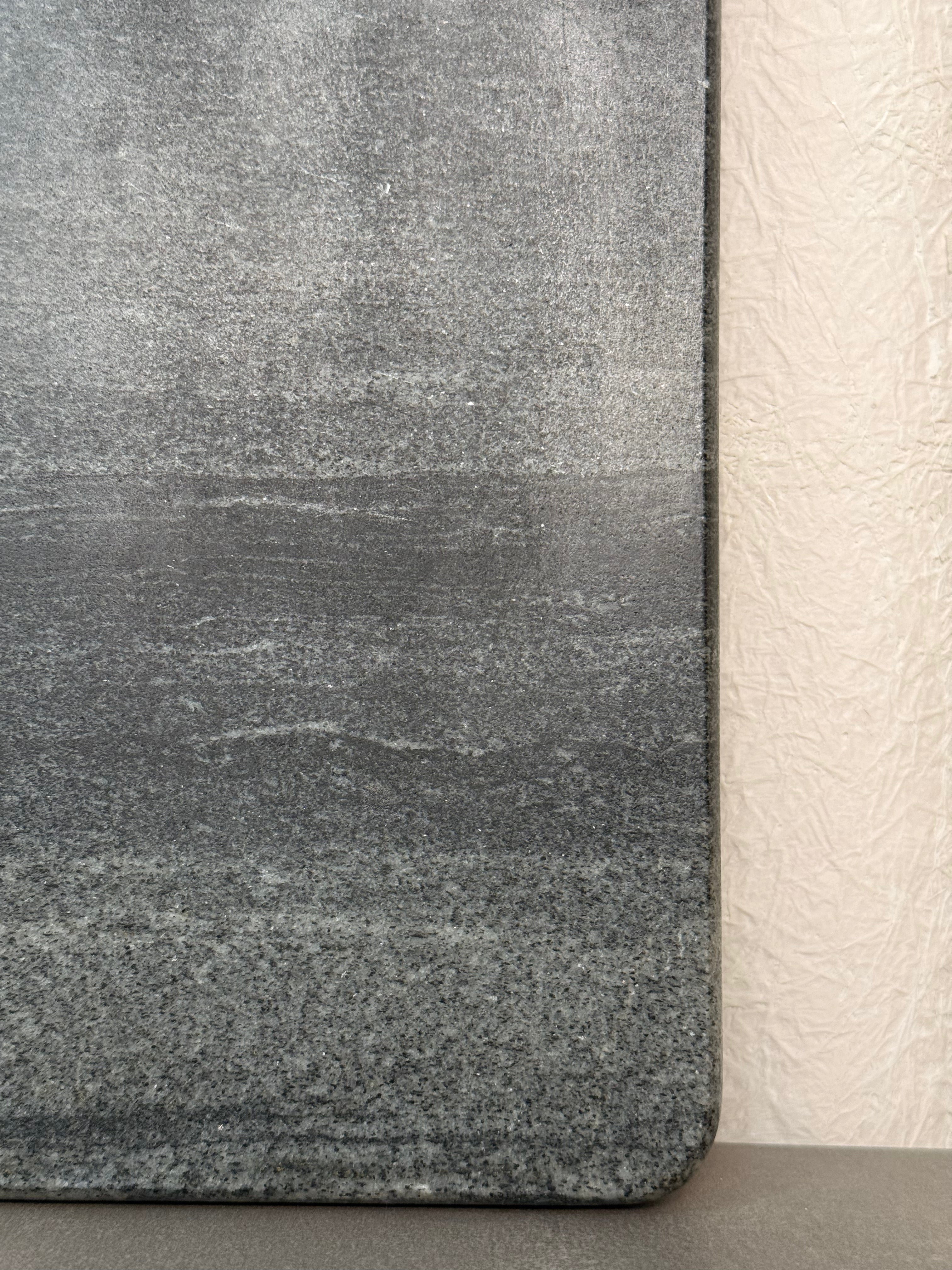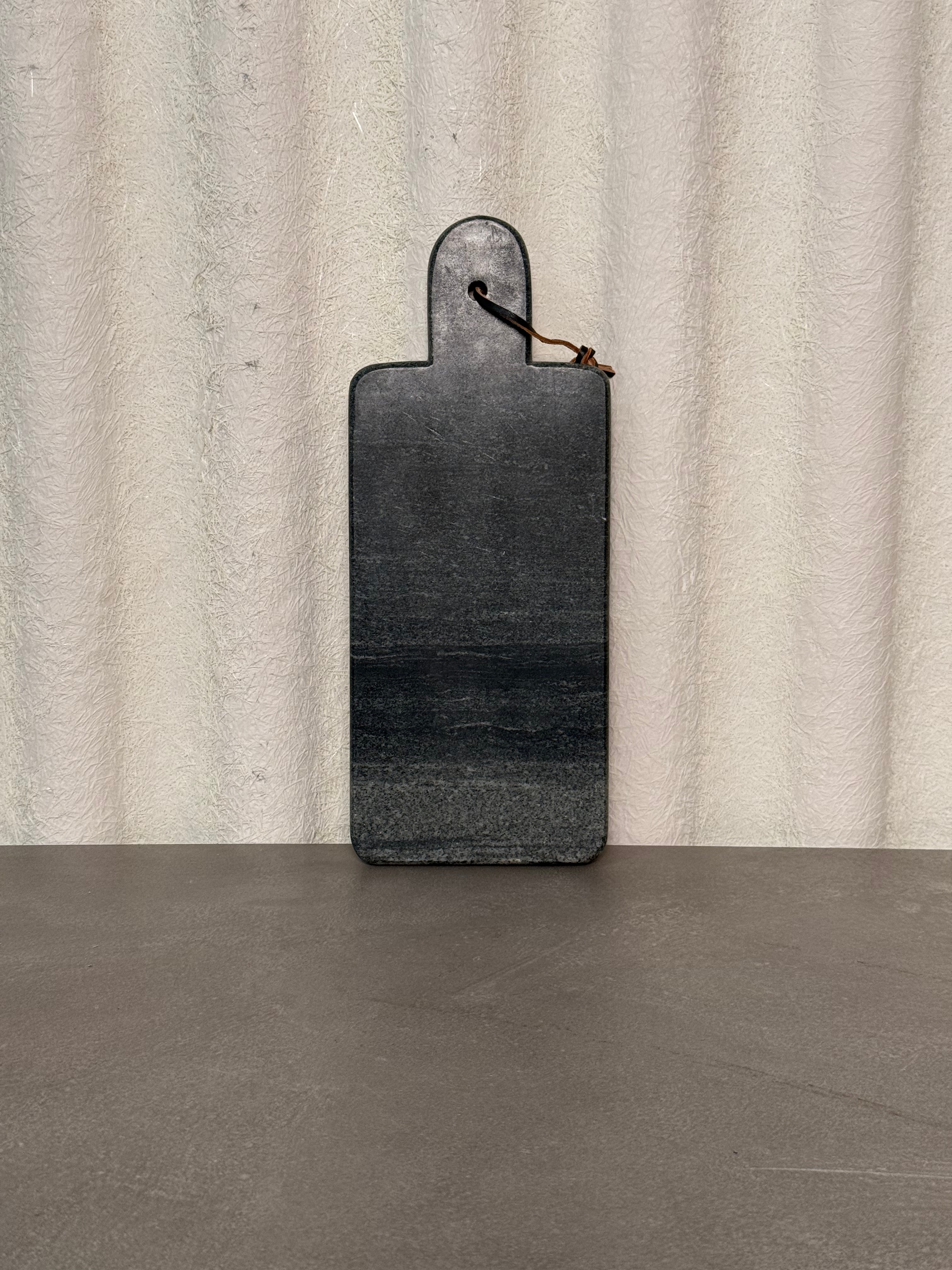 A rectangular marble cutting board with a rounded handle and leather hanging loop. Featuring natural stone veining and a honed finish, this piece functions as a serving board, prep surface, or decorative kitchen accent with timeless, minimalist appeal.