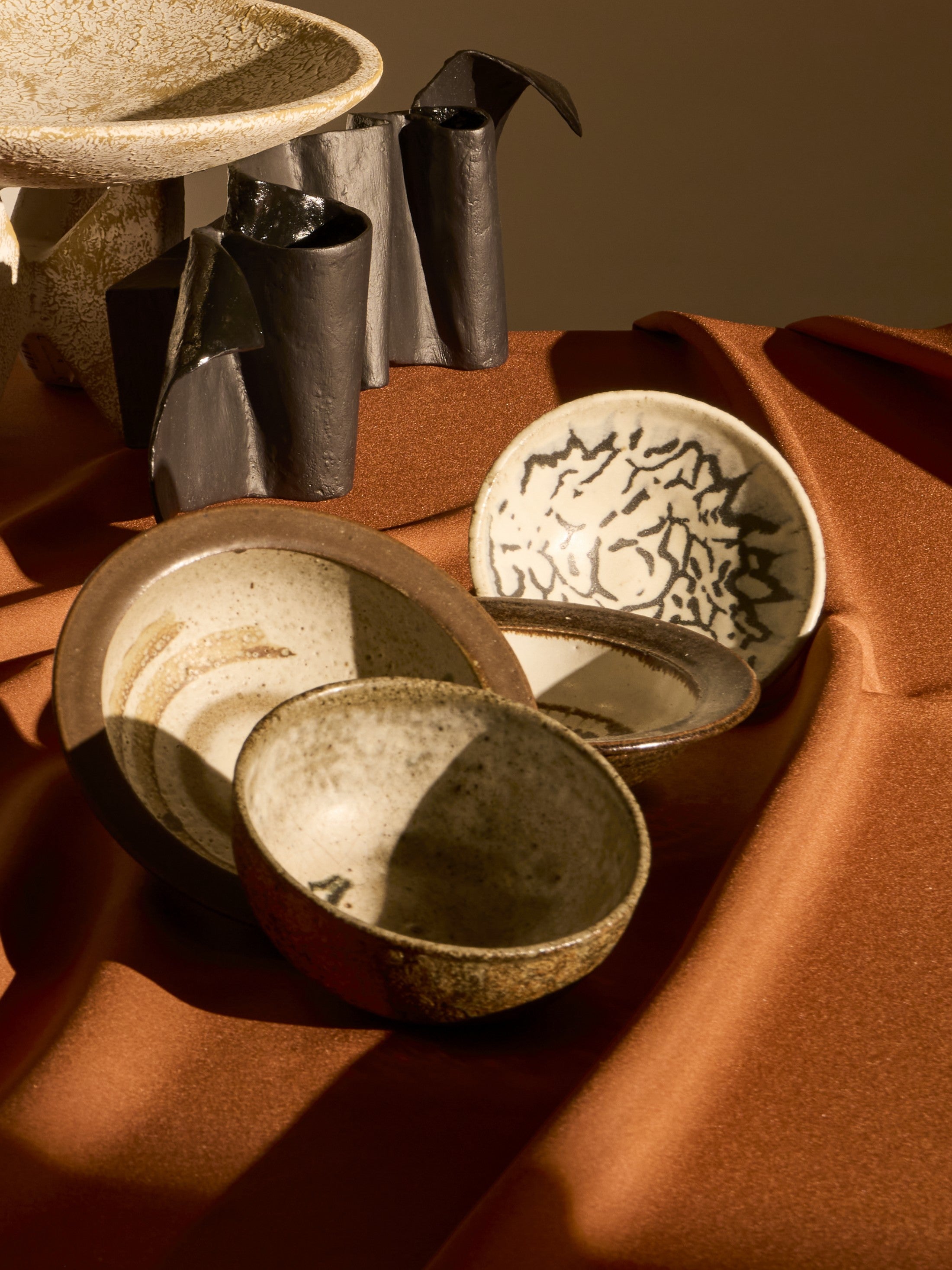 intage small bowl by Larry Shep featuring a rustic speckled glaze with earthy browns and grays, accented by a subtle abstract brushstroke inside. Hand-thrown with an organic shape and textured exterior.
