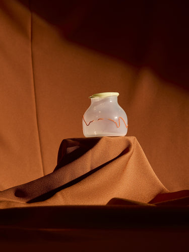 A hand-blown glass series by Cribbe Eriksson exploring the tension between fluid form and graphic line—each piece shaped by the landscapes, light, and color palettes of the Nordic coast. Matte white glass like pressed snow, rimmed in pale green and threaded with a lava-red trail. Cool and clean, with a surprising pulse of color.