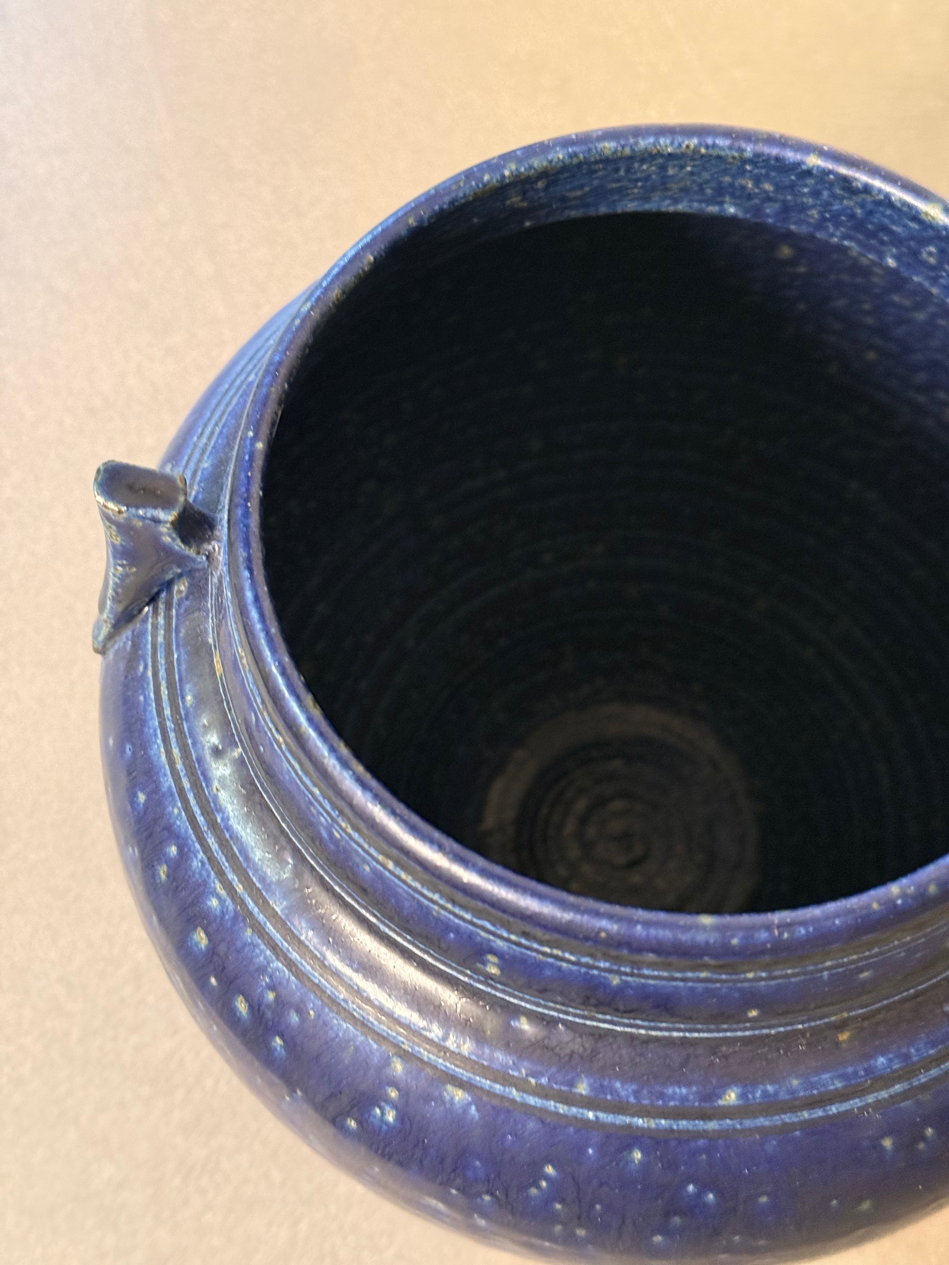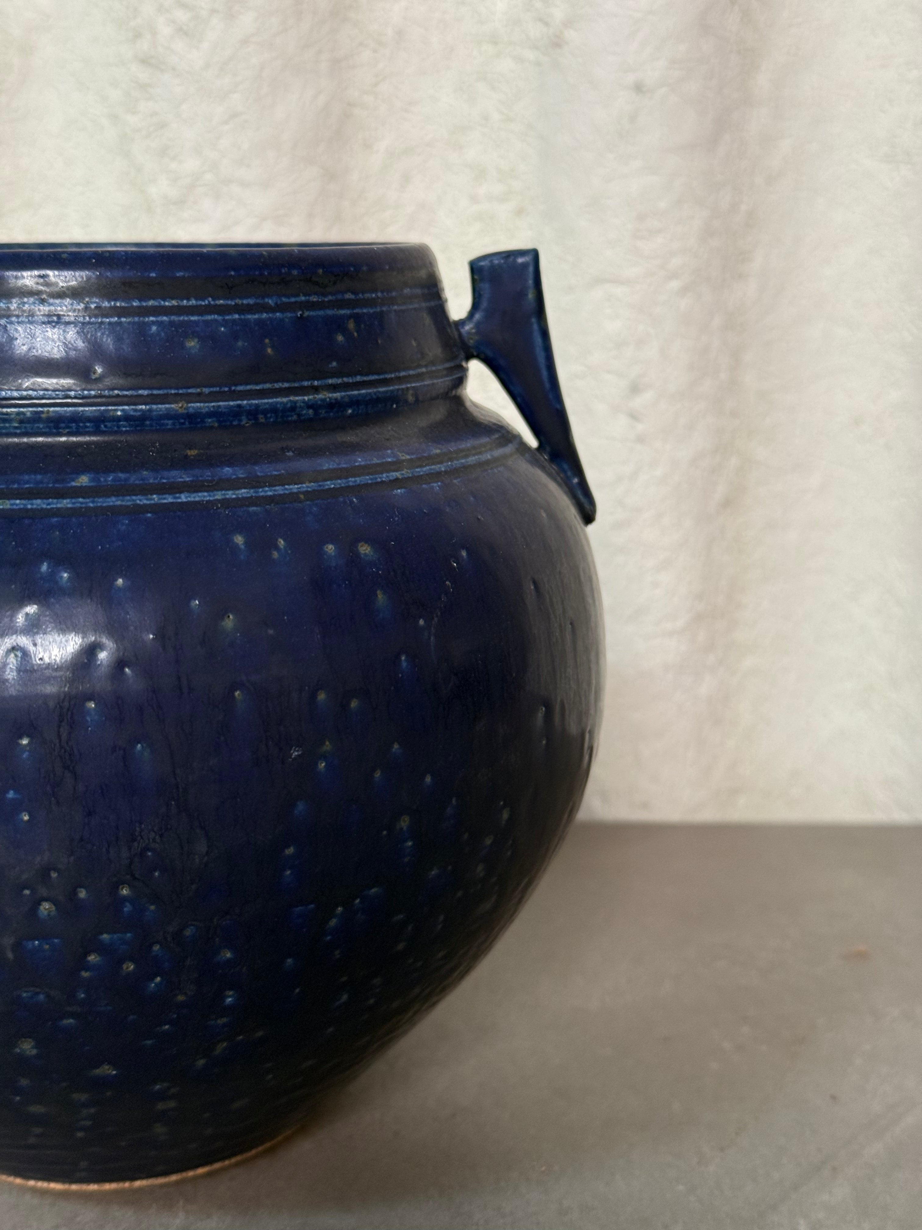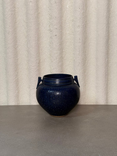 Striking hand-thrown stoneware vase in a rich midnight glaze, featuring subtle texture and sculptural side handles. A bold, collectible piece from Michael Nowack’s studio work.