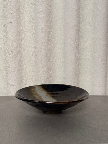 A handcrafted ceramic bowl featuring a dark, earthy glaze with organic variation and a subtly textured finish. Wide and low in profile, this piece works beautifully as a functional serving bowl or as a sculptural accent on tables, shelves, or consoles.