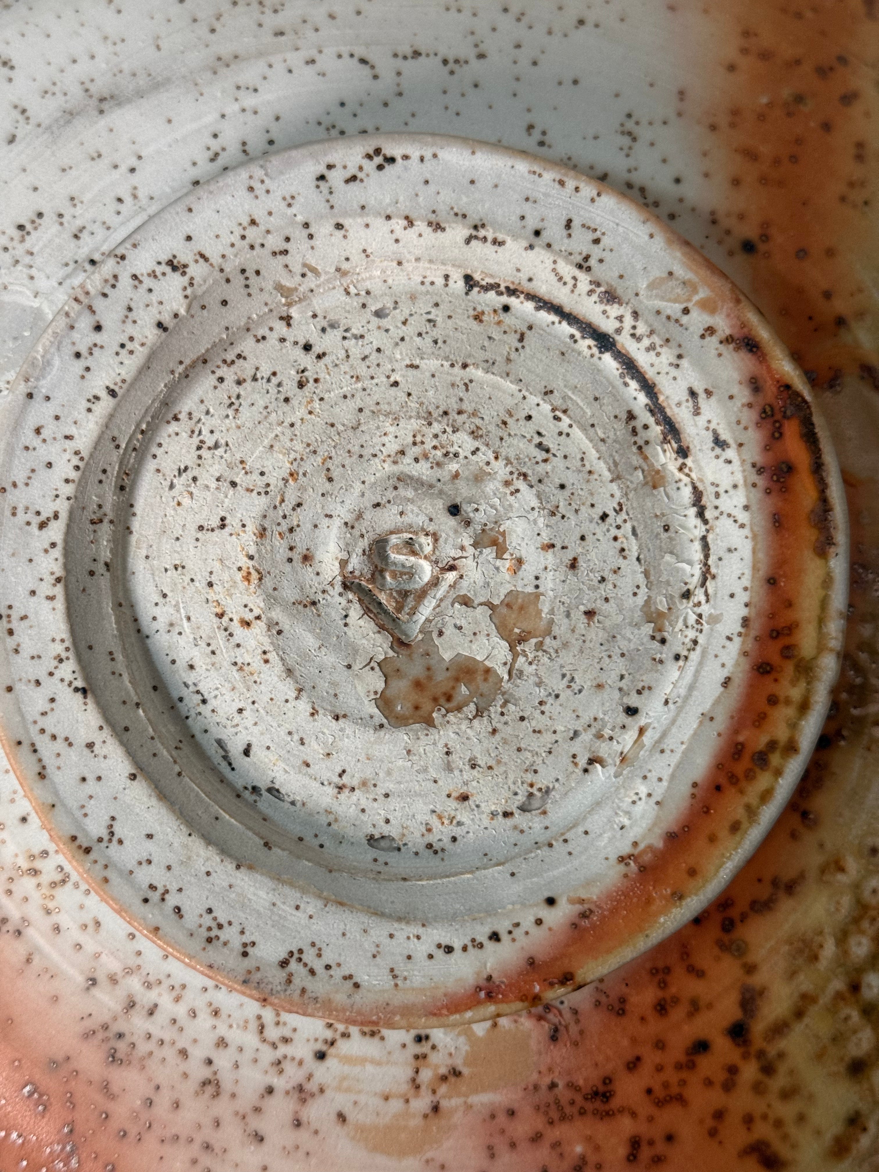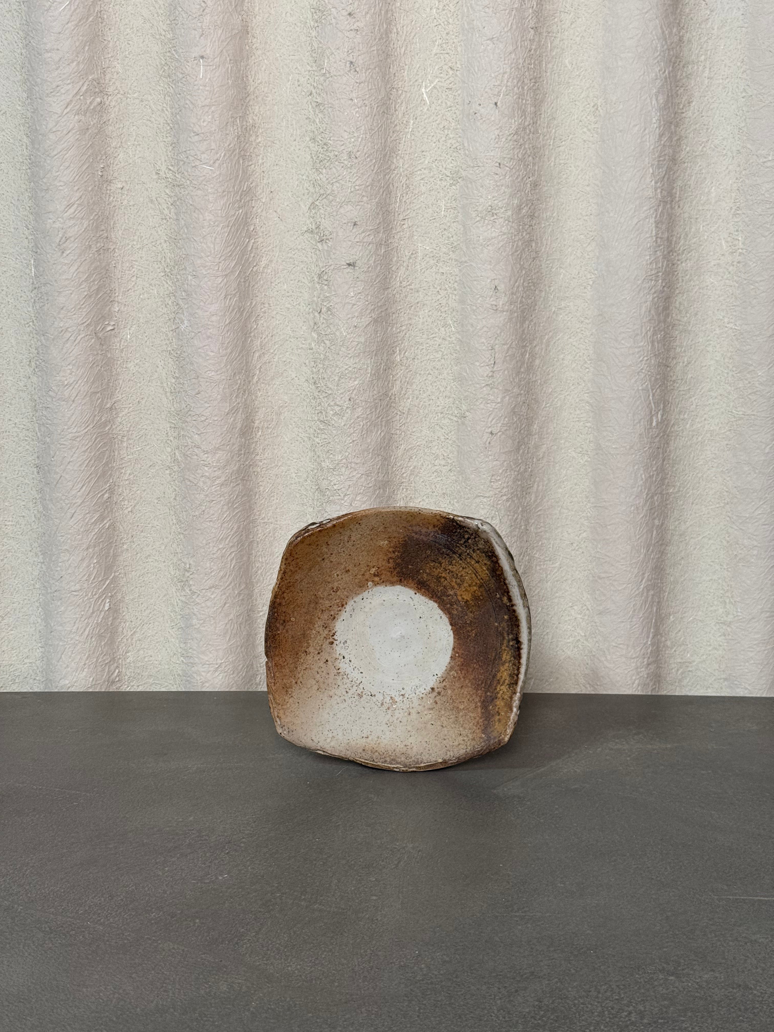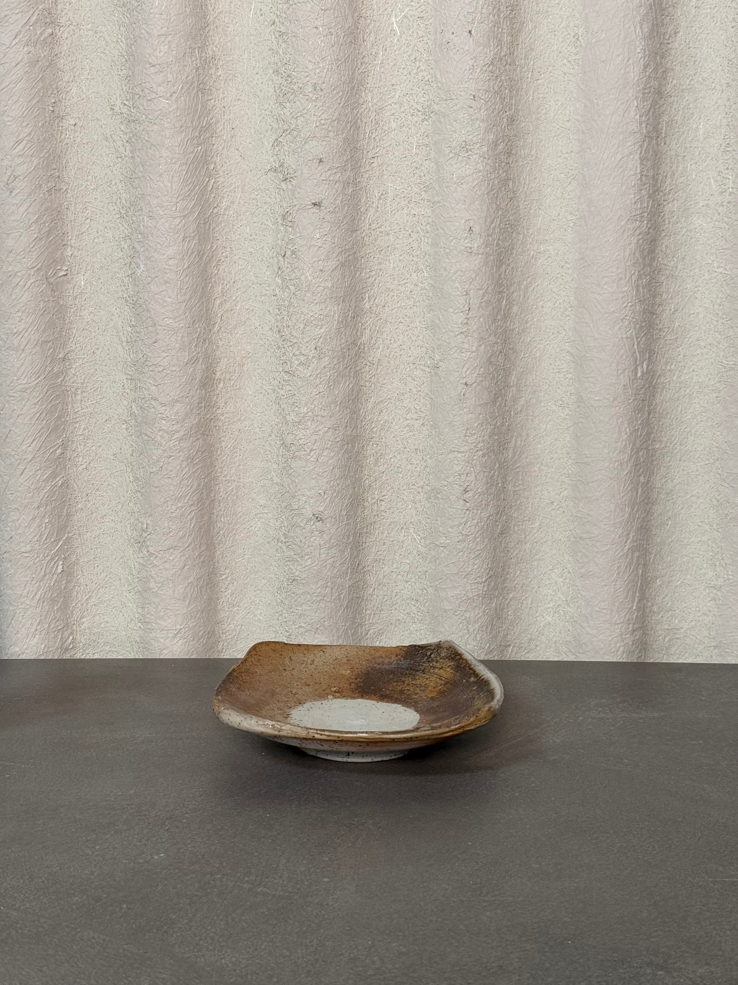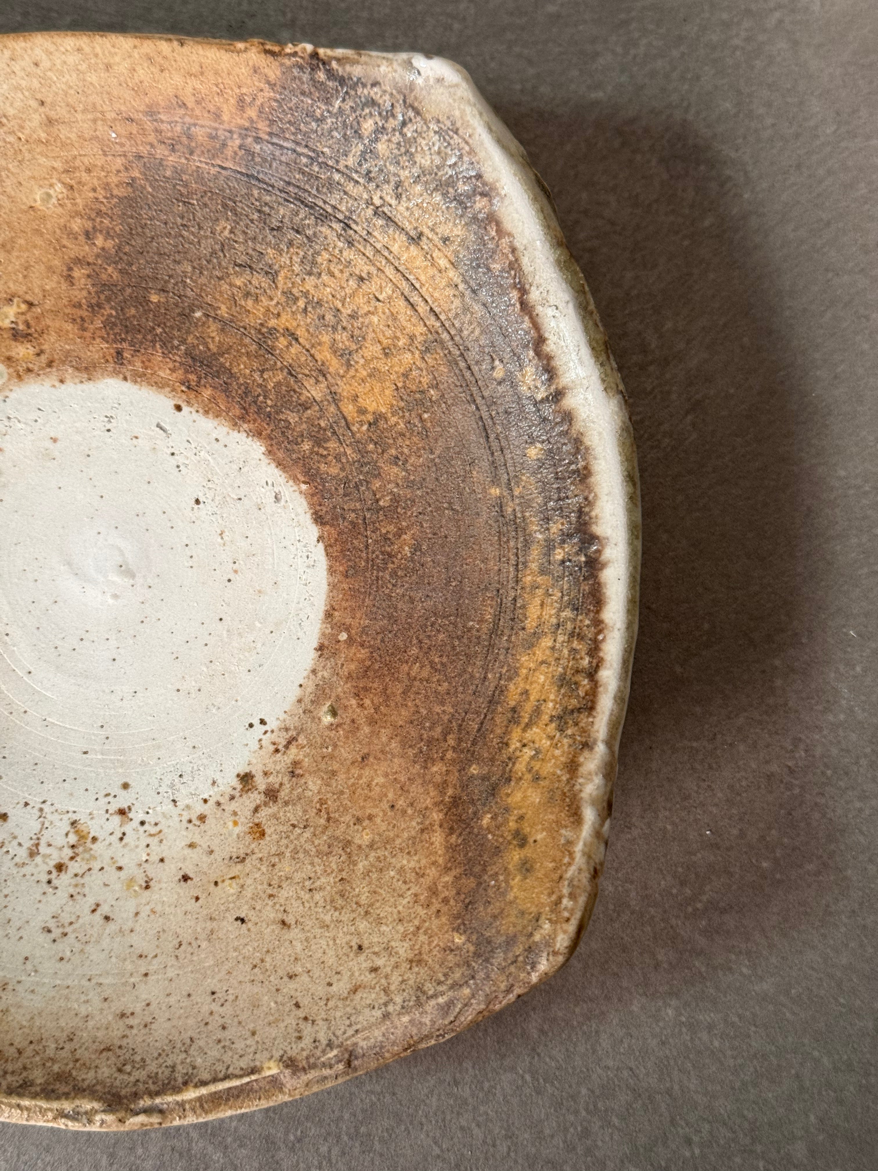 Hand-thrown stoneware tray by Augusta Pots featuring natural ash glazing and an organic, squared form. Earthy tones blend with raw texture, showcasing the maker’s refined aesthetic and functional artistry.
